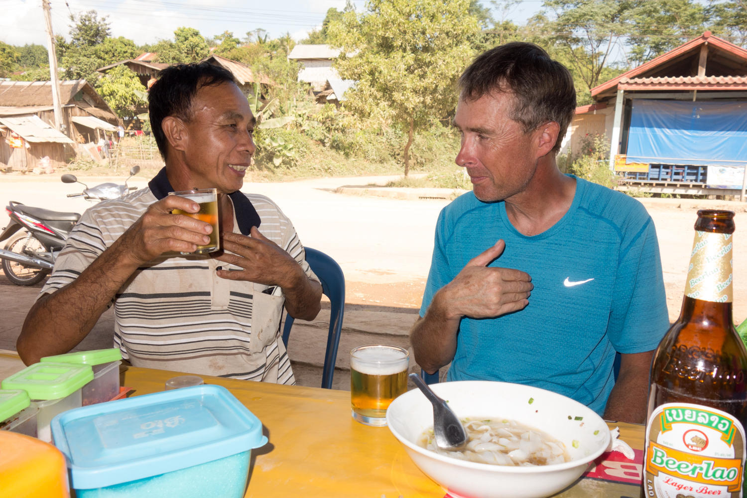 Just before Vieng Phou Kha we pass a large Chinese looking hotel. We are tempted to stop, but maps.me shows a couple more guesthouses near the river and we want to go as far as possible today. The two guesthouses across the river are both dumps. One appears closed, the other has small bamboo cottages with gaps in the floor and walls. We decide to backtrack up the hill when we see a third guesthouse on the north side of the river just after the bridge. It is much nicer with good rooms, clean and a hot shower for 80,000kip. The place is called Suy Nam Couk Guesthouse, it is behind a small restaurant, coming from the opposite direction as us you would not be able to see the sign unless you are looking over your shoulder. We get a room and go for some Pho for lunch. A friendly Lao man who has a brother in Kansas comes over to talk to us in broken English. He appears to have been enjoying Beer Lao for a while, but he explains he has six daughters and two houses in this town. He buys another beer and shares it with us.