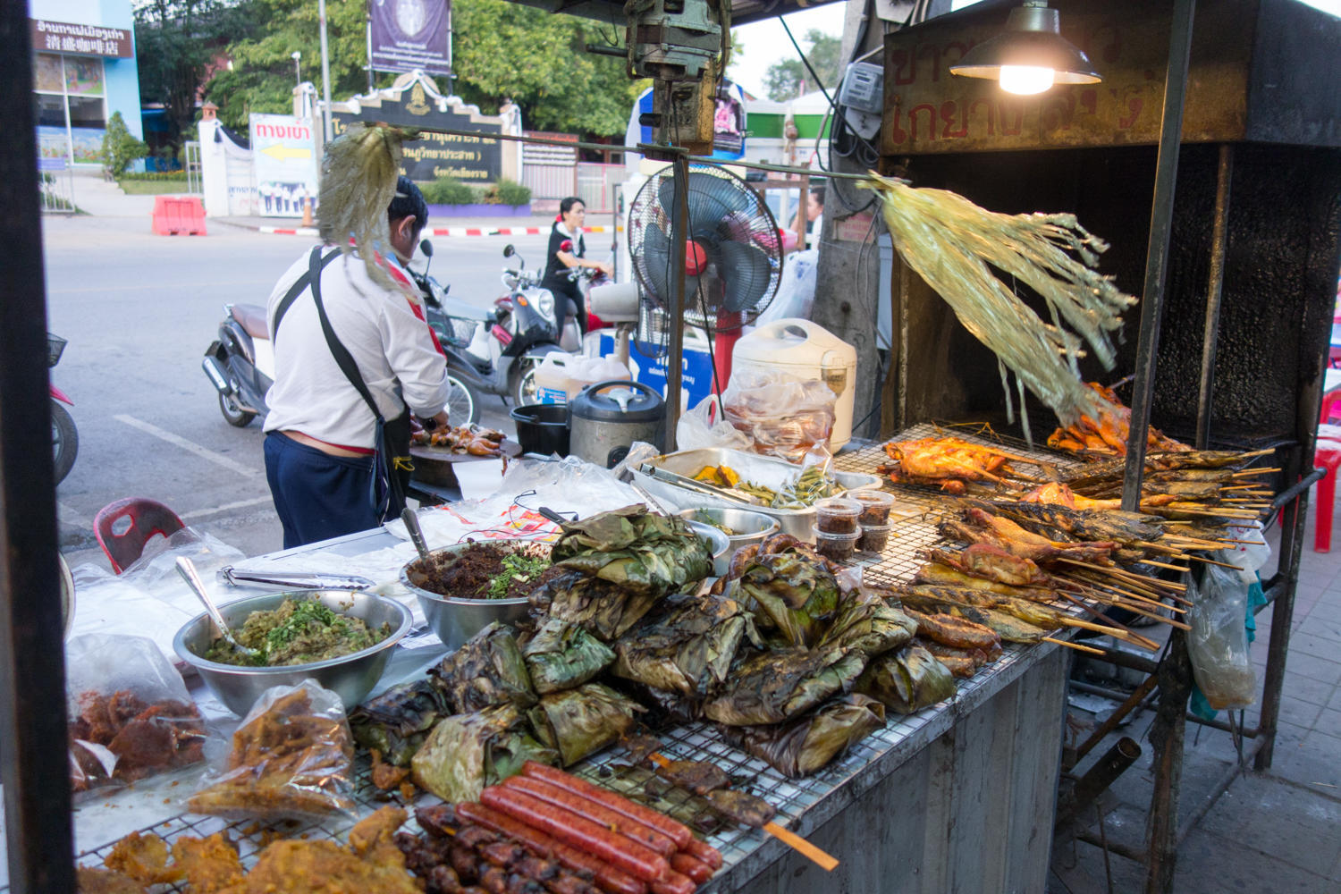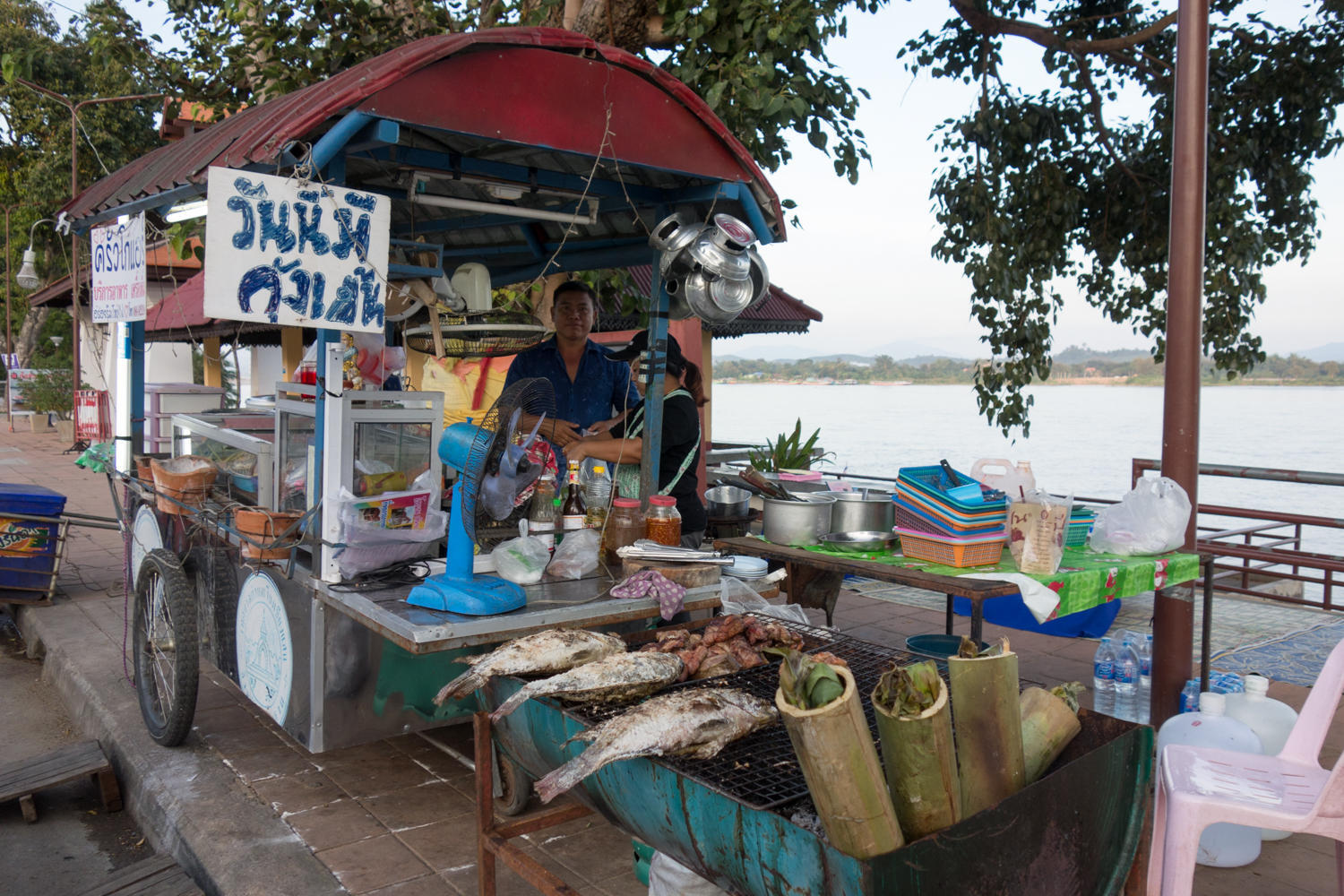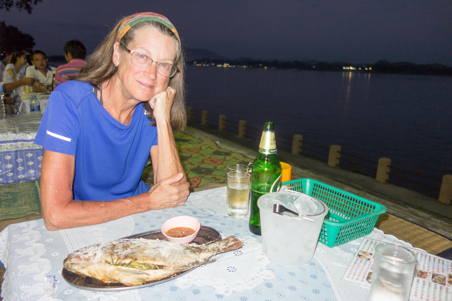The road "undulates" quite a bit, no easy cruising along the river for us. There is one particular steep and hot climb of about 300 meters vertical, then a downhill and mostly flat to Chiang Saen. We find a motel-style guesthouse for 400 bath, about 12 dollars. No more Beer Lao, we must switch to Chang, Leo or Singha. In the evening we walk along the Mekong where street vendors have set up their food stalls and have a barbecued fish, shrimp and sticky rice.