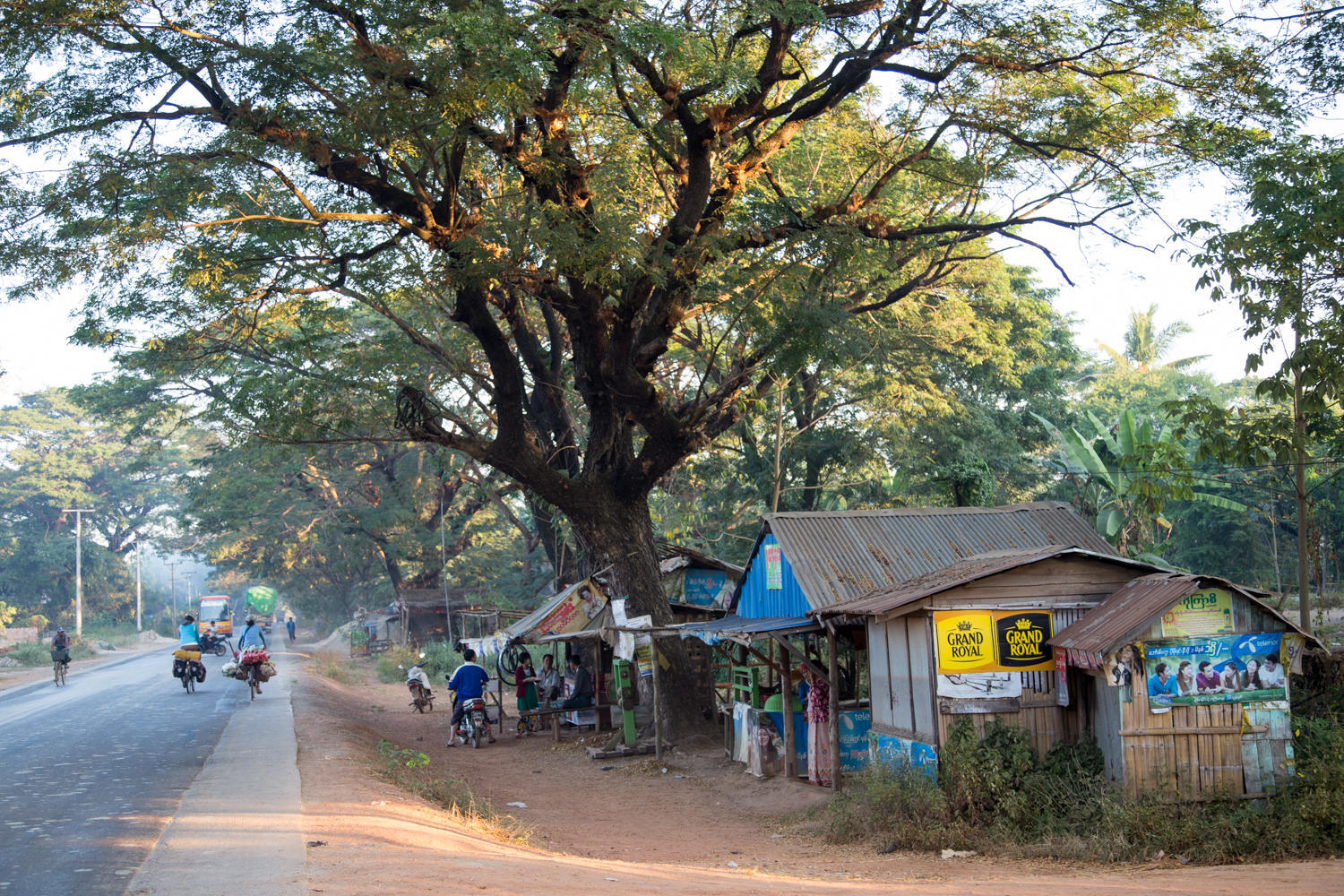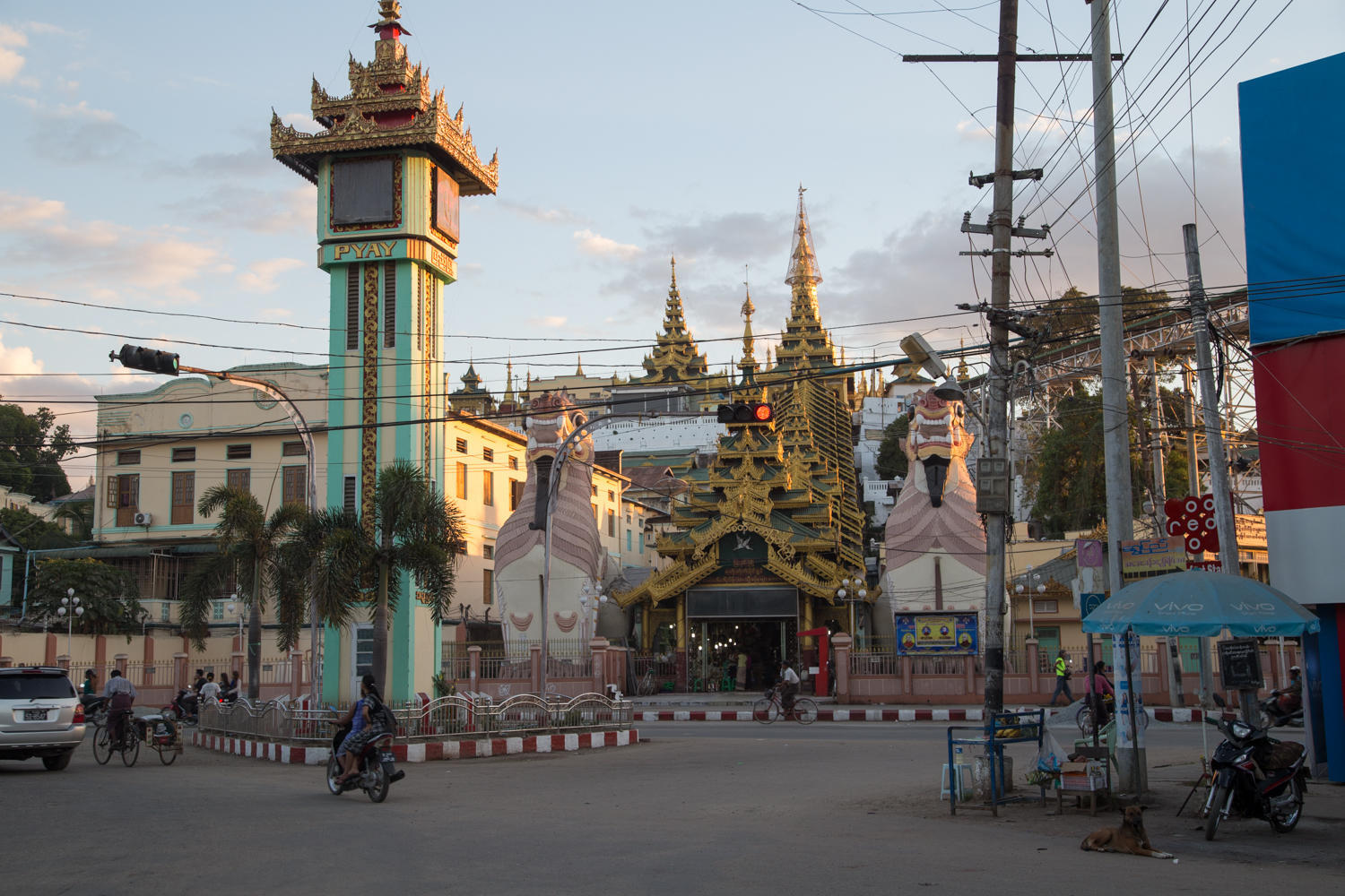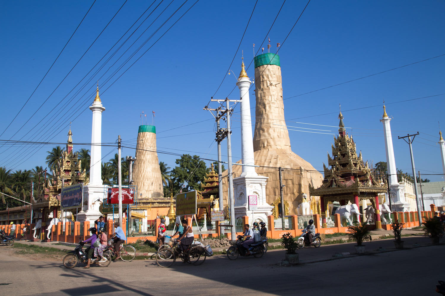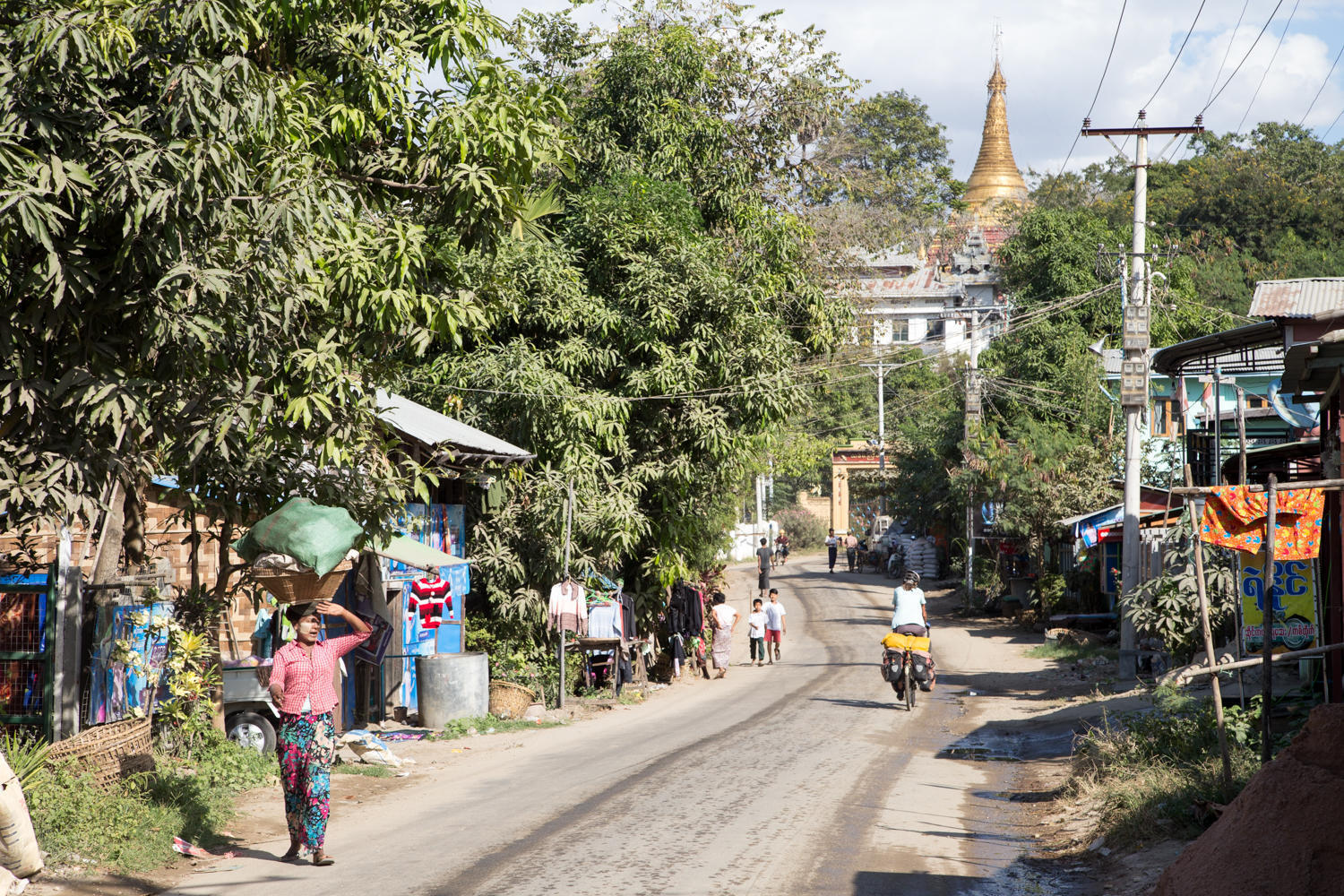 Riding into Pyay. Our guesthouse is near the bridge that crossed the Ayeyarwady River. Route 2 though crosses underneath the bridge and we have to make loop through town and climb a hill to get to the guesthouse.