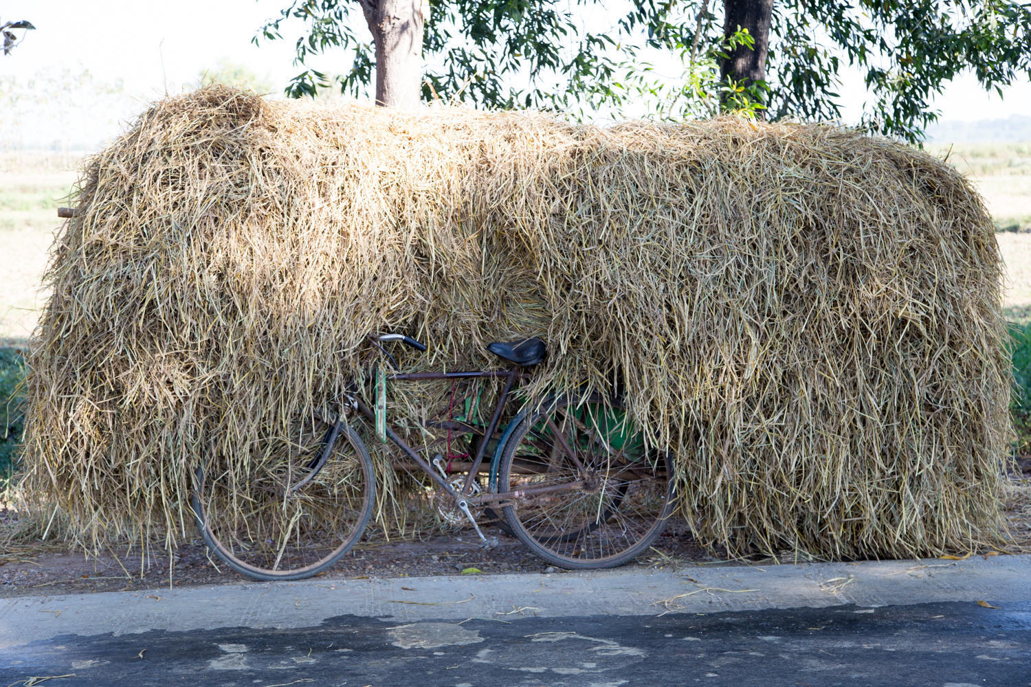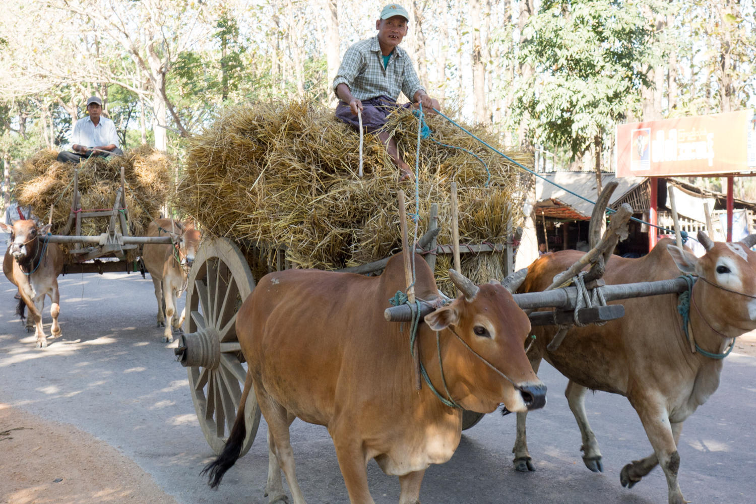 Again today most of the road is shaded by trees, good too, because the sun is strong. We saw more oxcarts, mostly transporting rice straw. People are working in the fields, some separating the rice from the straw, some loading the oxcarts.