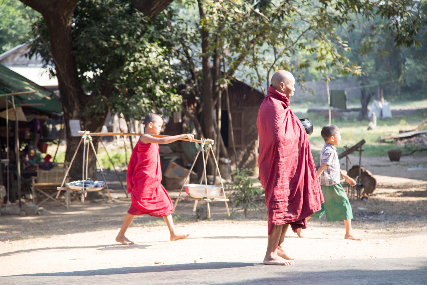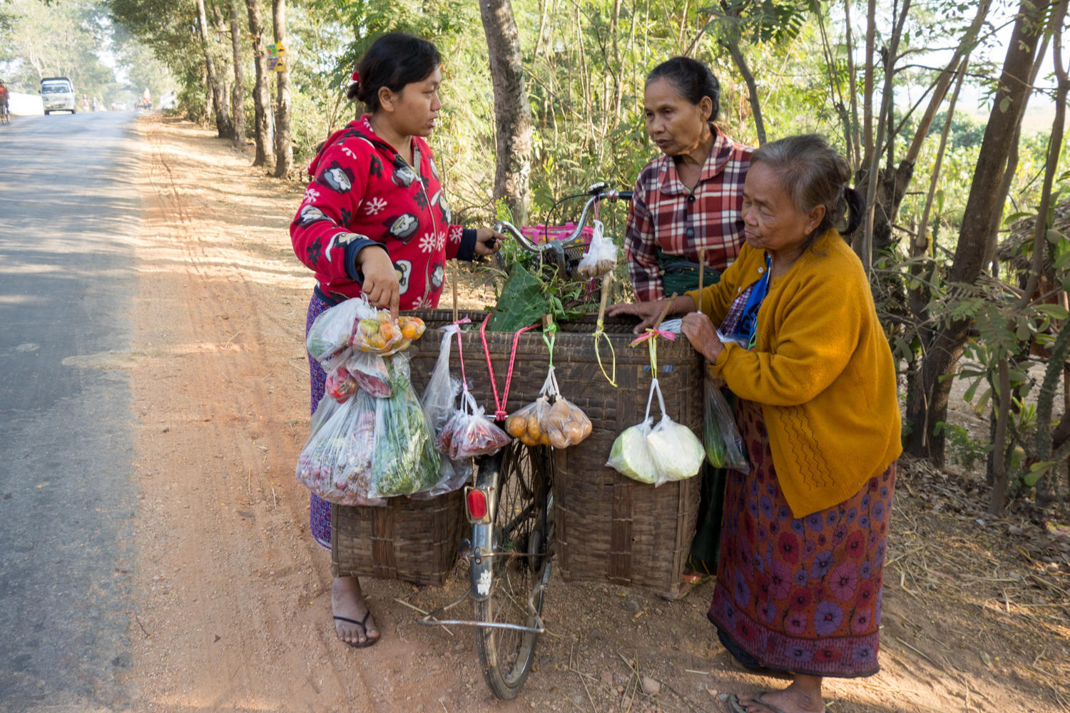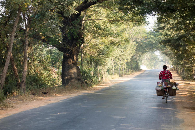 After breakfast and a friendly goodbye by the staff of the hotel, we are on the road before 8. Just as we are about to push off, the owner gives us two cans of coke. The road is much the same as the past couple of days, only we've lost the concrete shoulder. So we are back to dodging potholes and the two inch drop off to the dusty shoulder. Traffic is lighter. Agriculture has changed as we see sugar cane and peanuts. At just about every stupa and temple we pass by there are lines of women shaking offering jars for donations. Some sort of fundraising is going on.