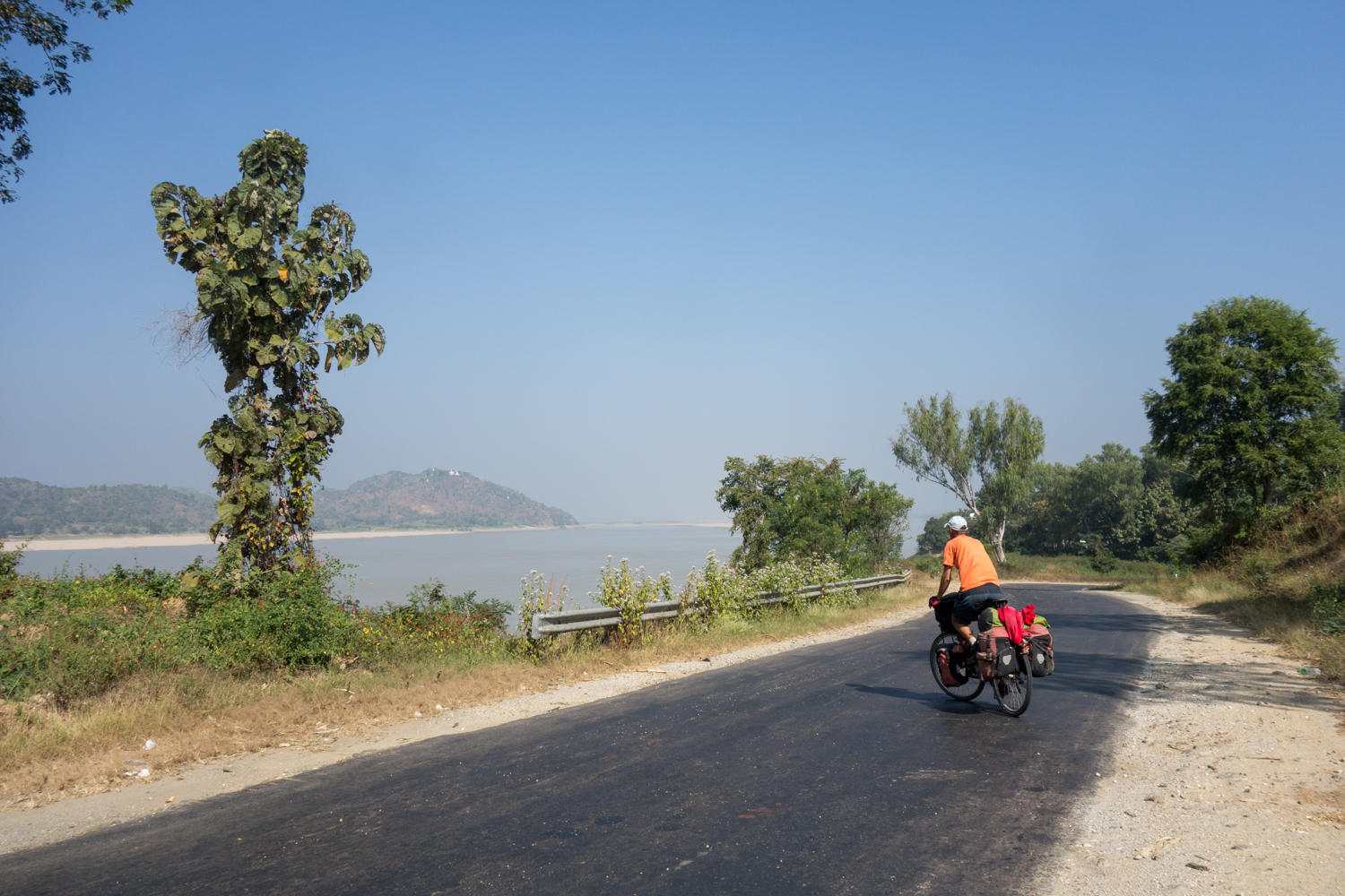 After the road meets the Irrwaddy River again, the road becomes more undulating. We arrive around 1pm and check into the Win Lite Hotel. After cleaning up we walk to a "Chinese" restaurant about 4 blocks north from the hotel on the corner. We return later again for dinner. We have a "deluxe" room with AC and a television and discovered we have HBO!