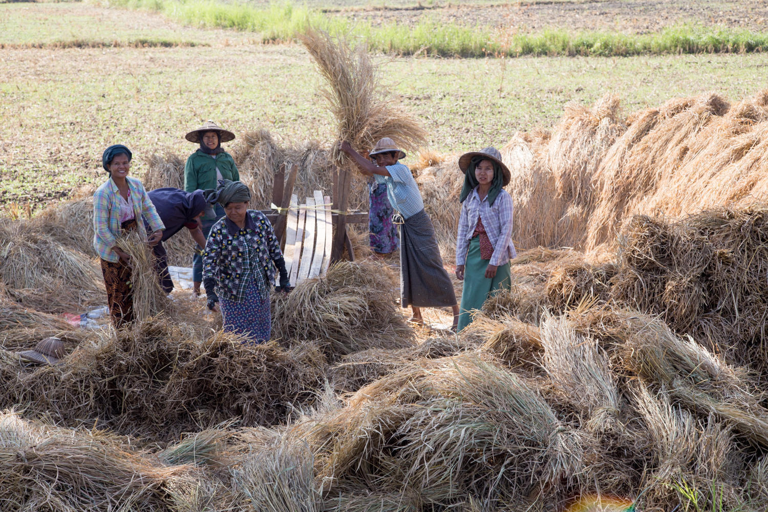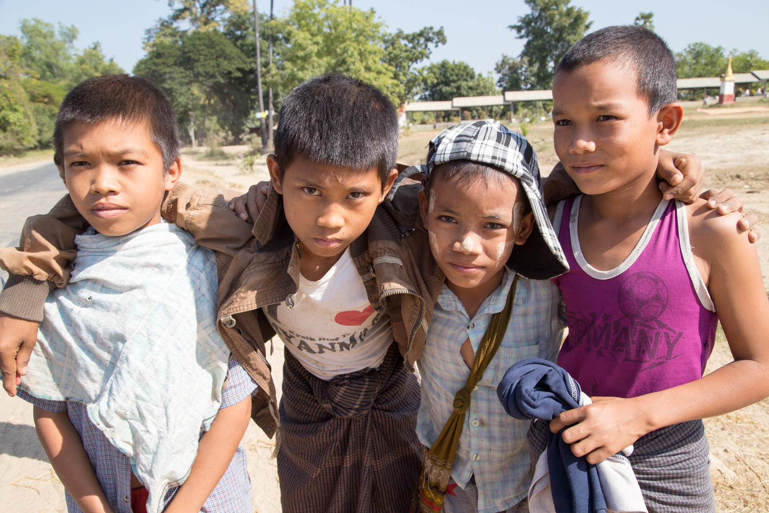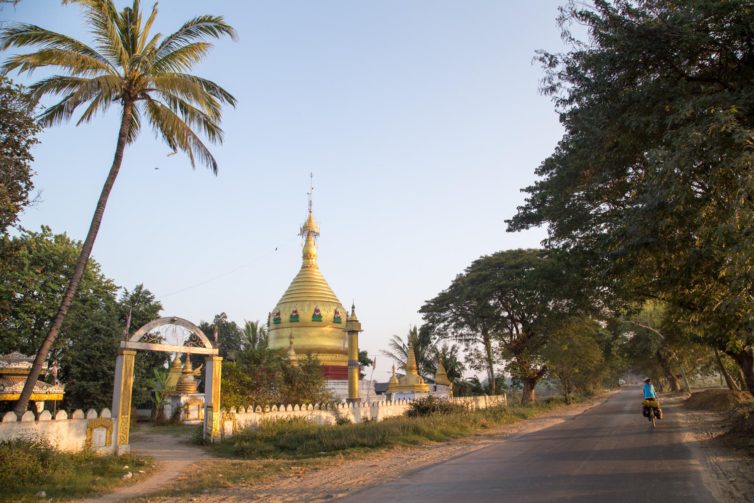 We climb about a hundred meters and the landscape changes abruptly, gone are the farms. It seems a lot dryer and sandier up here, there is lots of dry scrub brush and grass. One section is on fire. And trees no longer line the road. The wind is fairly strong today, fortunately not against us. We have a couple of ups-and-downs, then flatter and the trees return into Taungdwingyi.