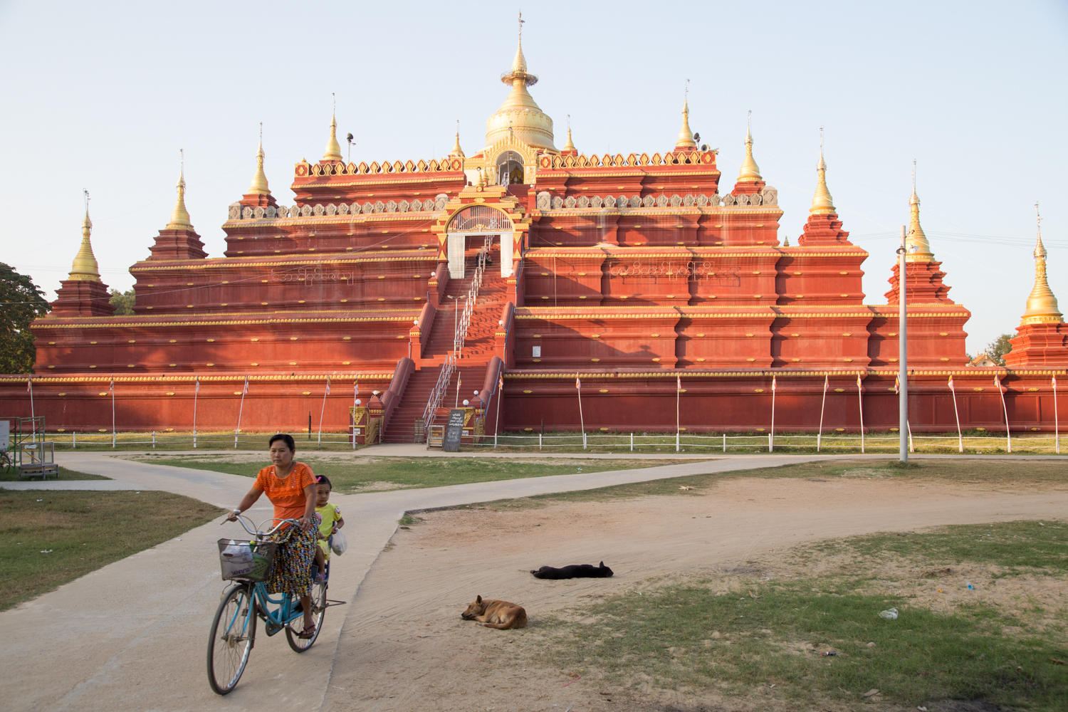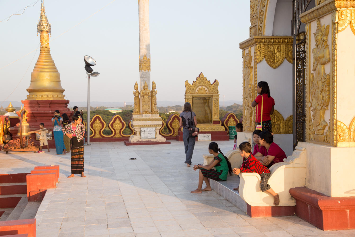 Just before sunset, we walk over to an impressive, but new, pyramid/stupa just down the road. It looks nice from a distance, but the quality is not quite like the "old stuff", yet gives a great panoramic view of the surrounding area.