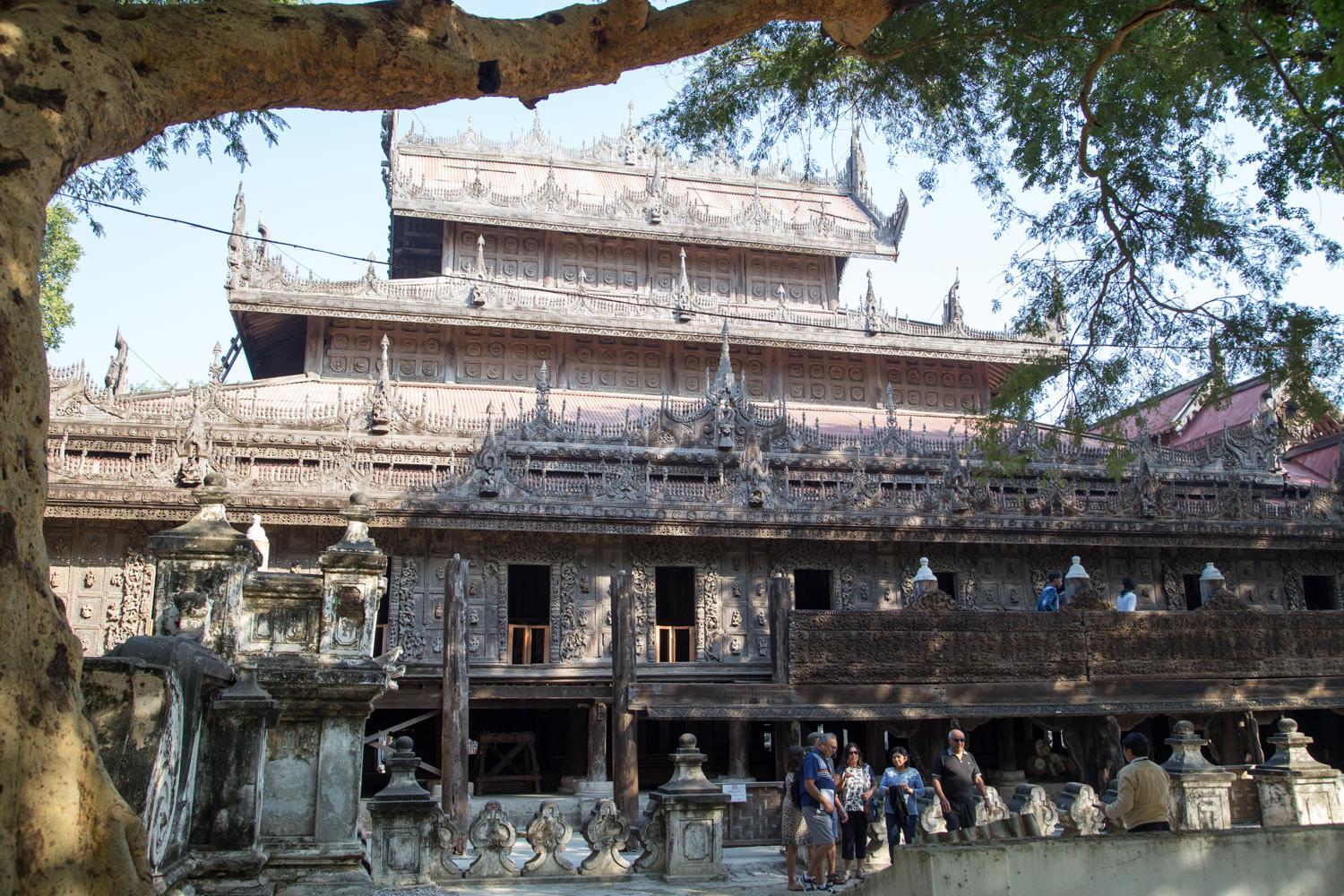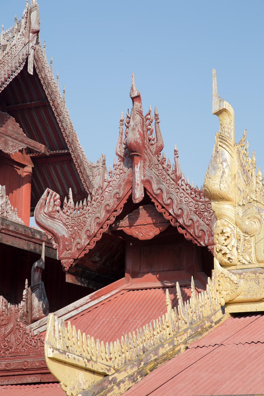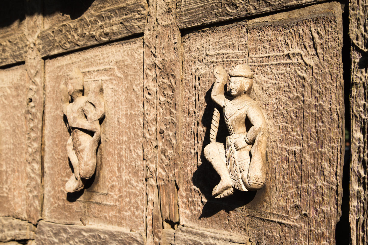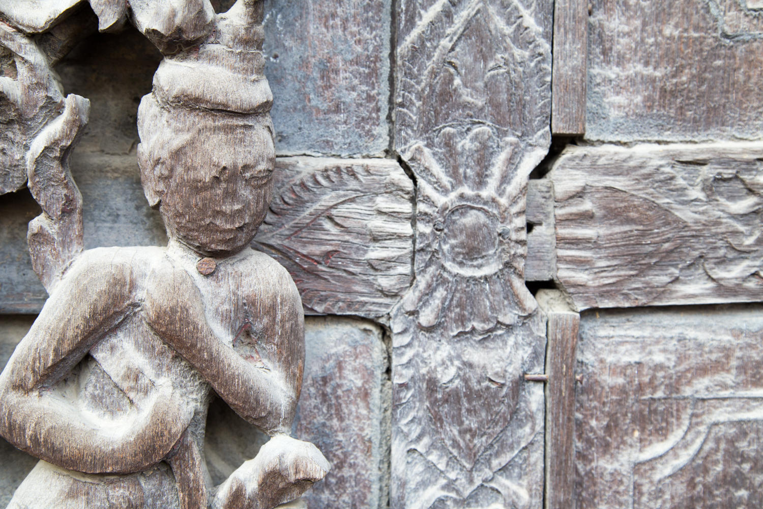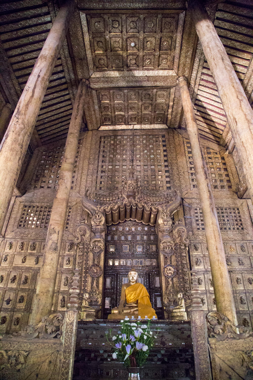 The construction of the wall panels of Shwenadaw Kyaung is awesome. Housed mortise and tenon connections, pinned together with wooden dowels that are barely visible in this photo. The exposed teak has weathered to a grey patina. Too bad many of the newer carvings are attached with nails and sheetrock screws.