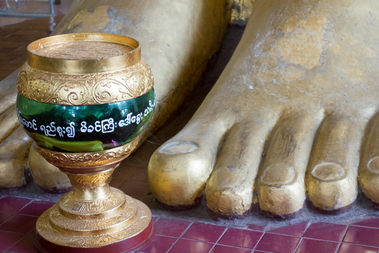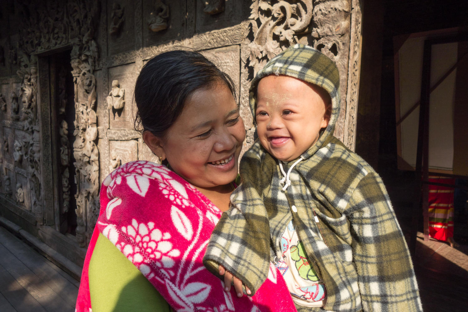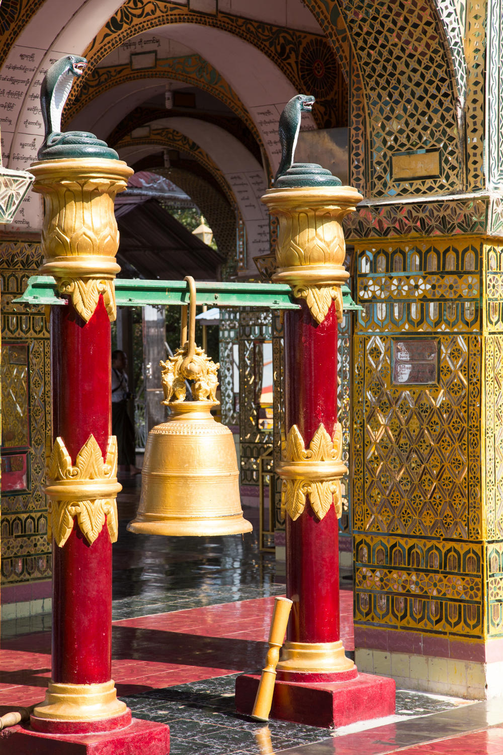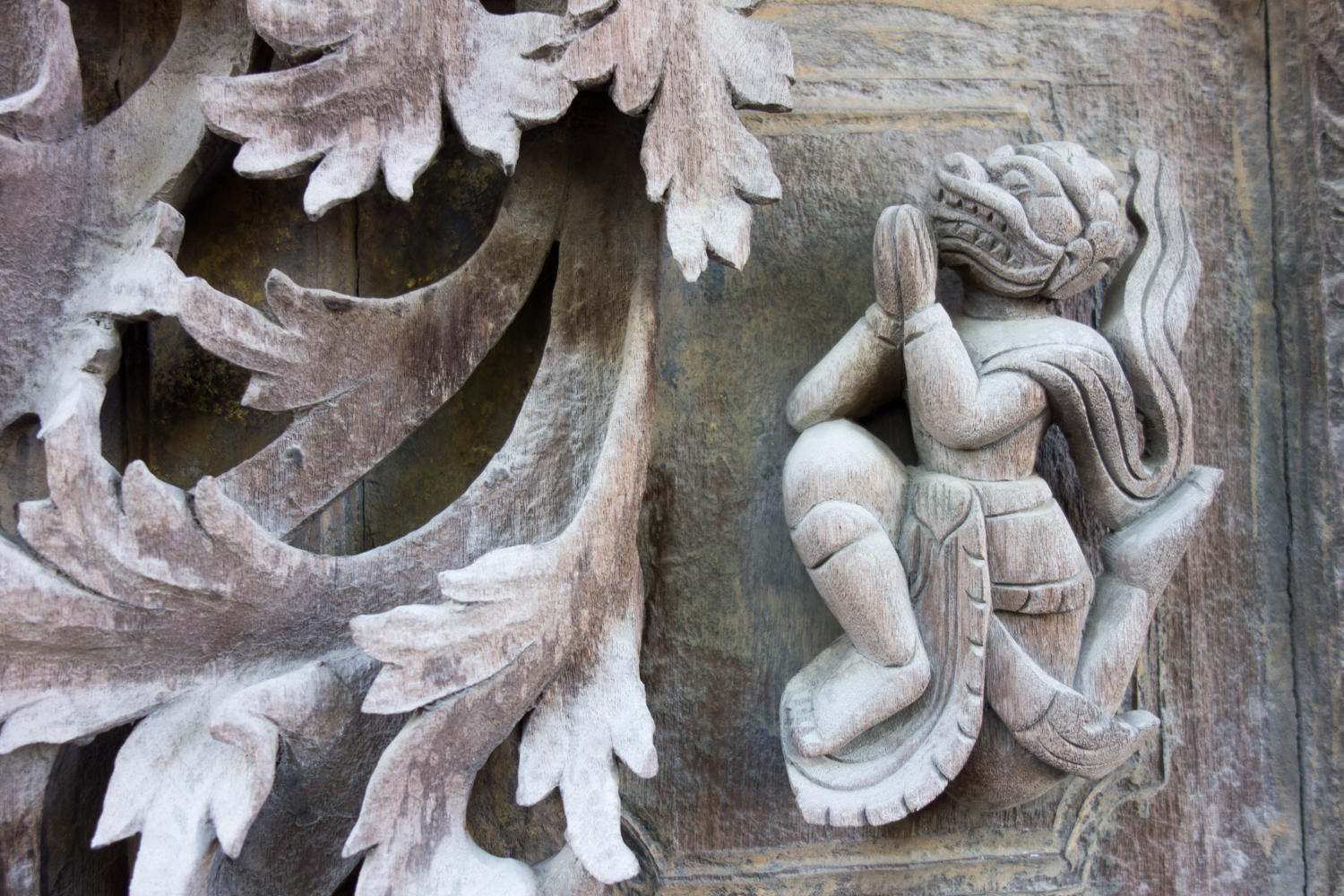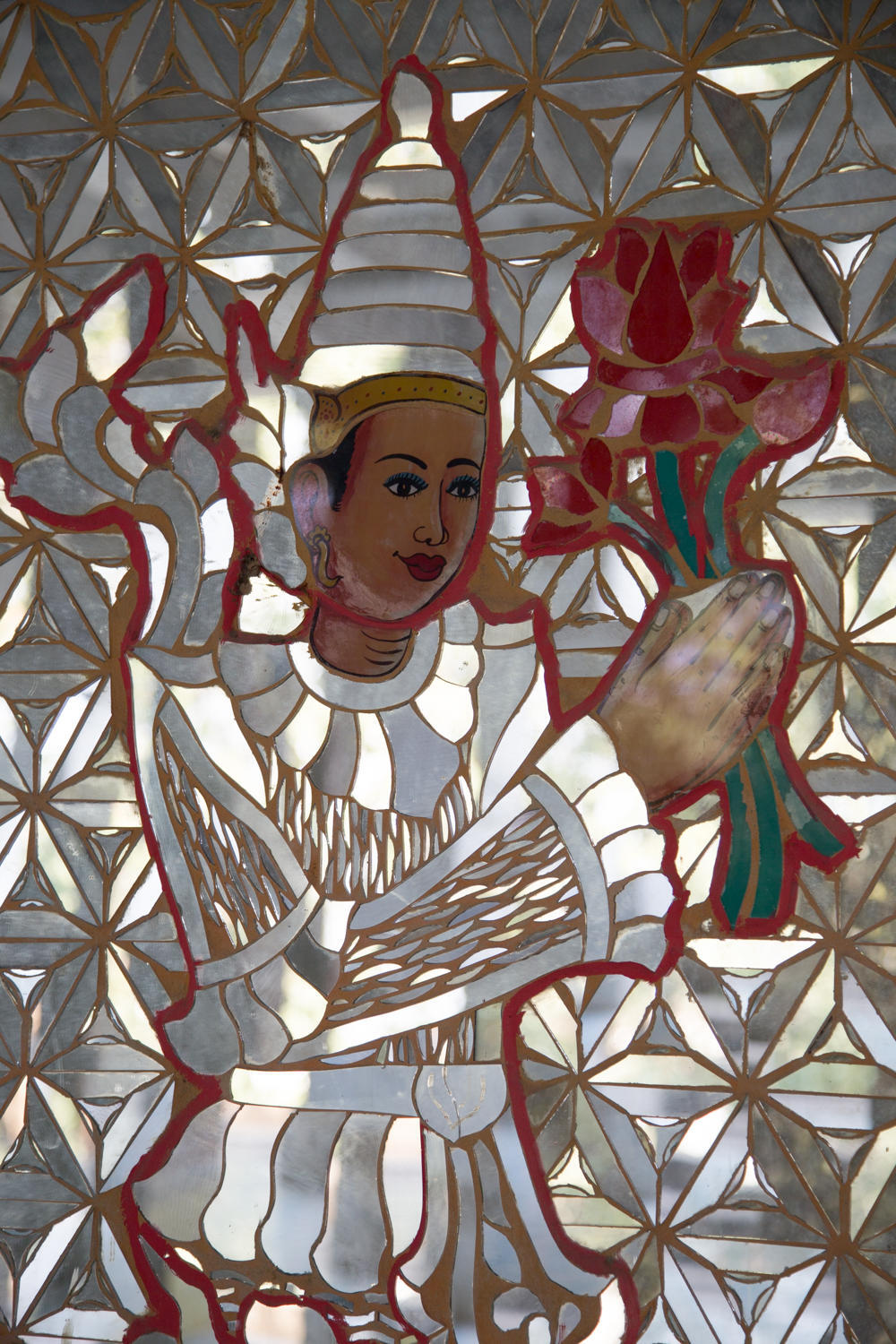 The construction of the wall panels of Shwenadaw Kyaung is awesome. Housed mortise and tenon connections, pinned together with wooden dowels that are barely visible in this photo. The exposed teak has weathered to a grey patina. Too bad many of the newer carvings are attached with nails and sheetrock screws.