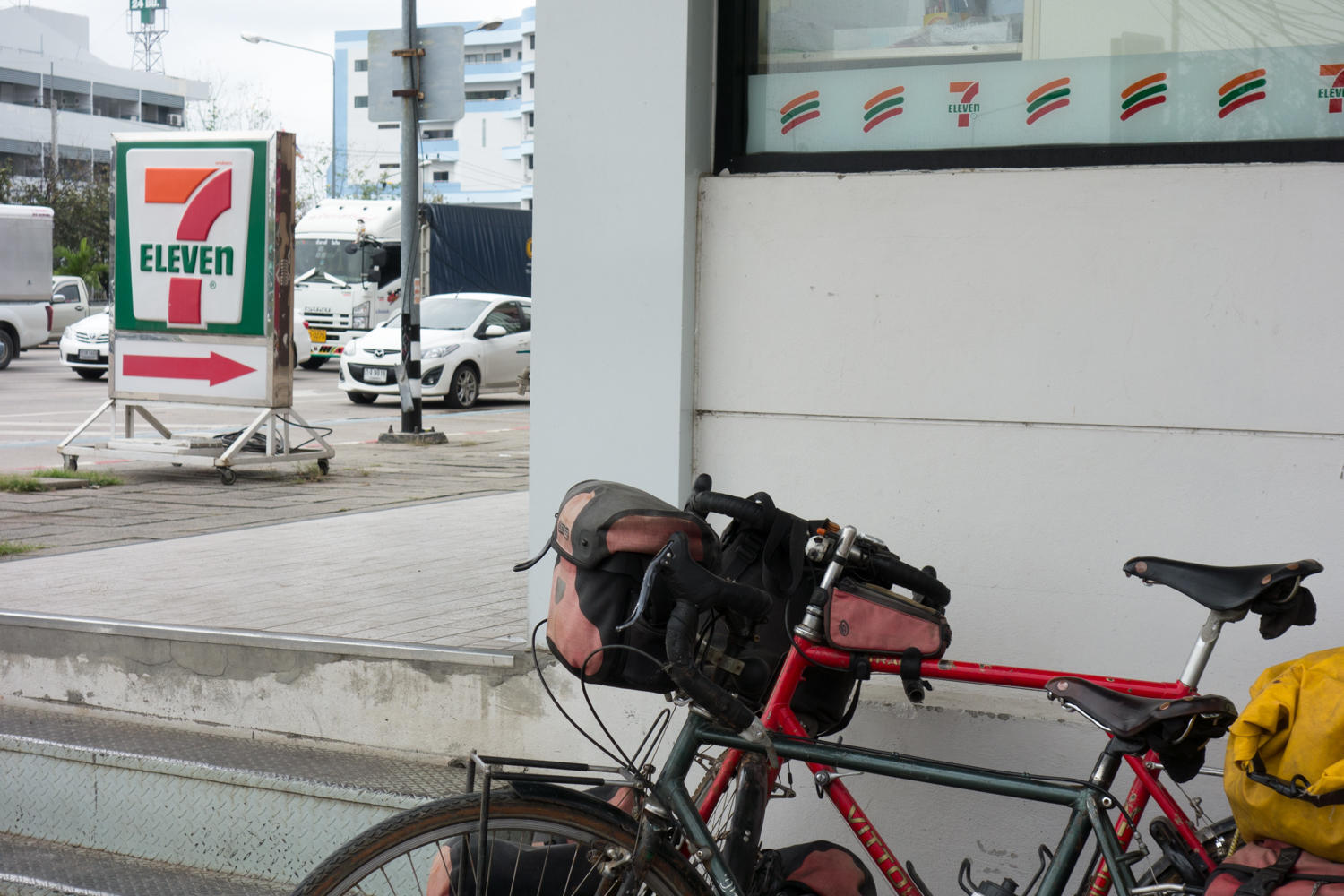 We ride into Mae Sot looking for a restaurant and some good food. We come across "Famous Ray Restaurant" and have a nice lunch, meeting an Italian cyclist on an unloaded touring bike. He is heading into Myanmar tomorrow and has made contact with Smile Angel in Kawkareik. We are sorry to not have met her in person. We share some information and suggestions about routes. Then continue to the minibus station right in the center of town. A mini-bus is almost full so there is little waiting, our bikes go on the roof and off we go for another 85km over two big hills with lots of road construction. At 2:30 we are back at the bus station in Tak where we departed four weeks ago. We pick up cold chocolate milk and snacks at a 7-11 (Patrick had been craving cold chocolate milk) and head back for the hotel we stayed before and where we had left gear we knew we wouldn't need in Myanmar.