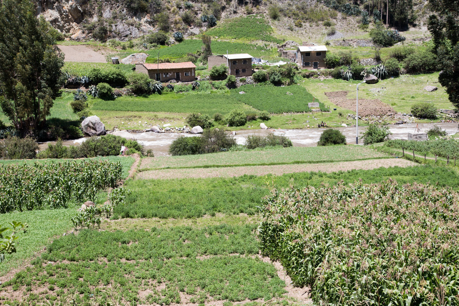 The ride today is about losing elevation to 3100 meters and turned out to be mostly downhill but not without a few hills. Those hills seemed bigger today since this is the seventh day of cycling without a rest day. We start out in fog and hope that we will see the mountains sometime during the day as we follow the Rio Santa downstream. And we are rewarded. The mountain peaks slowly revealed themselves and we have great views.