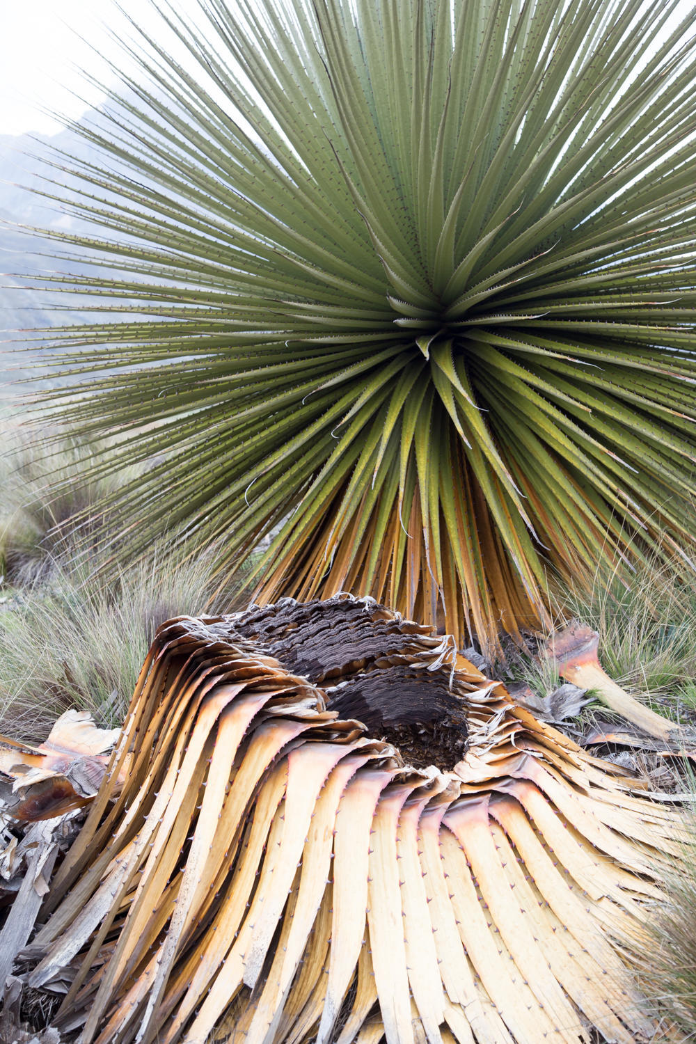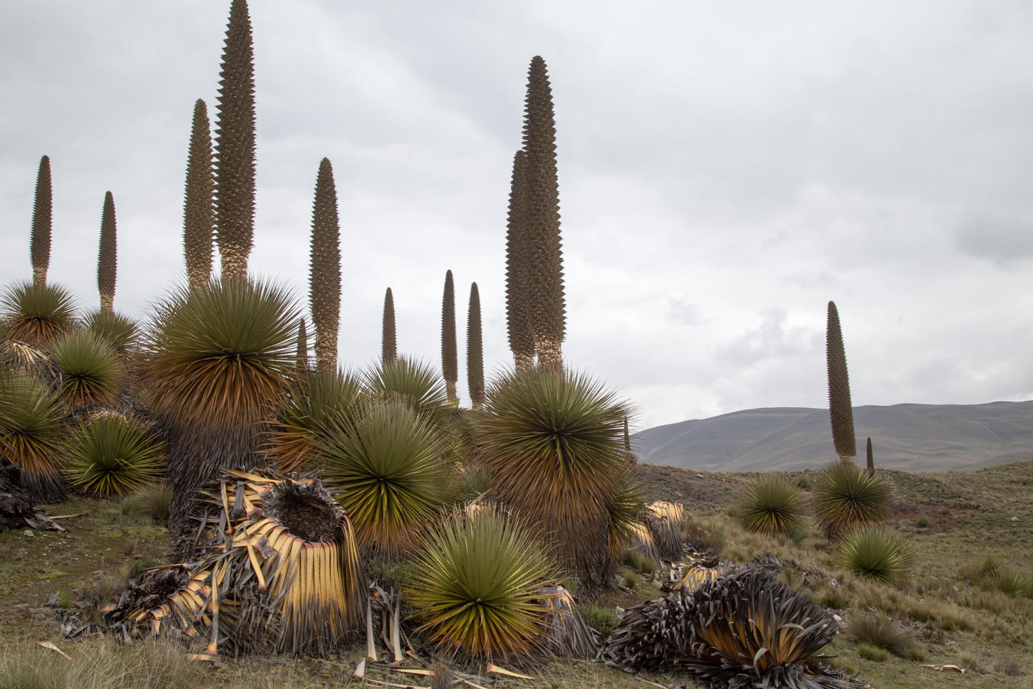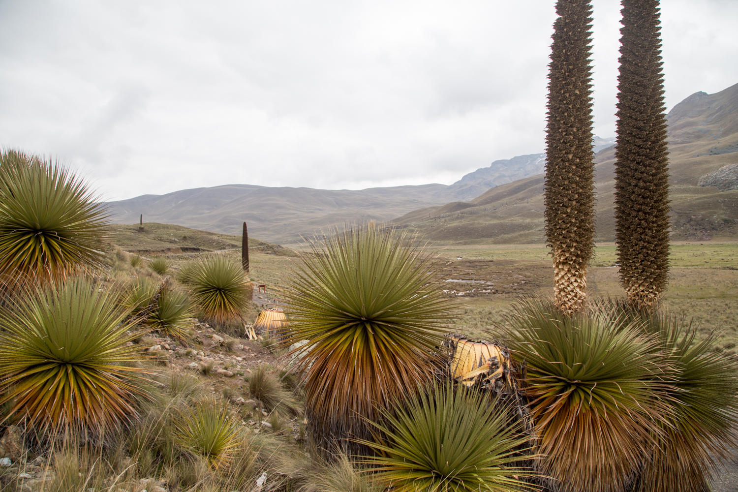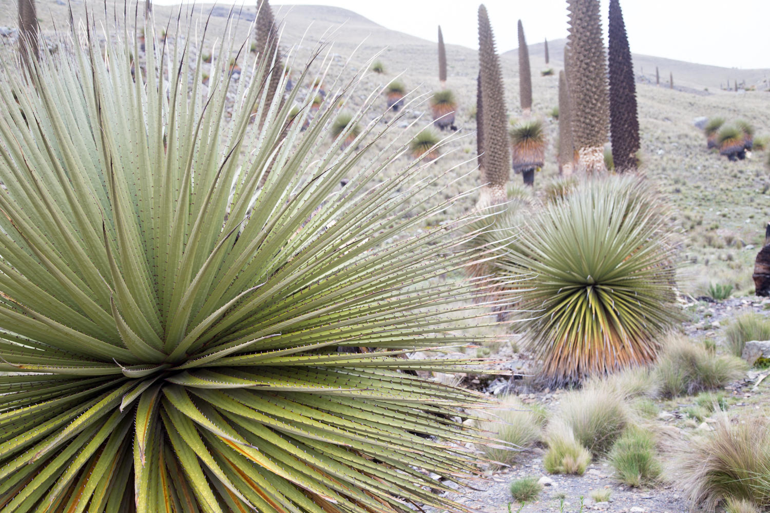 We leave the paved road and start climbing on a rough graveled road. Along the way we stop to see close up the Puya Raimondii "Queen of the Andes", the world's largest bromeliad this plant has a flower spike that can reach 10 meters tall. A member of the pineapple family, it is an endangered species and the plant dies after flowering.
