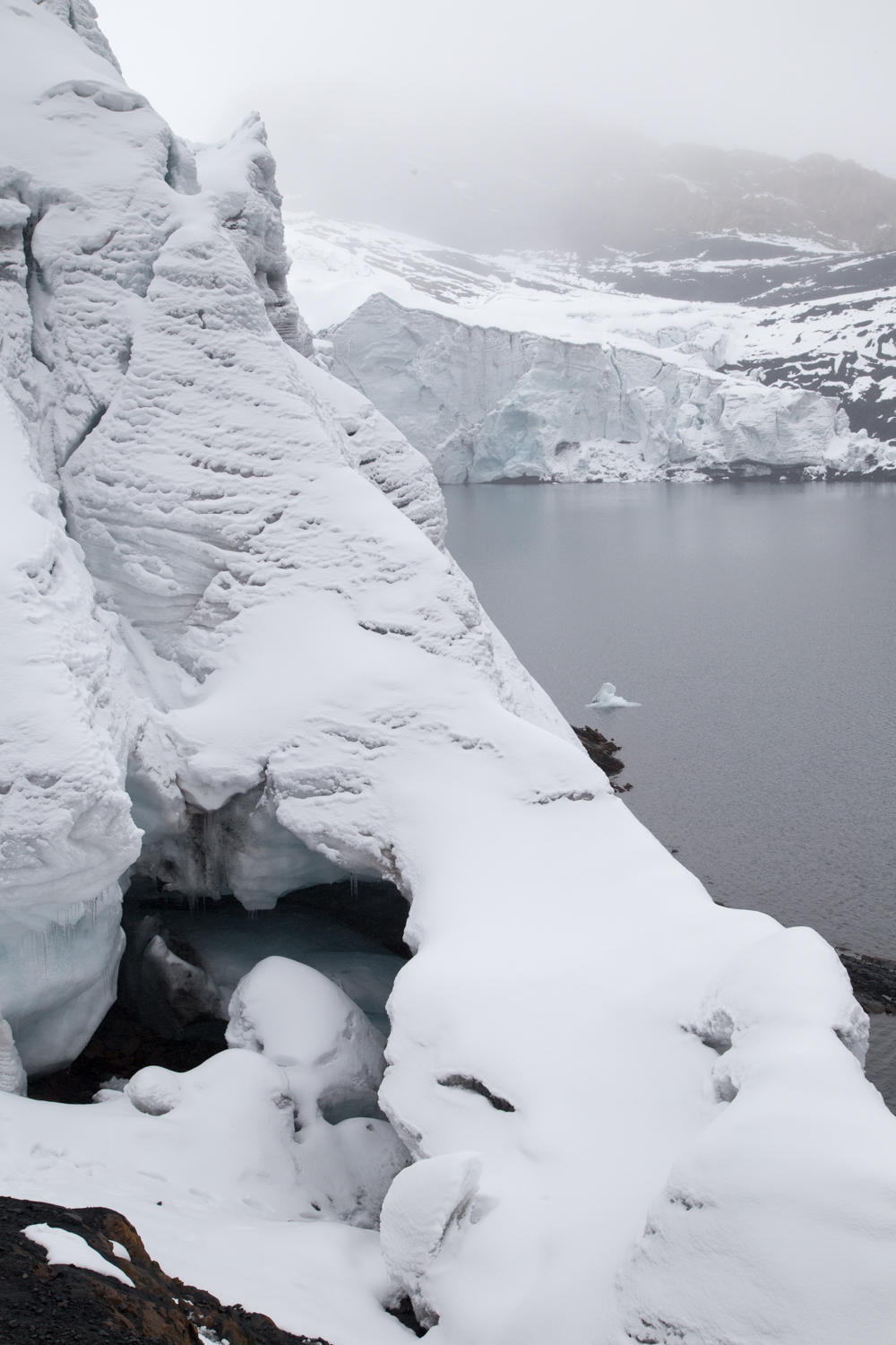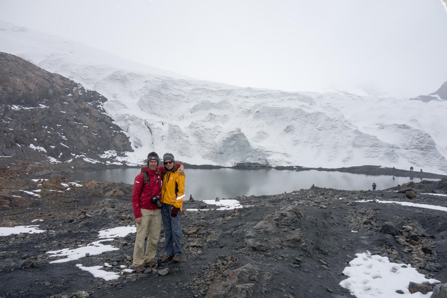 The drive continues up the valley then climbs up Pastoruri Glacier. The glacier has been retreating and now takes a 45 minute walk on a rock and concrete path to the edge. For those who don't want to walk, there are gaucho's on horse ready to take you on a horse. As we hike up clouds move in and it starts to sleet turning to snow. Even though we do not have the beautiful mountain vistas today the stormy weather creates a special atmosphere here at the foot of a large glacier.