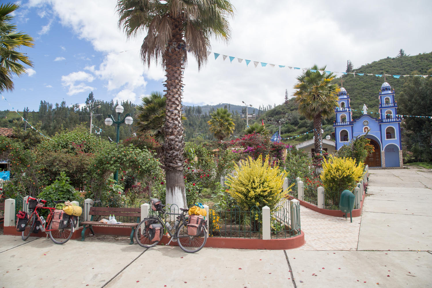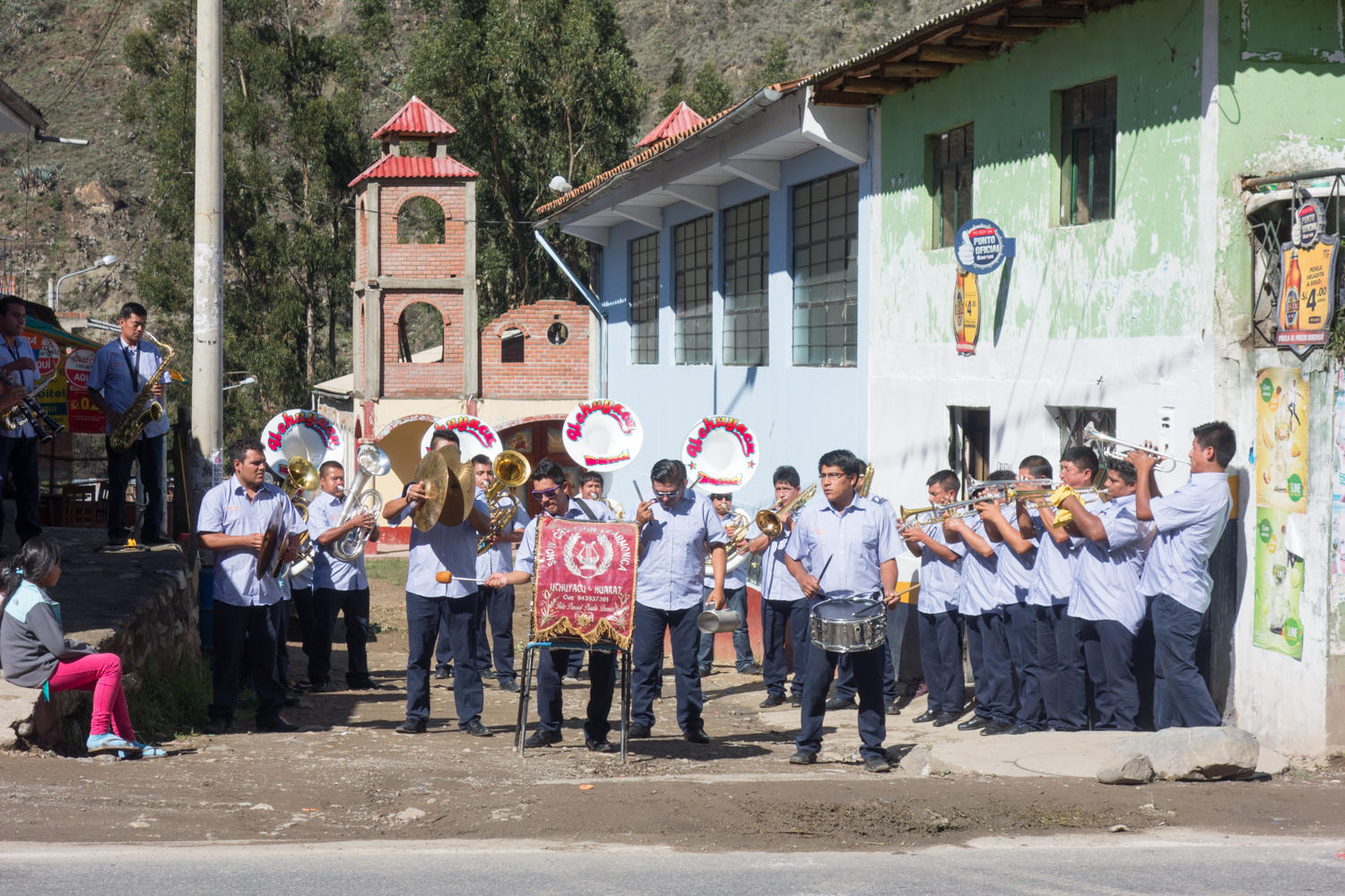 As we go through small villages, many have beautiful parks creating a Plaza in front of the church. Churches are double spired and some beautifully painted. We stopped for a food break in a park front of one blue church. We hear music for awhile, people walking by stop to shake our hands, one father wanted a picture of his daughter with us. In another village, a band played along the side of the road, we stopped to listen for awhile. The road improves after Carhuaz, and traffic lessens after the junction to Huascaran National Park.