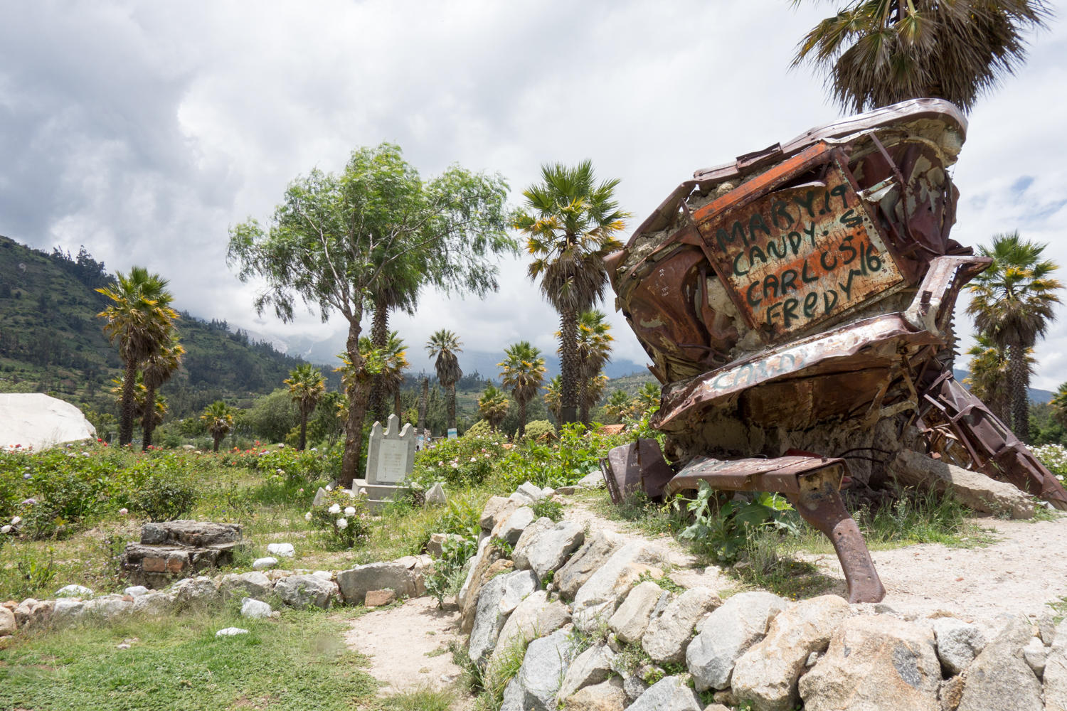 Near Yungay is Campo Santo, a memorial park on the site of old Yungay where 20,000 people were killed by a landslide off Huascaran Norte after an earthquake in 1970. We arrive in Yungay just after noon.