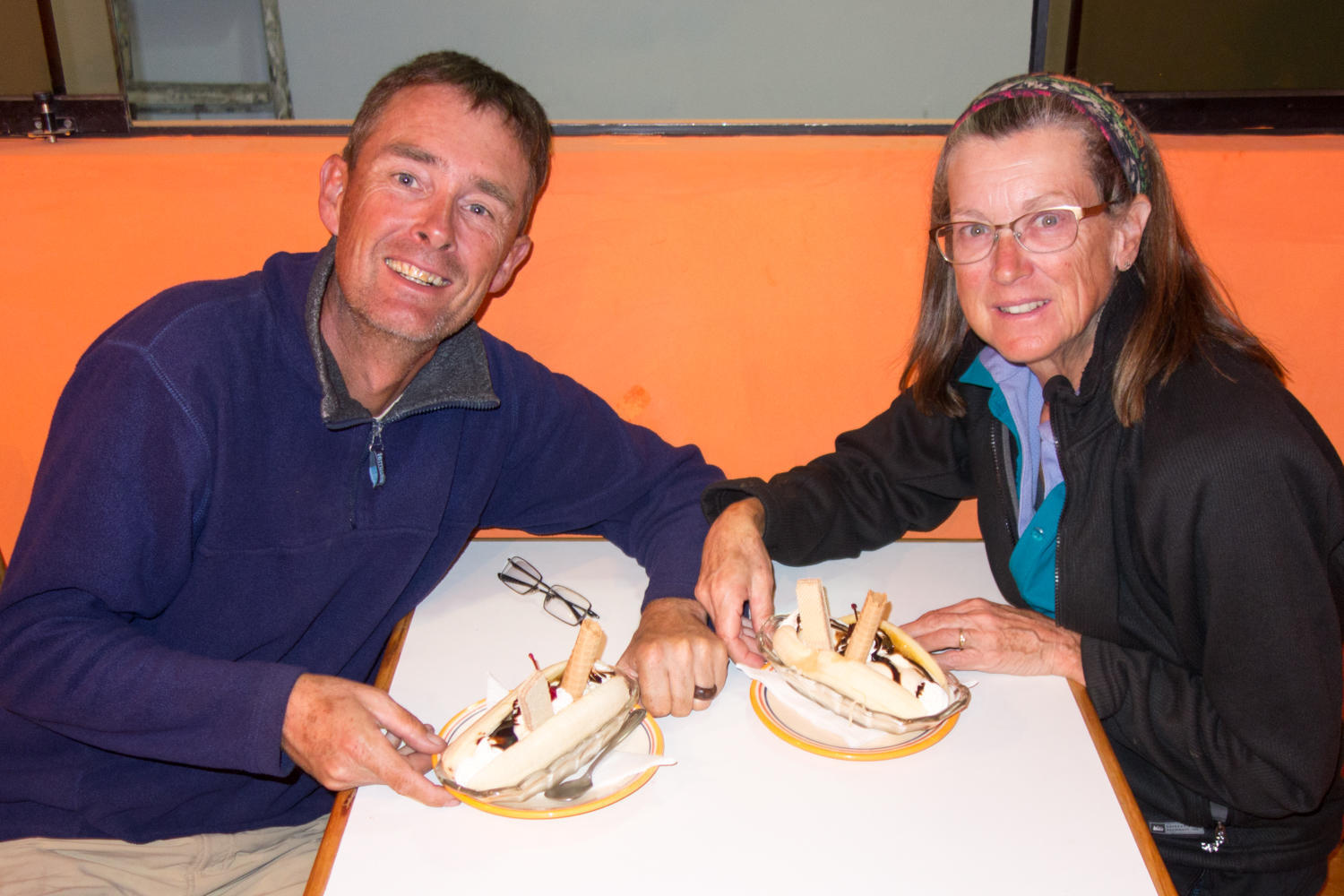 Just one block north of the Plaza is a street with at least half a dozen wood-fired-pizza places where we find our dinner, topping it off with each of us have a huge banana-split at the Dutch-run Heladeria Holanda. The owner comes from Limburg and has been here 22 years. He has some good route advice for us too.