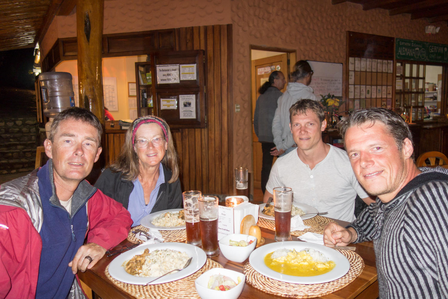 For dinner we meet up with Dylan and Lawson Reid, the Australian brothers riding motorbikes we met at the border yesterday. We take a taxi to the German restaurant about two kilometers south of town. The hotel here seems like a very nice place to stay and it is reasonably priced. We go for the German "spatzle stroganof" and some nice locally brewed beer. A nice evening with fellow travellers.