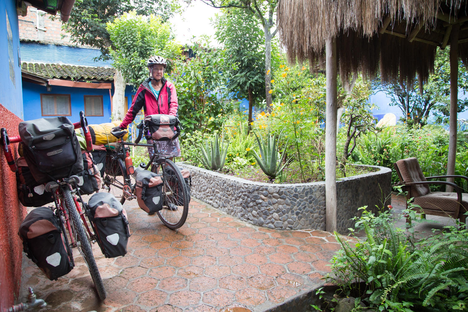 We pack up and load our bikes and wait for the 8am breakfast to be served. On the way out of town, we stop again at the French bakery for bread. Rachel is watching the bikes when an American retiree passes by and starts talking. He is from Michigan and spends winter is warmer climates. Patrick returns from the bakery, no bread, but another couple of very nice cinnamon rolls. Then we are on the road for our first day of cycling tackling a 250 meter climb.