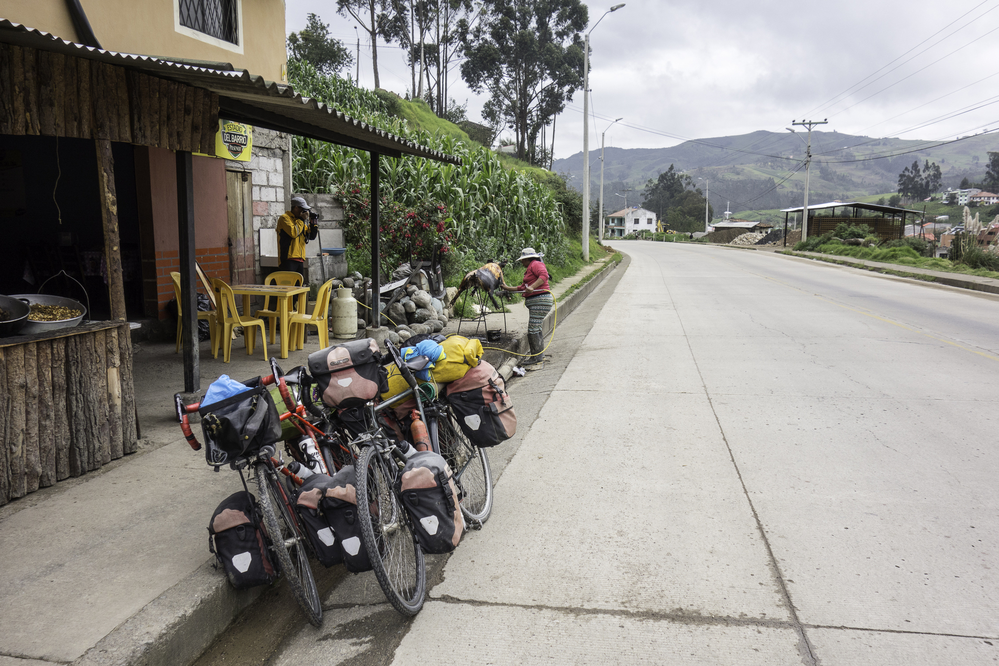 There are nice views over the green valleys on both sides of the road. We stop just past Cumbe and find a nice second breakfast with real coffee at a small restaurant. The owner speaks English. We add our own salami and cheese to the egg sandwich.