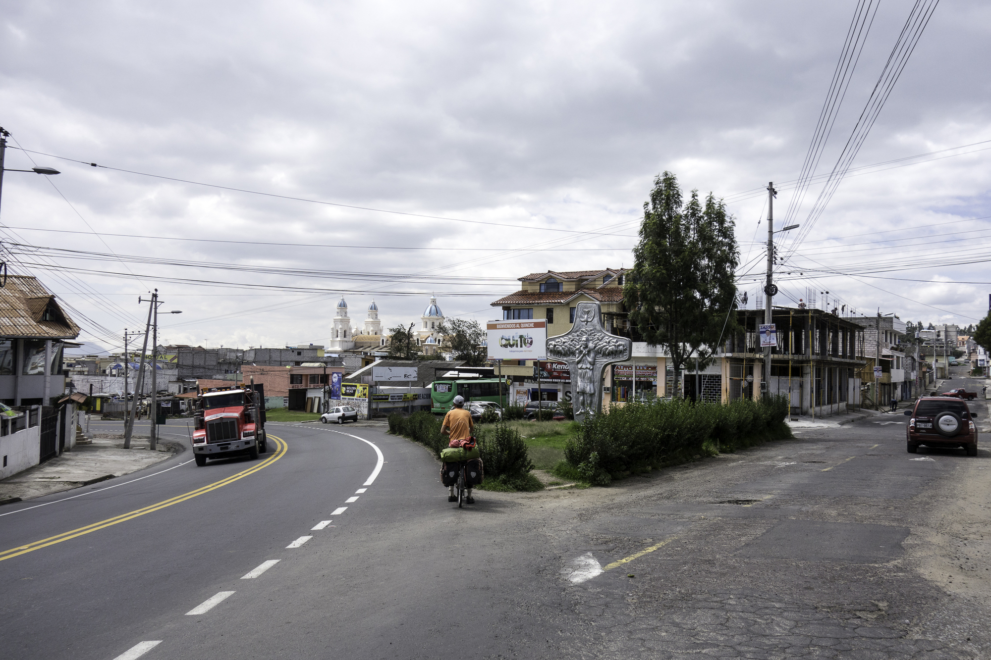 We reach a junction where we turn eastward, headed towards the airport. The road reduces to a two-lane highway with narrow shoulders. Traffic only increases. Not much fun, but probably better than plunging into the city center. Traffic finally gets lighter when we turn again on a nice new four lane highway towards Pifo. There is a hotel in Pifo and at the junction, but we decided if we just went another twenty kilometers today we can reach Otavalo tomorrow. The last ten kilometers to El Quinche are a tough uphill climb with a couple of short steep downhills to cross rivers. We are pretty much done in for when we reach El Quinche.