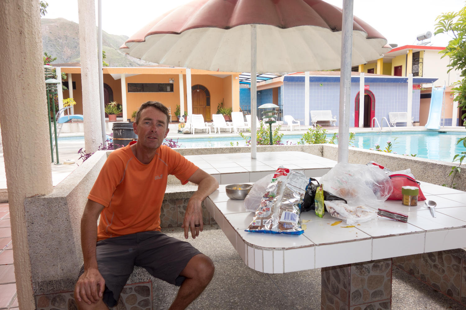 The green fields are replaced with either dry scrub land or fields of sugarcane. The last 10 kilometers or so are uphill, with a fierce headwind we struggle to get to our destination. Just before the town of Ambuqui, along the Pan American highway is a string of mini-resorts with swimming pools and water slides. We pick the Hosteria Aruba, the rooms are a little tired, but there is a nice outdoor seating area and a pool right outside the rooms.