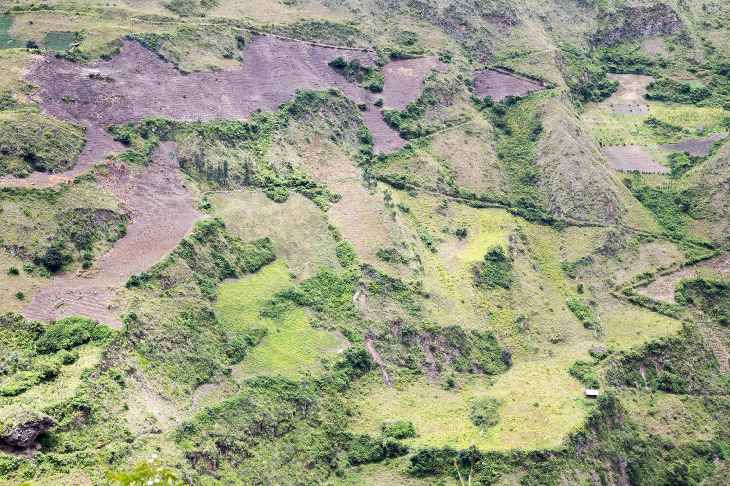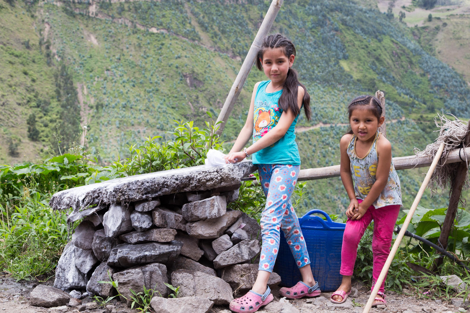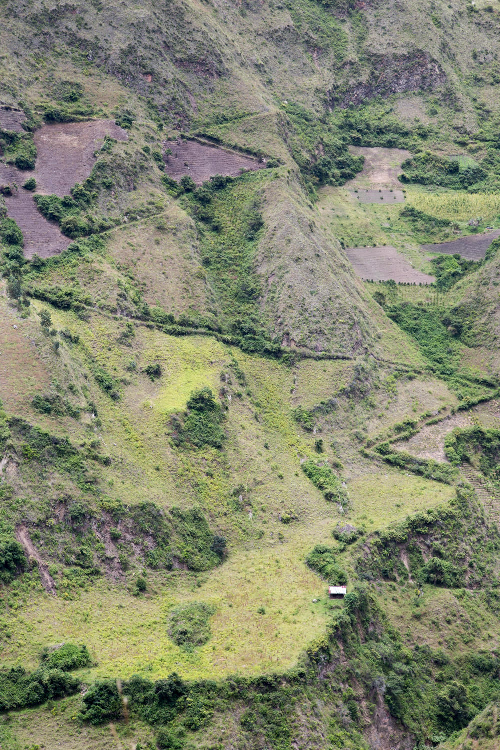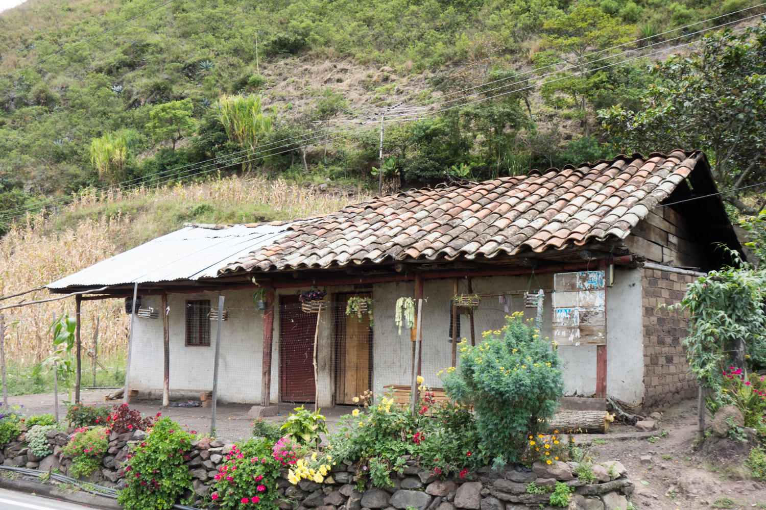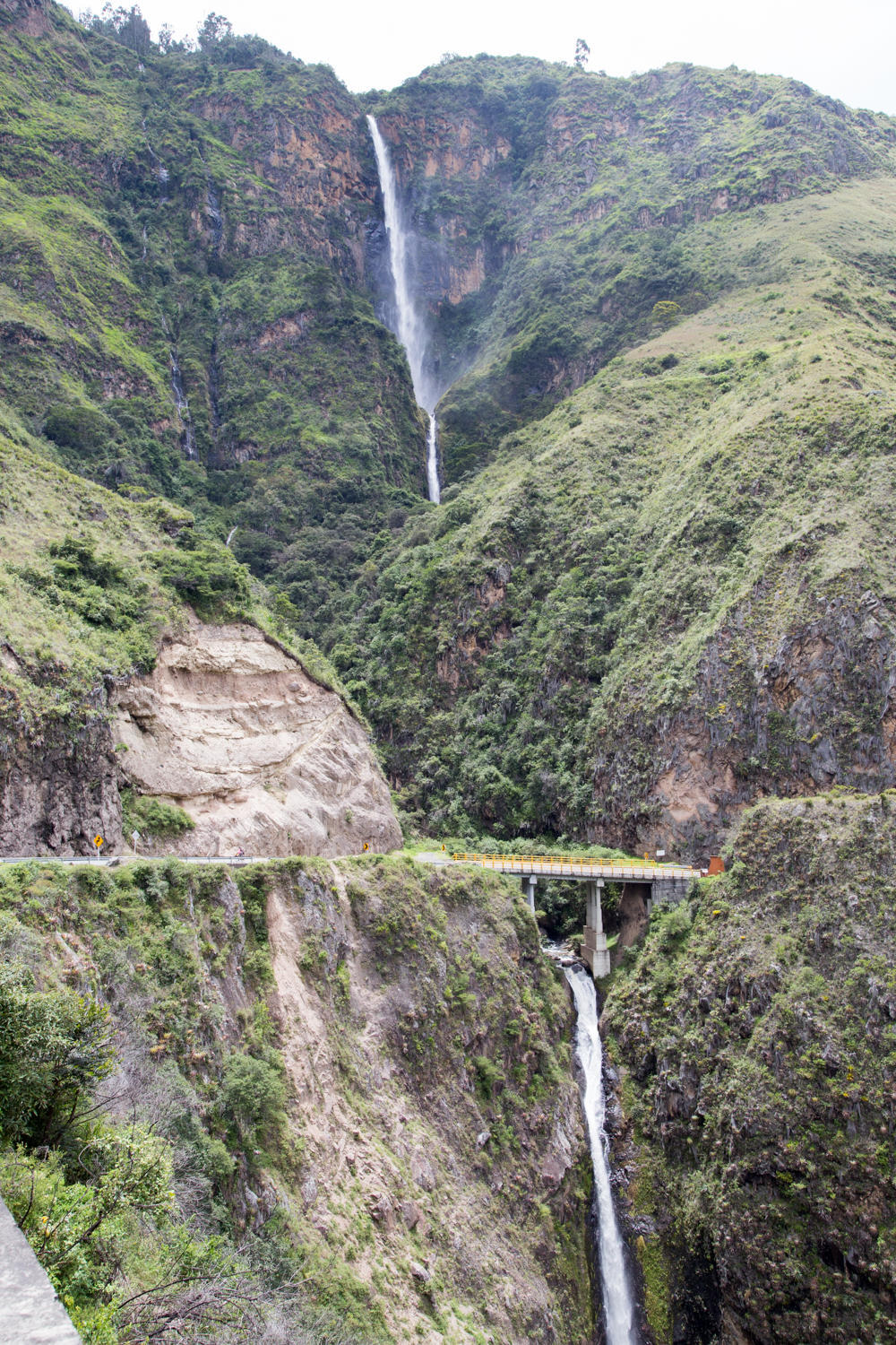 We re-join the Pan American highway and start a gradual climb to a high-point then a pretty steep downhill into a green valley full of farms. There is a river way below us, the valley narrows to a canyon and there are waterfalls dropping down. Very pretty.