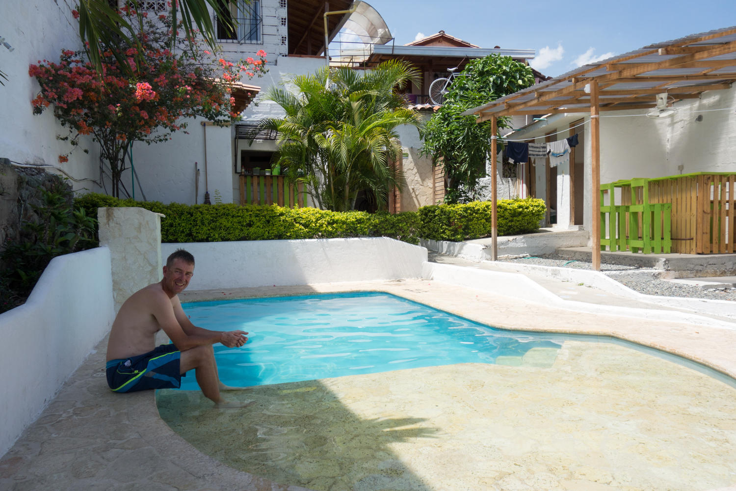 At the junction for the turnoff to Santa Fe de Antioquia, we stop for a one last break. Then a couple more kilometers uphill. The road up to the town is lined with fancy resorts. The town is an old colonial town and the streets are cobblestones. We find the Green Nomad Hostel, in a great location near the plaza. The room is nice and there is a pool. We shower and change into swim suits to take a swim and cool off.