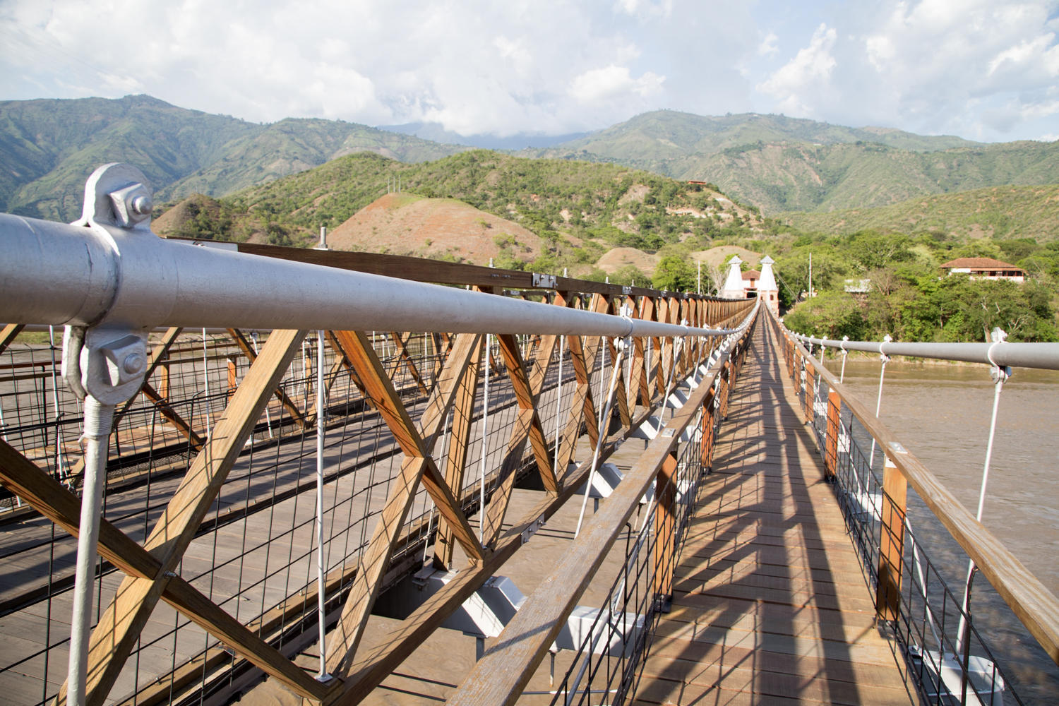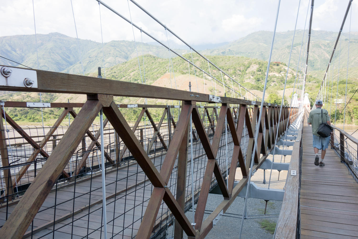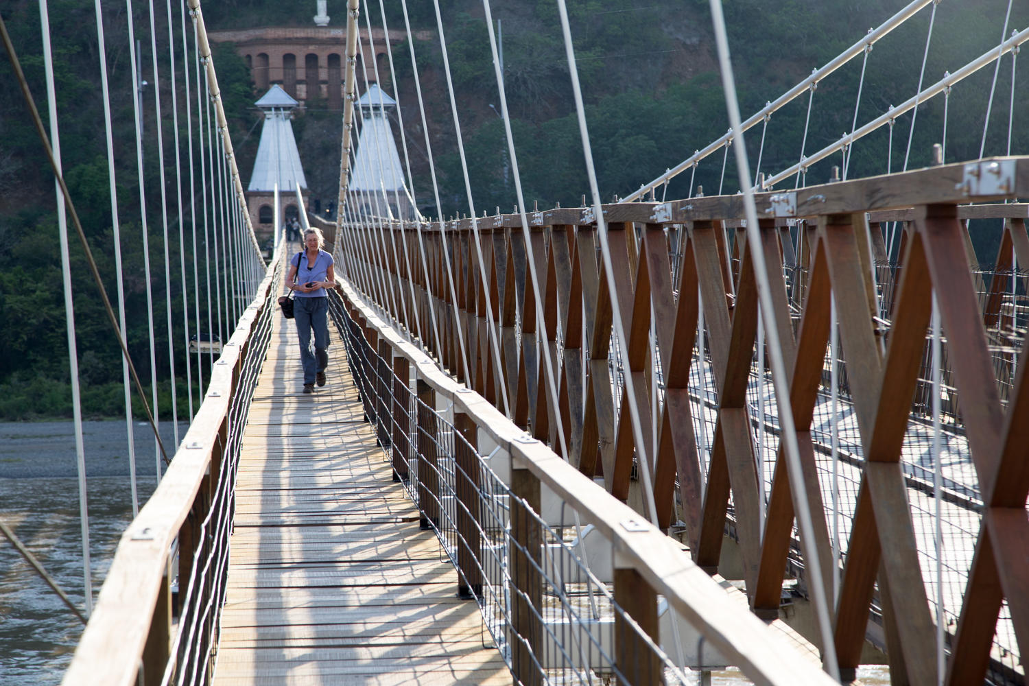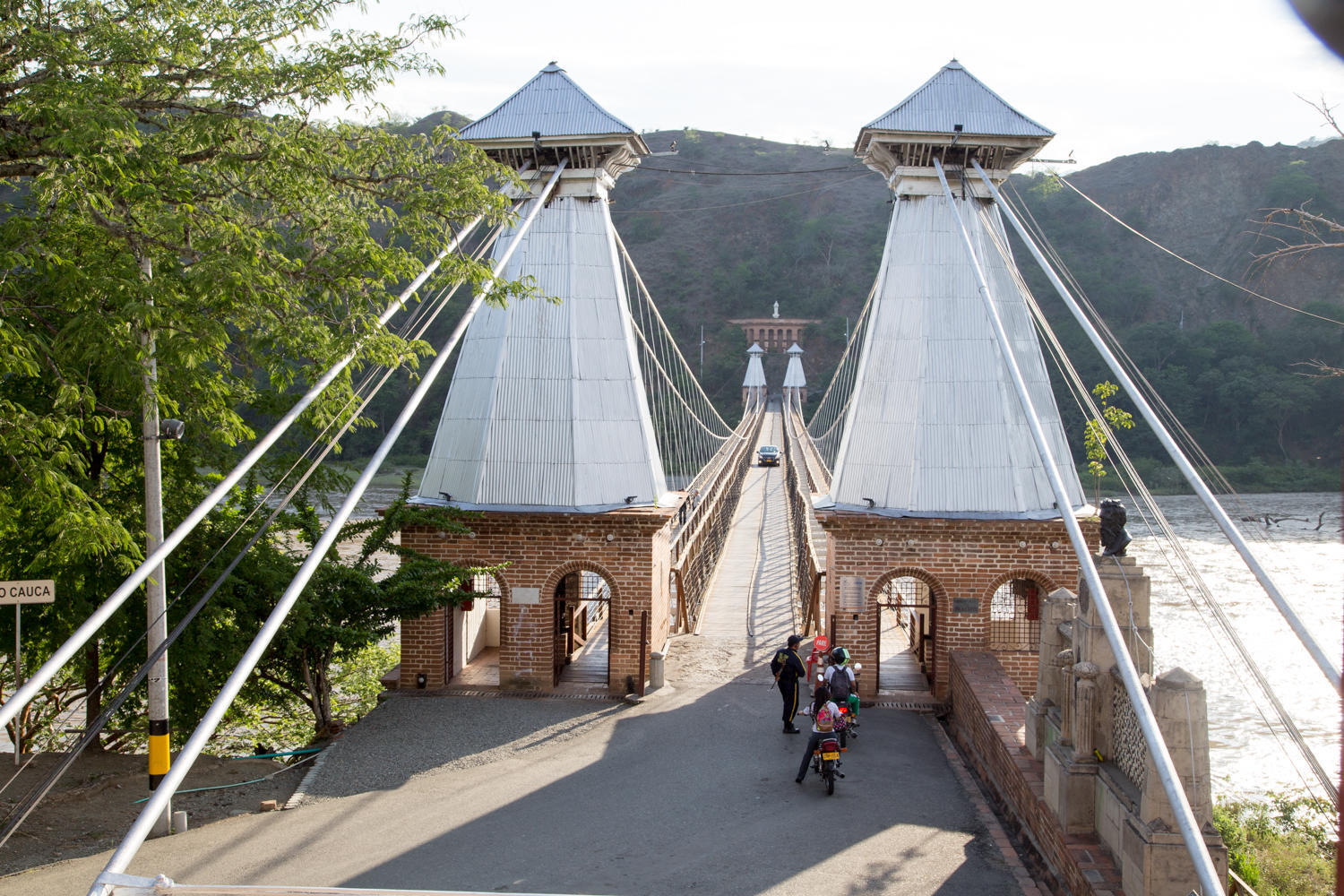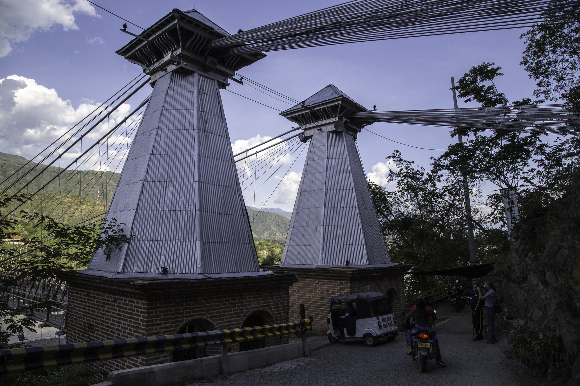 This town has tuk tuk's again. We have not seen these for a long time. We rent one to take us to the Puente de Occidente, a suspension bridge nearby across the Cauca River. The bridge was built in 1887 and was designed by the same Engineer that designed the Brooklyn Bridge. The guy drives us to the bridge, drops us off to walk across and picks us up on the other side.