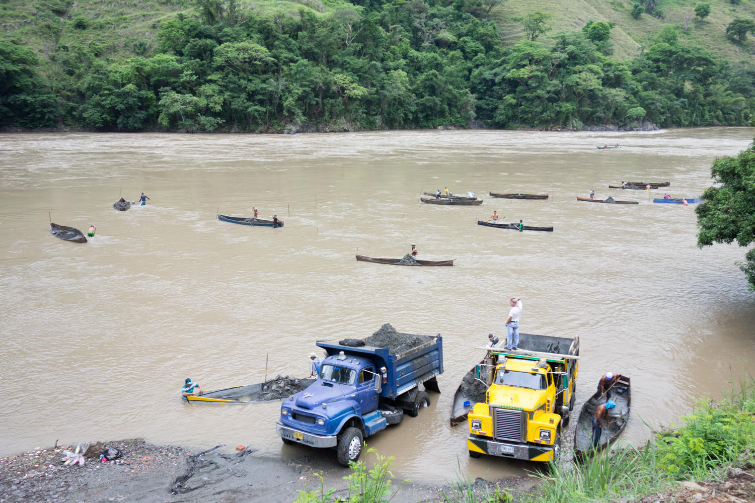 Every time you think that bicycle touring is hard you need a reality check like this. These guys are loading their canoes with sand from the river bottom, tow it to shore and then shovel it into the trucks. Now that is hard work in the real world.