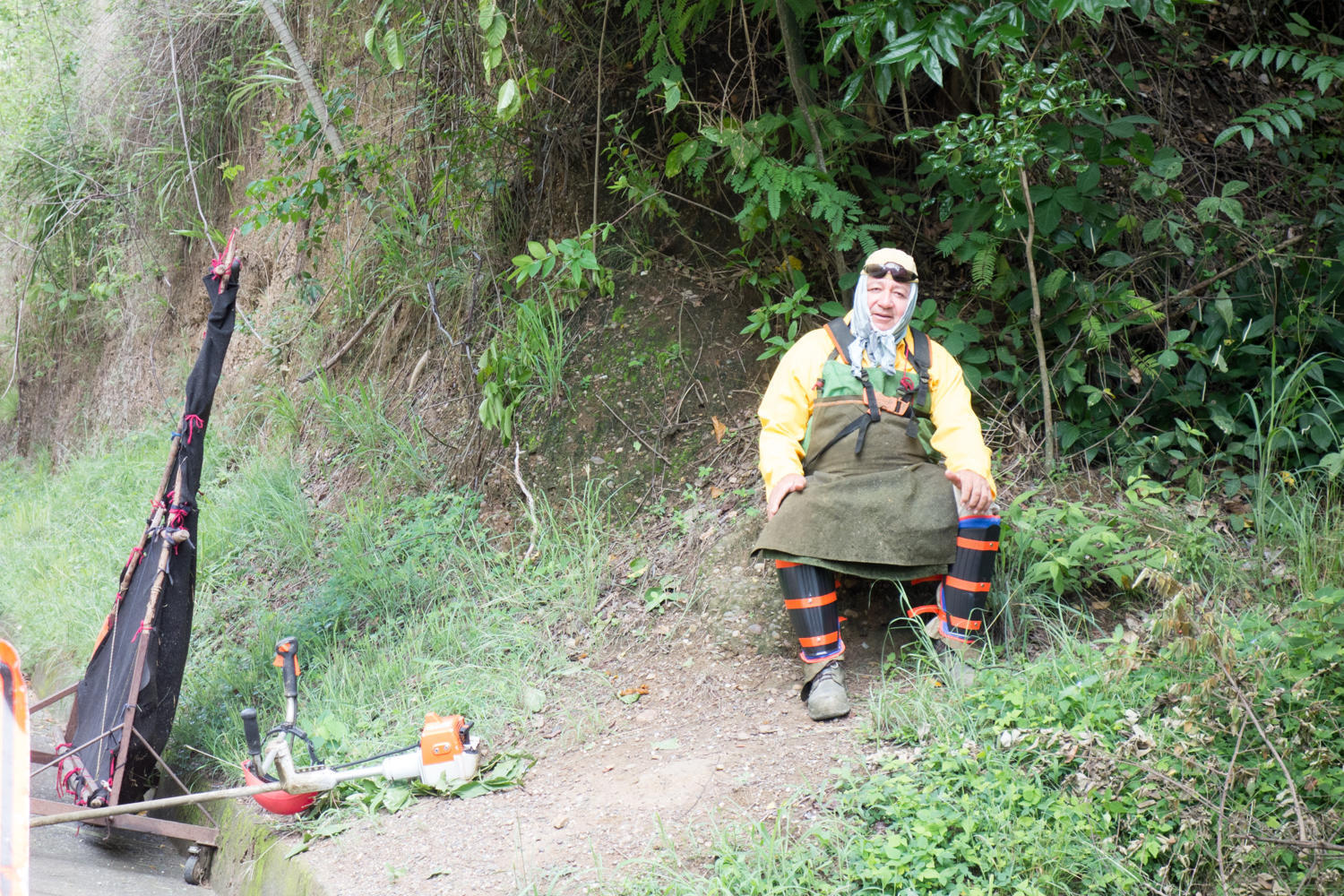 There are many road workers clearing rockfalls cleaning ditches. This guy is clearing vegetation with a weed-wacker. Another worker pushes the movable screen to keep grass and rocks from flying onto the road.