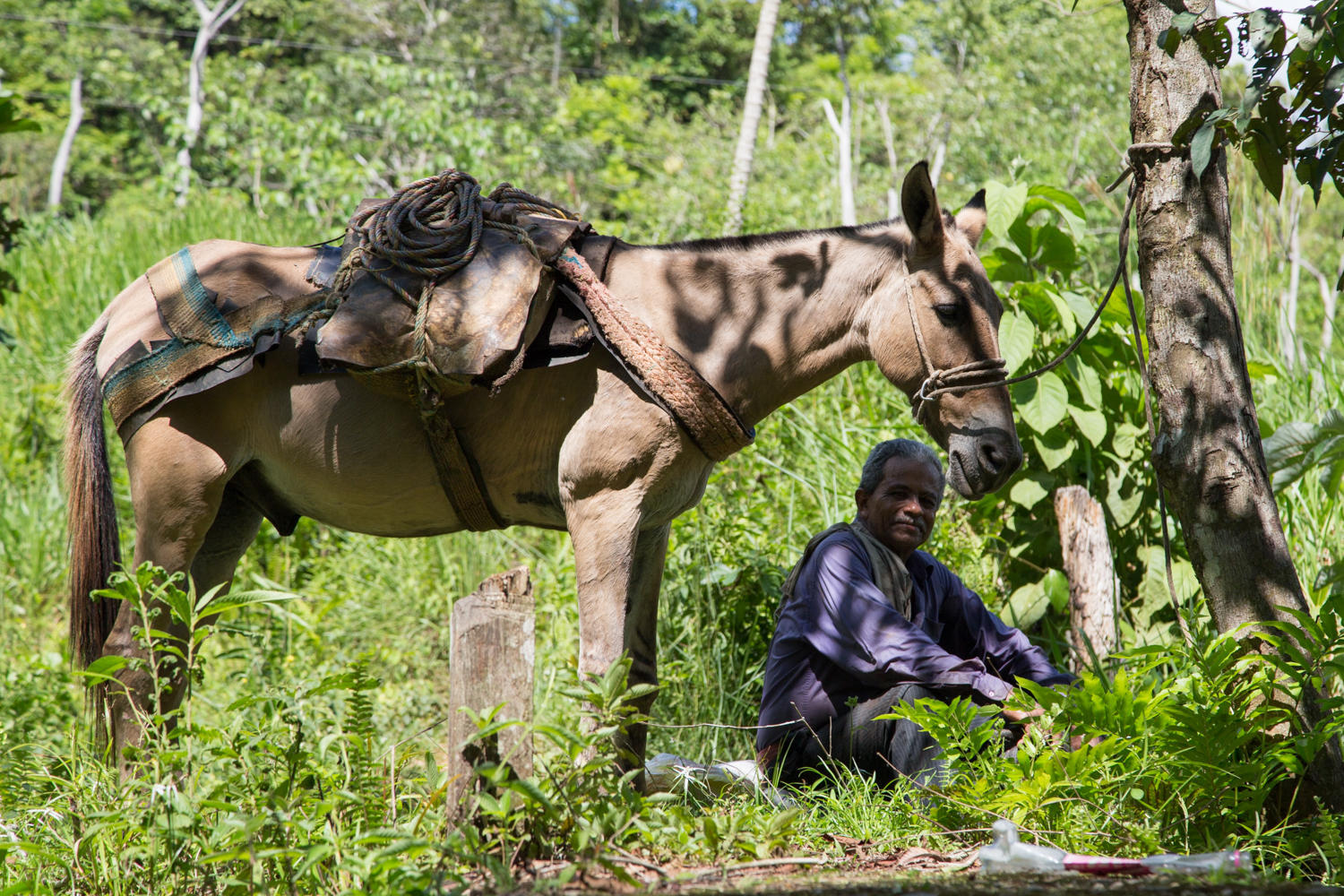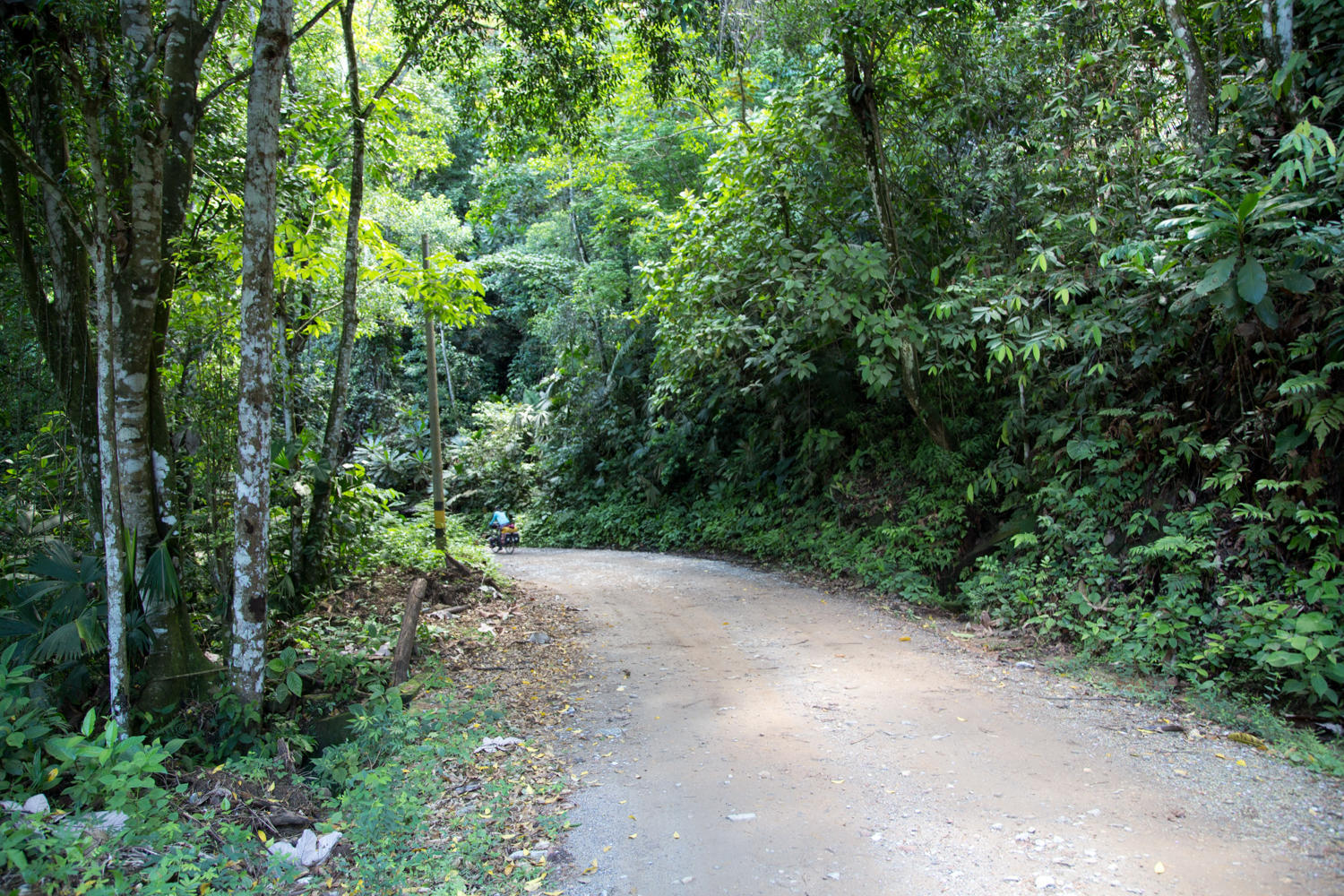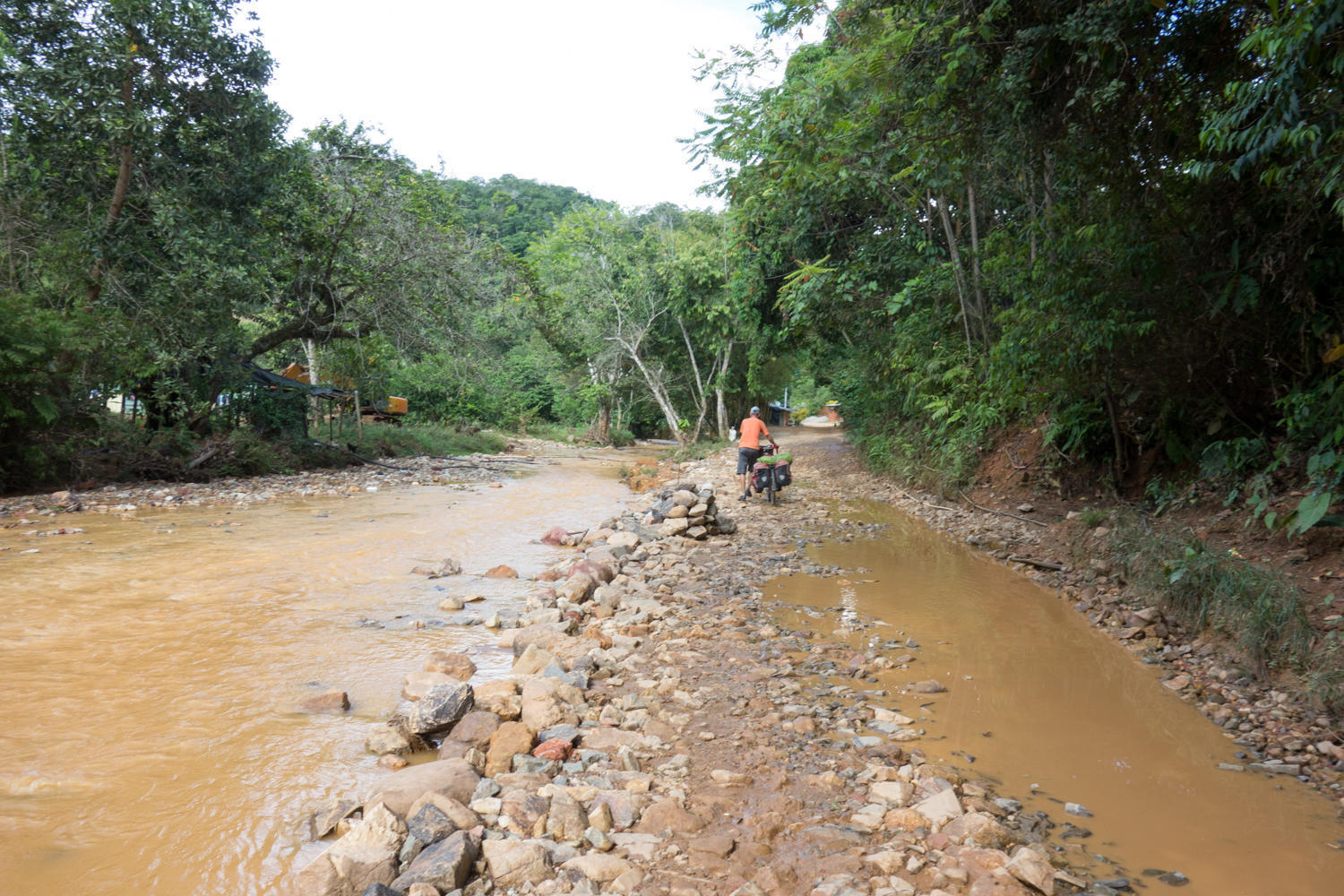 At 22km we are running low on water and see a clear stream coming off the jungle. We stop to filter water. There isn't much hope that there is a lot along the road. We've passed through beautiful hills with cattle and jungle. Then 4km on just as we are thinking this is a day without a cold drink we go through a very poor town and there is a shop. A nice cold drink in this heat makes all the difference in quenching the thirst. The road continues almost as a track in places. Relatively flat stretches and downhill is just as painful as the uphills.