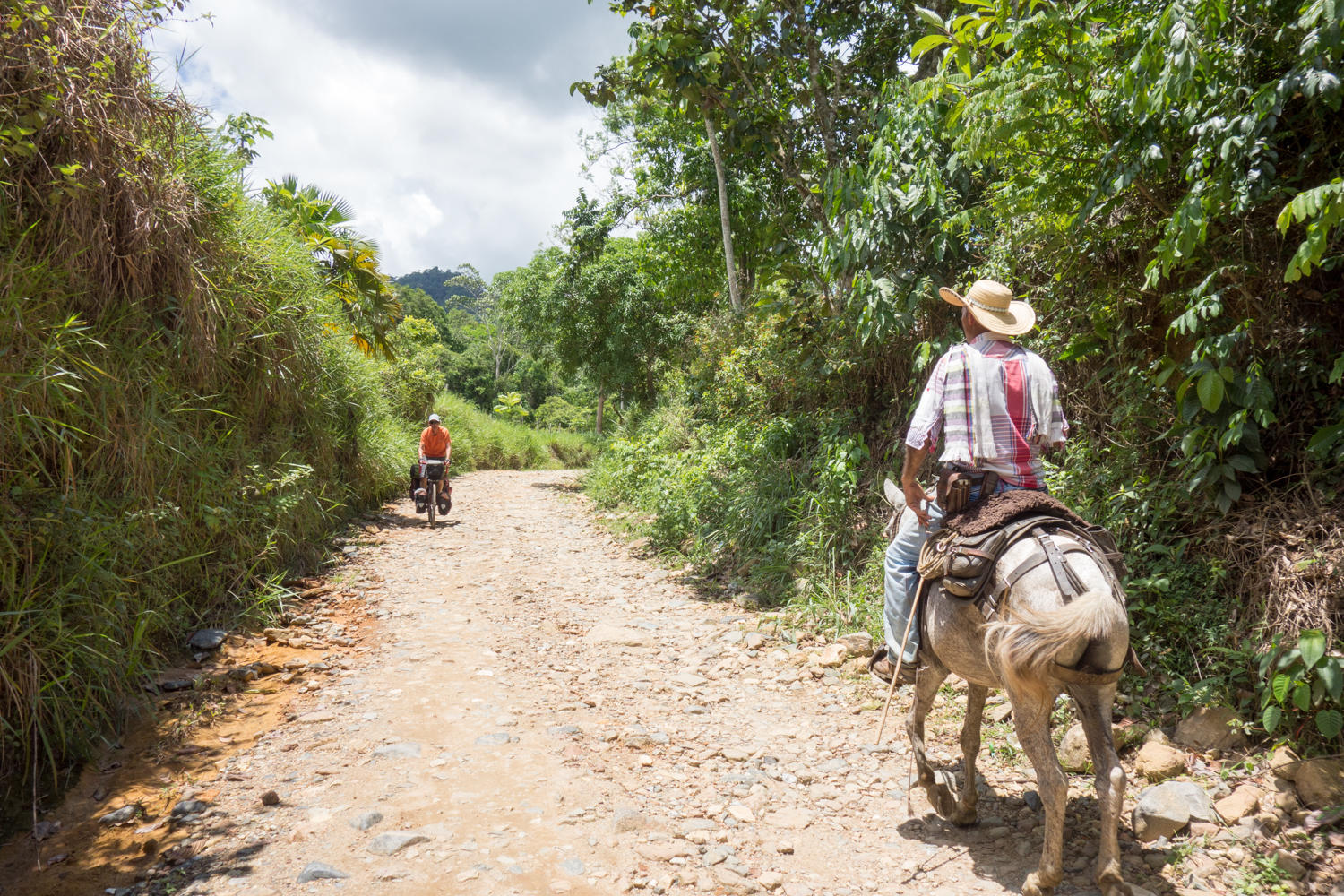 We started first climbing out of Remedios. The "Torres de Angola" was a nice hotel with excellent food. We thought it was a bit isolated and did not explore further, but just around the corner we pass a bakery. We stop and pick up some bread and pastries for the day. Good thing because there are not a lot of bakeries along our way today. We had been told that the road to Segovia to Zaragoza was unpaved so that was not a surprise. What we didn't expect was the condition being so bad with huge rocks, washed out areas and puddles to cross. Now we understand why most cyclists take the route 25 from the coast to Medellin, even though there is a much higher pass to cross on that route.