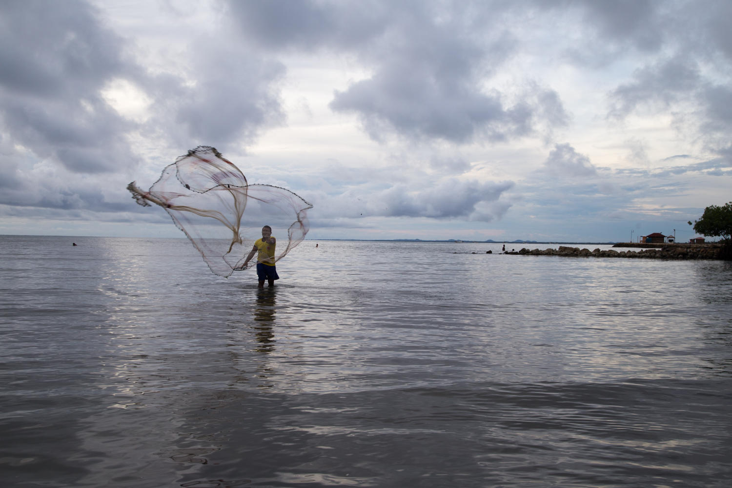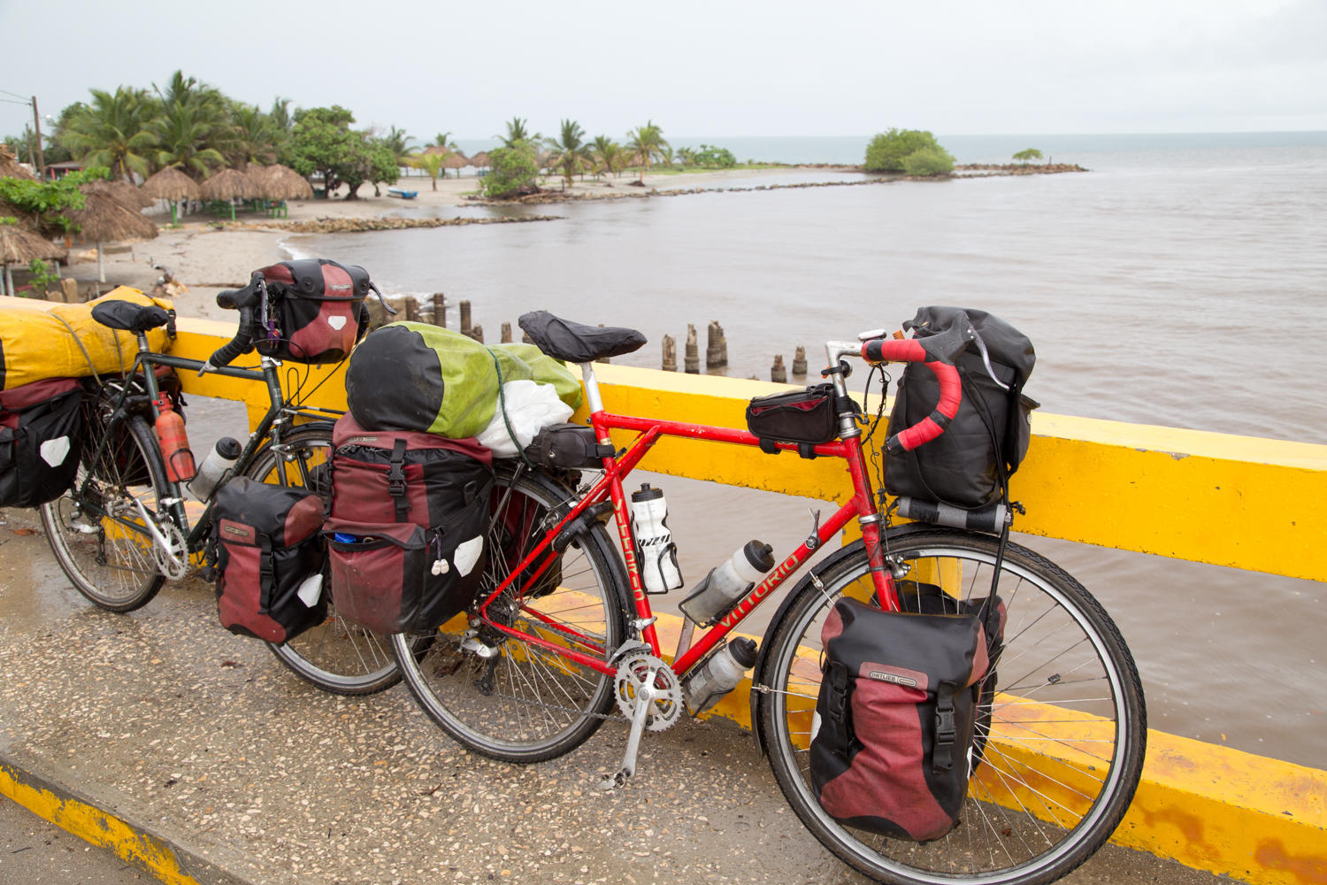 Soon after leaving the town, the rolling hills start again and a light rain. The rain intensifies gradually and we stop again for a cold drink. Once out of the hills the road flattens again still no shoulder and the road surface varies. We get our first glimpse of the ocean as we ride along Petroleum plants. This last stretch the rain intensifies. We just put our heads down and keep cycling.