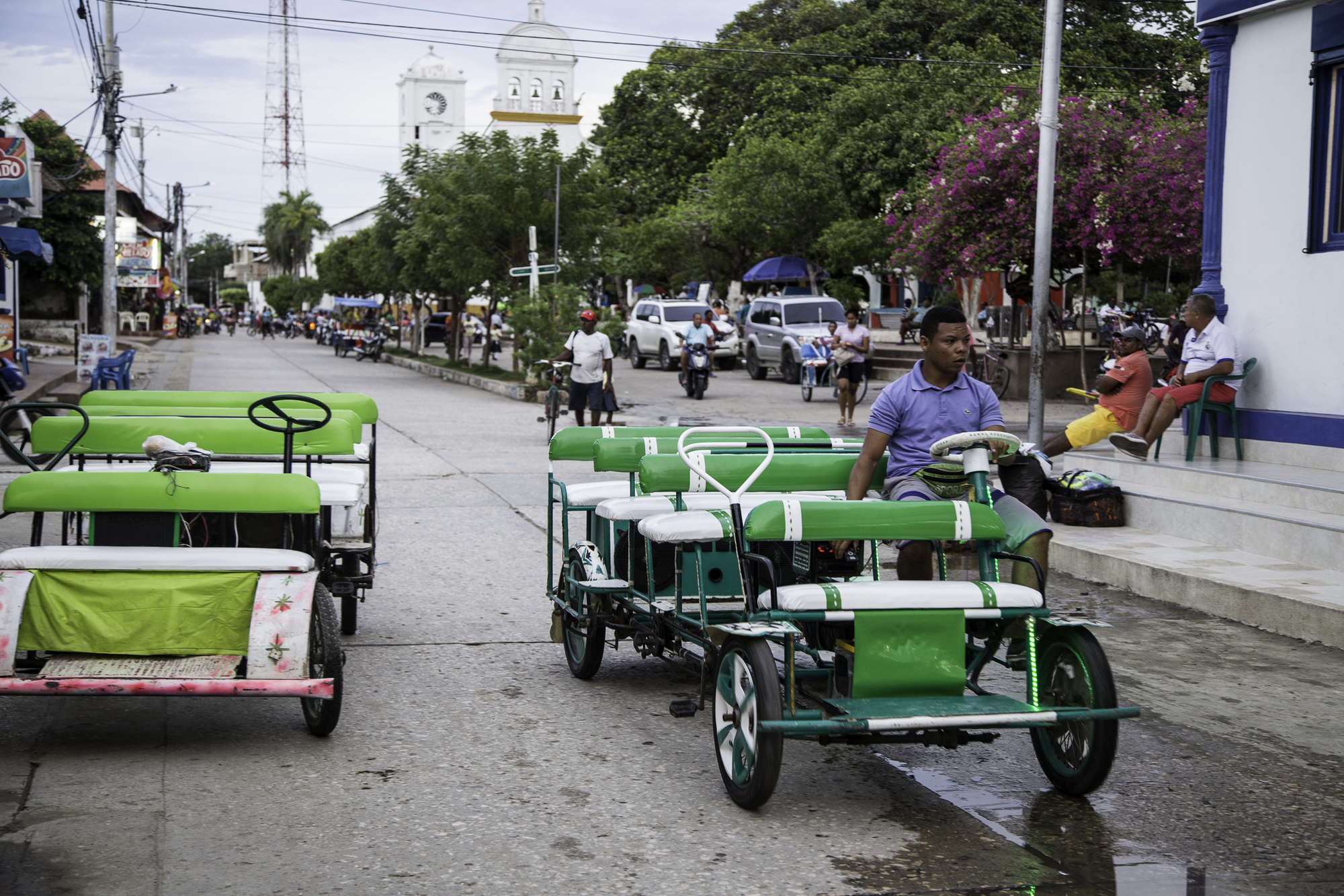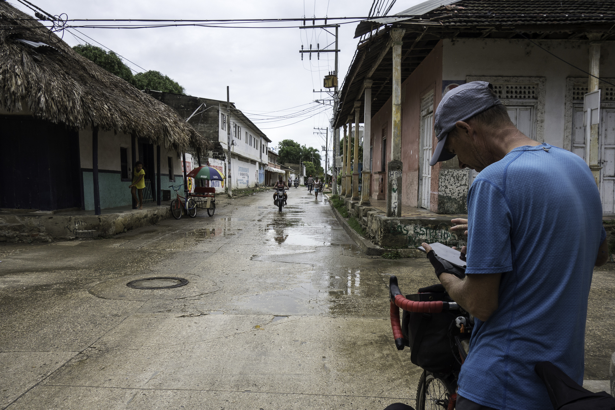 At Lorica, we stop at a bakery for coffee and pastries. There are several nice looking hotels here and a possibility of staging this stretch of road differently. For us going in this direction, it's a bit early to stop here. Patrick finally spots a shop that is selling clear plastic and stops to buy 6 meters. This is needed to cover the bikes when on the sailing boat to Panama to protect the bikes from the salt water. Items like this are easier to find in the smaller towns rather than waiting for the bigger cities. We make it to the other side of the town, when Patrick spots a nicer bakery. So we stop again for another cup of coffee and cake.