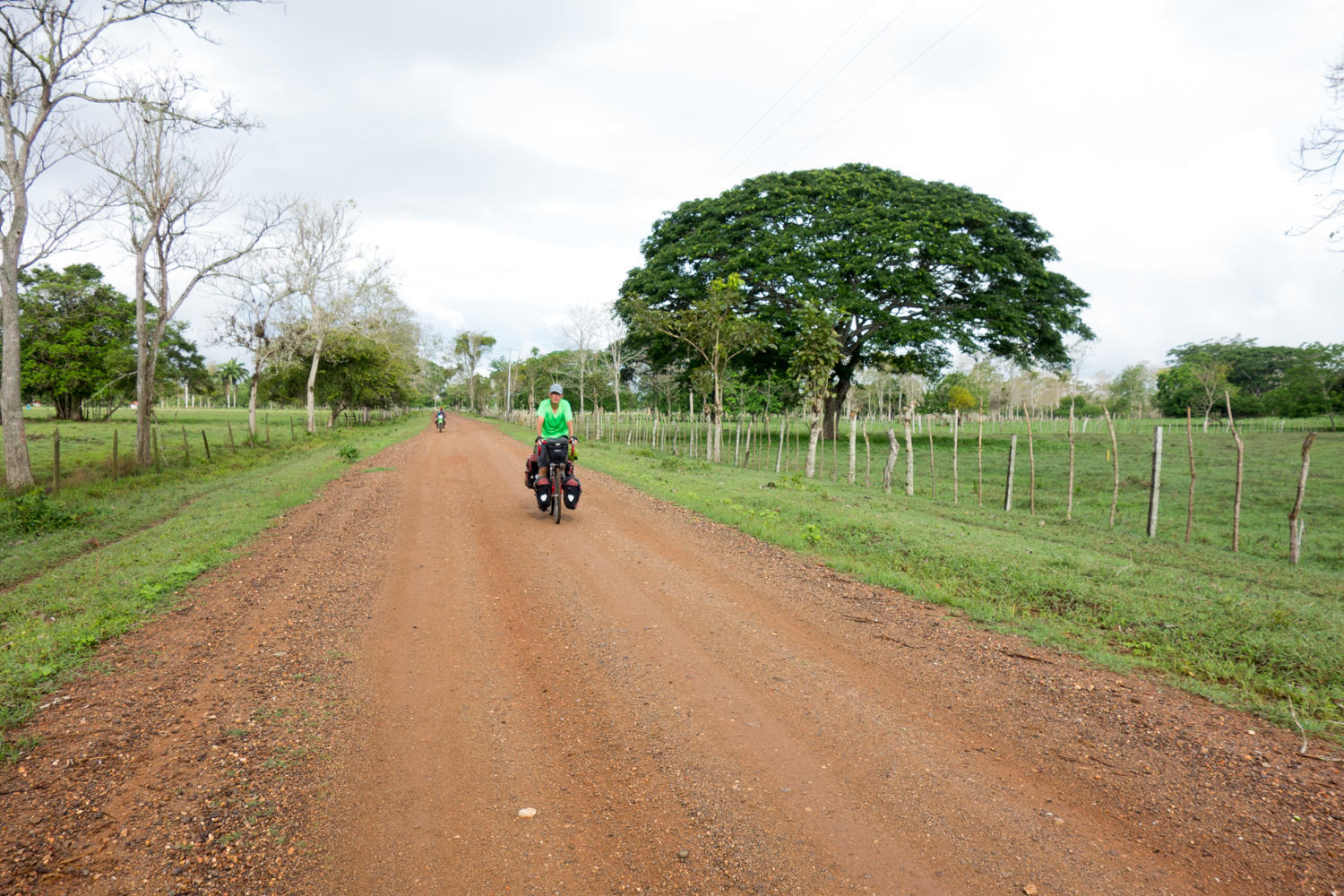 After a couple kilometers past this, things improve. The surface is packed gravel and sand, the scenery is very nice with pastures, cows and large trees. We pass by several Fincas or Haciendas, donkeys grazing at the side of the road. It starts to rain again, but except for a short section the road is in good shape. We were expecting the paved road at about 16km, but it takes us 23km to get back to asphalt. About 200 meters from the asphalt, we can see traffic on the paved road, a short bad section does bog us down in sticky red mud that clogs up our fenders. Once again, the bikes are muddy after looking so clean after the wet ride into Tolu.