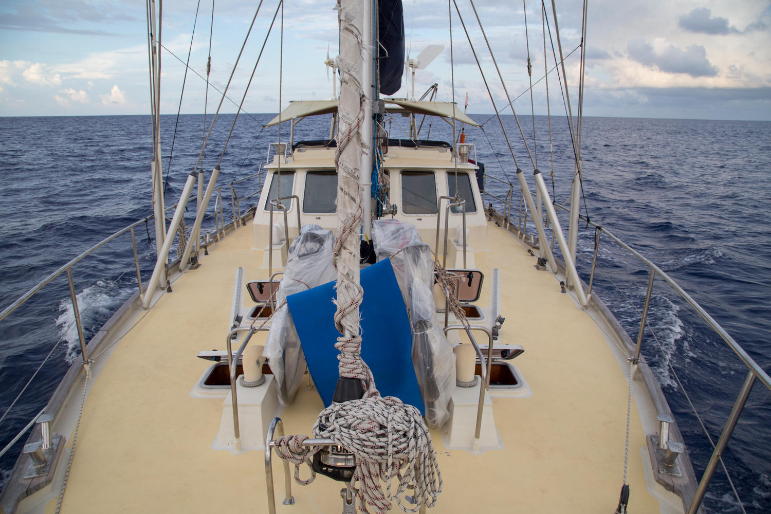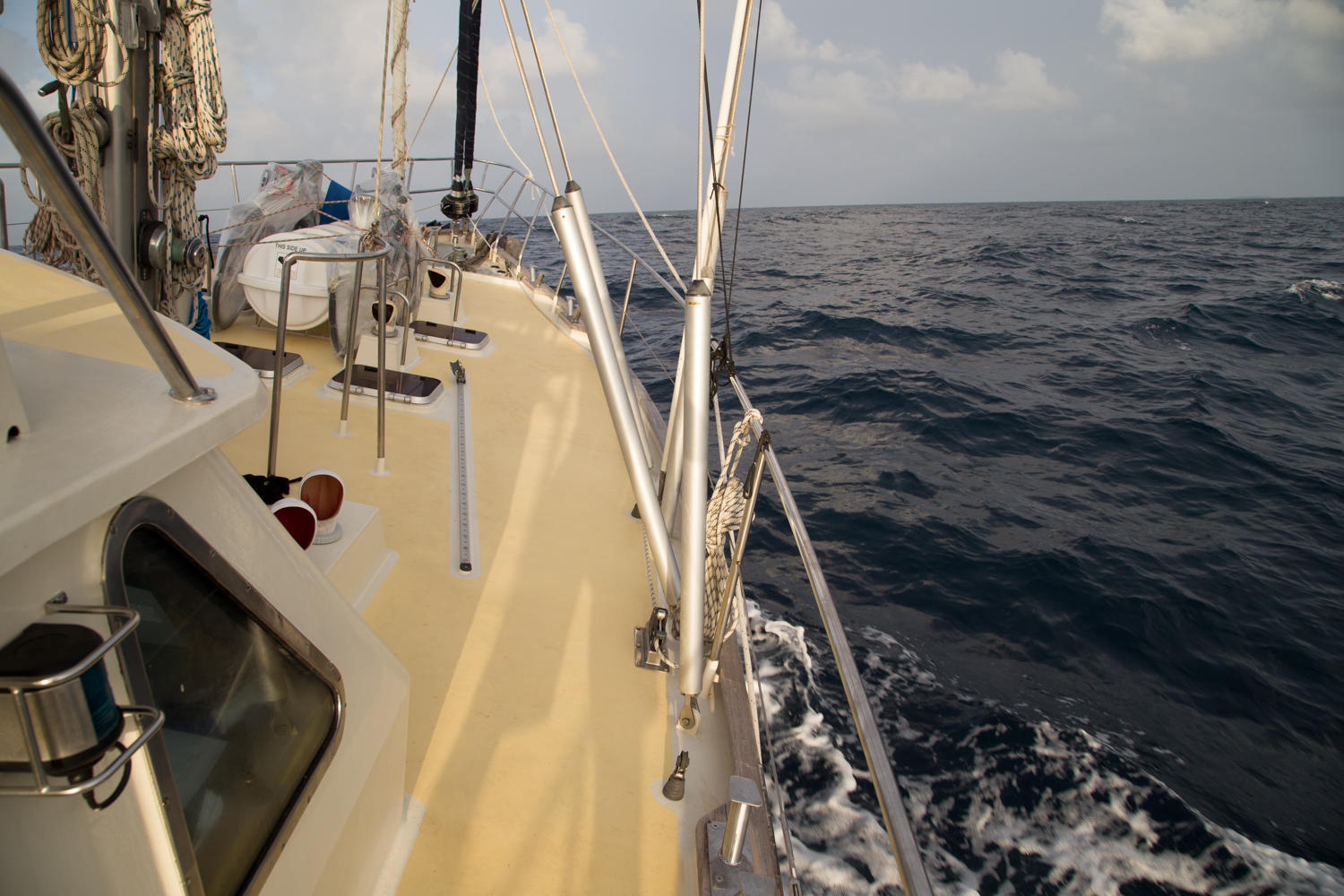 The night is pretty hot downstairs, but the fan helps and the Dramamine knocks us out pretty good. It is already light outside and the boat is gently riding the waves that can come from behind and pass under us. After a cold shower the best place to spend time is on the afterdeck, a breeze to cool us and shade from a large tarpaulin. We spend the day talking with our fellow passengers and the Captain. The ship has automatic steering, once it is on the right course and heading it is pretty much hands-off, though the captain does keep continual watch. There is radar with a proximity alarm which allows the captain short naps during the night. But for the most part he is sailing for about 32 hours straight to reach the San Blas Islands off the Panama coast. We see one or two large ships on the horizon and one other sailing yacht way out there. There are some floating logs, plastic bottles and a large Styrofoam cube just floating in the ocean. A 360 view is only of water, no land in sight.