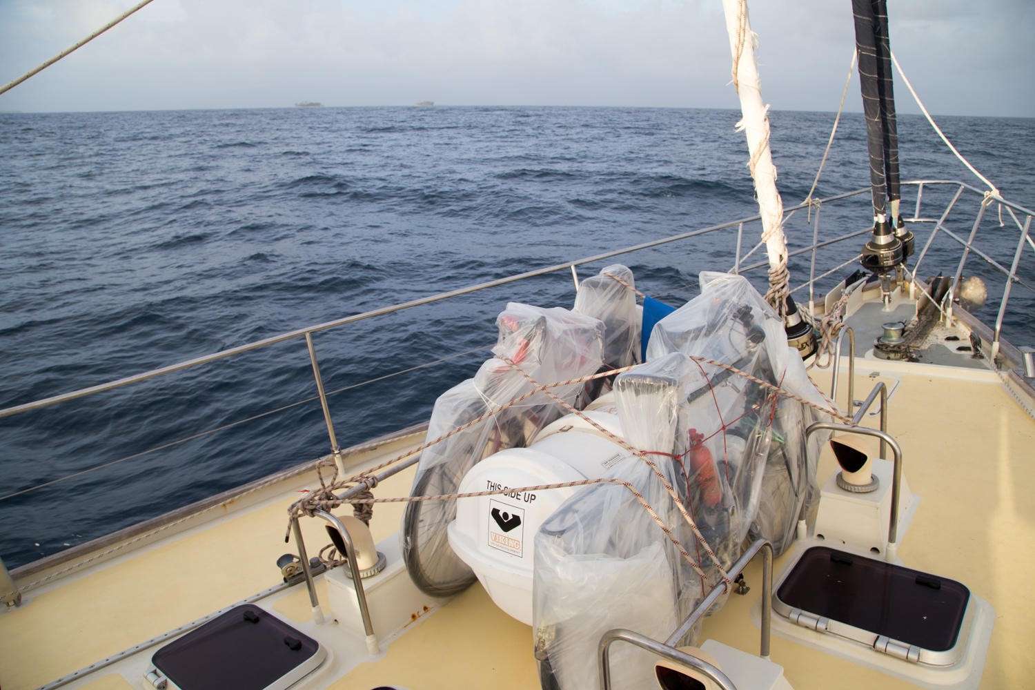 While at sea the deck hatches need to stay closed, there is always the chance of a rogue wave, actually on our way out of the harbor we pass by a large container ship coming in and the bow wave of that ship sends us bucking pretty good. The bikes are safely tied in the middle of the foredeck to a life raft. The captain of the Quest did charge us for taking our bikes, $50 each, while most other boats do not. We were a bit miffed about that, but we went with it because we liked the description of this ship, some reviews we read and the fact that it only takes ten passengers, some boats take up to 25.