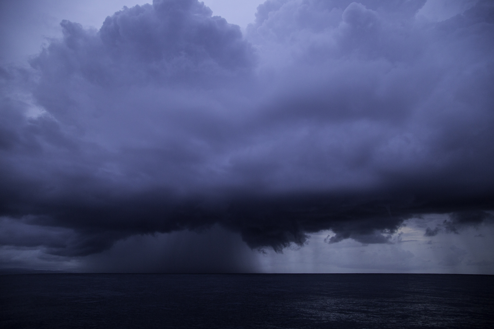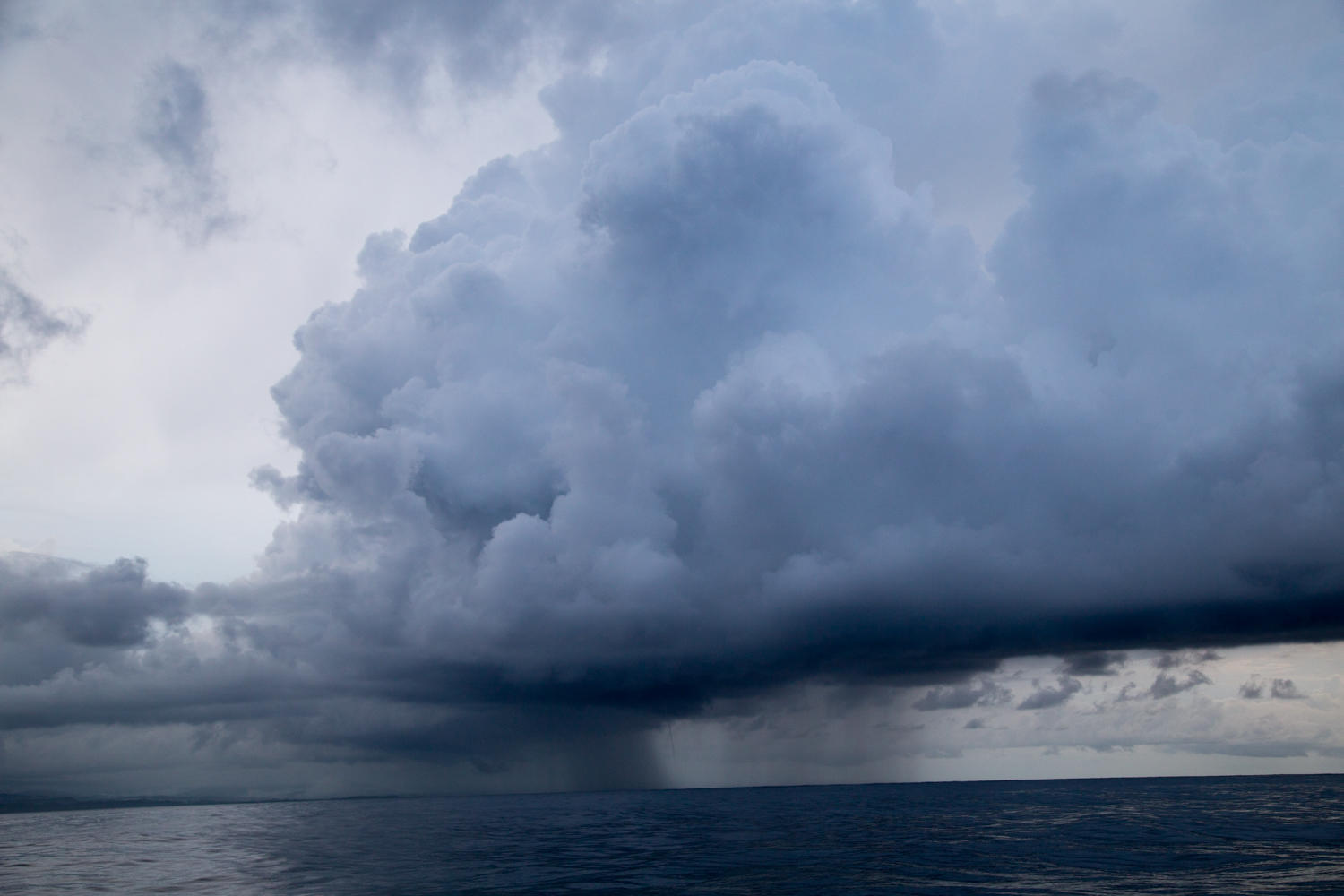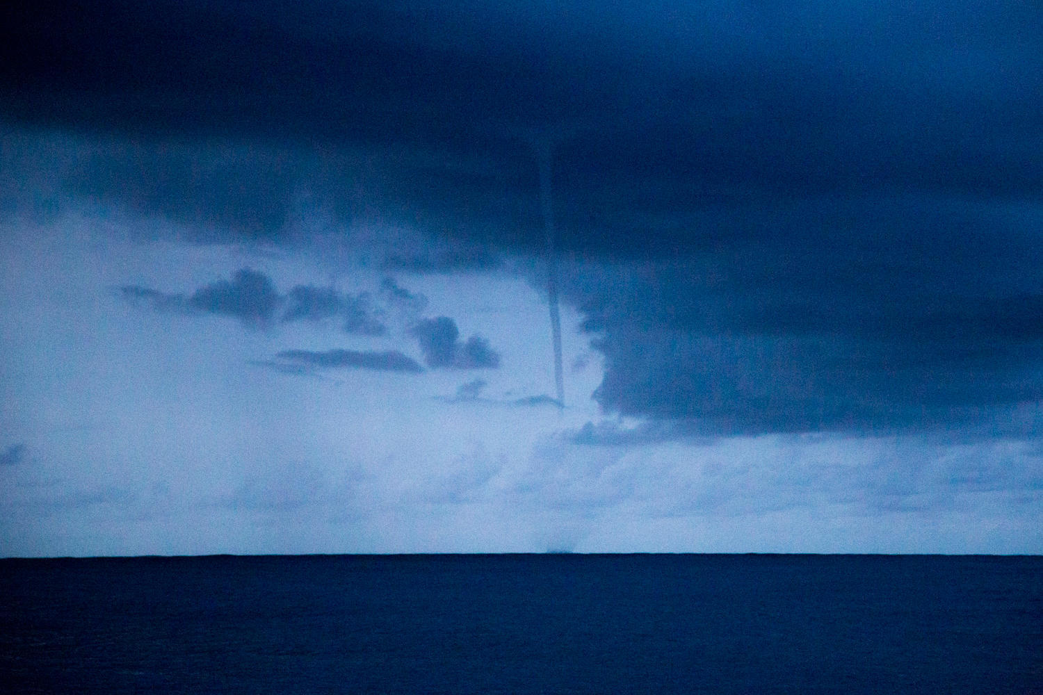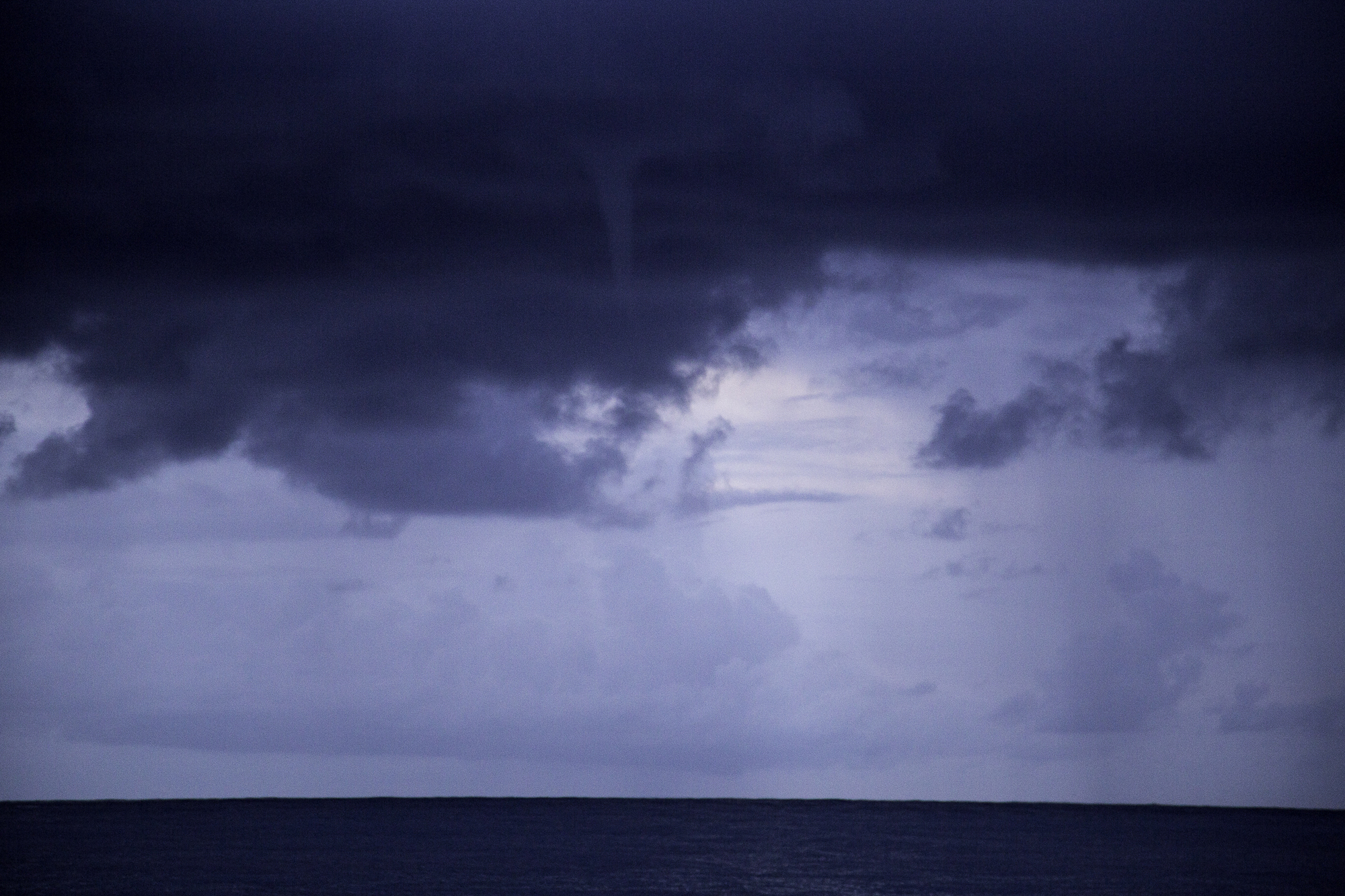 At five in the last afternoon at sea, we weigh anchor for the final leg to Portobelo. When we leave the weather is very calm but there is a good ocean swell as soon as we leave the islands. There is little wind though and the surface is smooth. We see some dolphins alongside the ship. It has been overcast all day and as we move west along the Panamanian coast we see a very dark band of clouds ahead. It does not seem to be moving at all. On its western side appears a waterspout that seems to reach all the way to the ocean. Two or three more tornadoes are trying to develop along the front. A heavy downpour on the western end eventually obscures the first spout. Then another one forms to the east of the boat and touches all the way down to the water surface. It’s an awesome and scary sight, but we will be okay inside a 40 ton steel vessel. As we start getting more underneath the front the rain gets pretty heavy and it gets dark, most of us retreat to our rocking cabins.