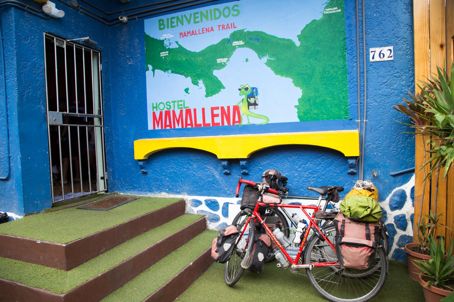 We say our goodbyes and catch a “chicken bus” to Sabanitas on the main road across Panama. These are old US school buses and brightly decorated. There we quickly catch a larger bus into the city. It all goes very smooth; the buses only cost a couple of dollars, plus a little more for the bikes. We are dropped off at the main Panama City bus station at the Aldwood Mall. We say our goodbyes to our fellow passengers here, except Egwin and Christina, the two Belgians from Antwerp who are going to the same hostel we are. It is only about 3km riding to the hostel, the GPS helps us find the shortest route, even though that means walking against traffic on a couple of one-way streets. The area looks pretty rough. We check-in at Mamallena, part of the same group that runs the Cartagena hostel. A decent enough room with a fan, and AC (at night only), a nice common area and kitchen, and shared bathrooms. The area is pretty rough tough and the walls surrounding the hostel are covered with razor wire and electric fence.