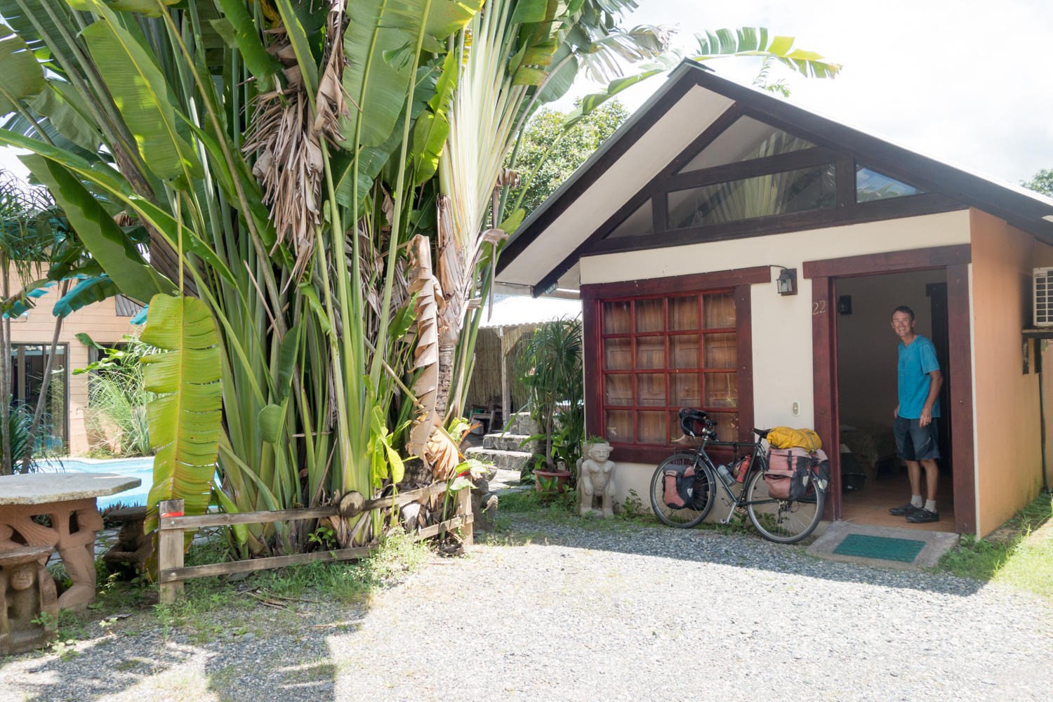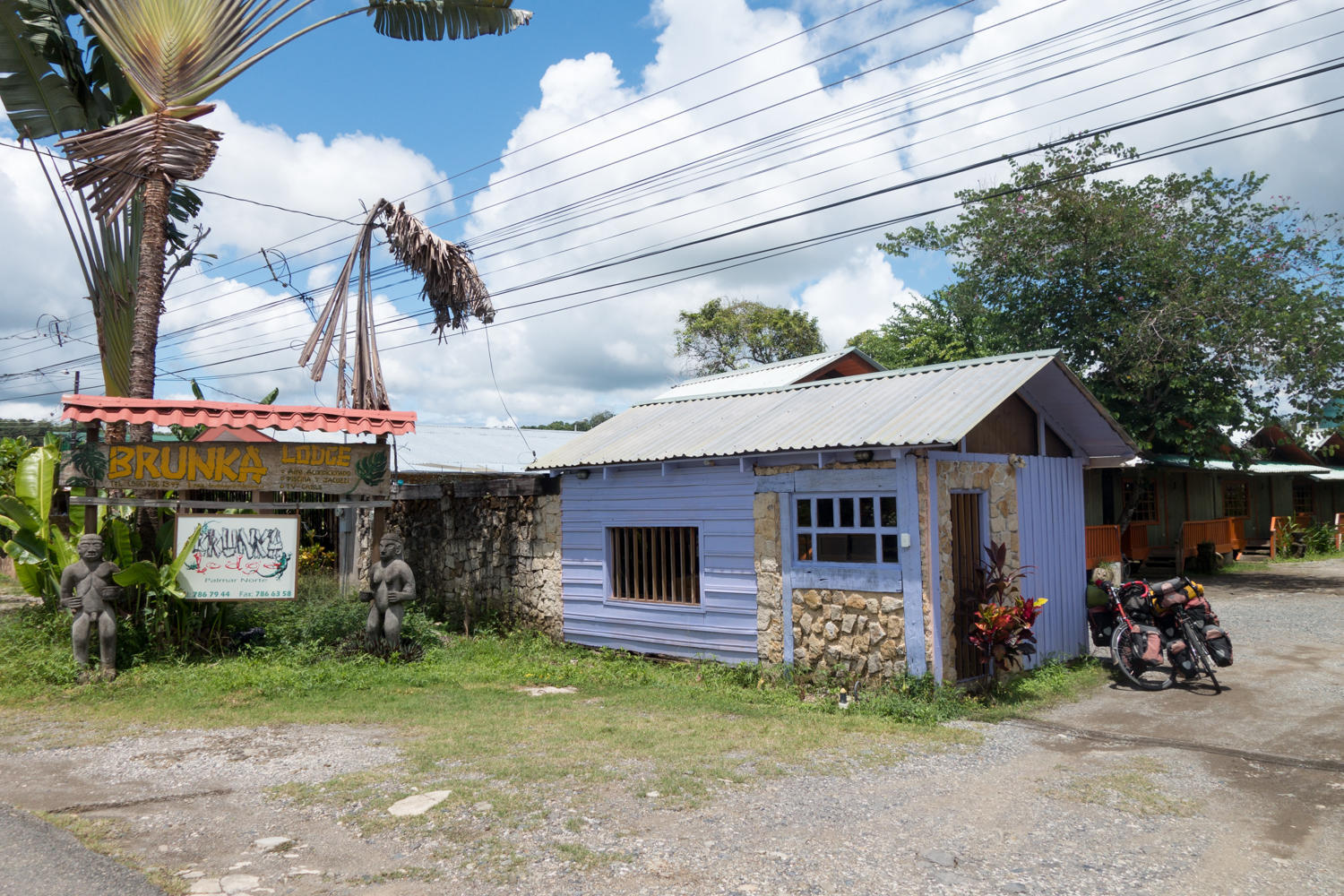 We arrive in Palmar Norte at about 10:30. The first hotel we check is the Brunka Lodge, but it is a bit expensive even though they have a pool. We ride back and check two places on the main road, but both are fully booked for tonight. So we head back to the Brunka Lodge. A nice cabana with AC, bathroom and TV.