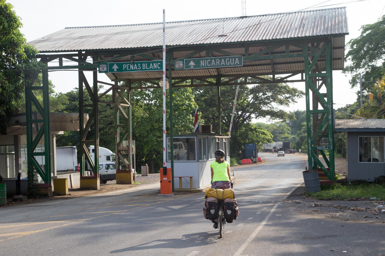 Then a short ride through no-mans land to the Nicaragua immigration. While Rachel watches the bikes Patrick goes in to figure things out. Right in the door you have to pay $1 "community tax", then there is a line of immigration officers behind enclosed podiums that scrutinize your passport. They charge another $12 for the entry stamp. Normally you would then continue to the customs baggage check, but since our bikes our still outside we backtrack. After Patrick's successful run Rachel repeats the process. We avoid the xray machines in the customs area.
