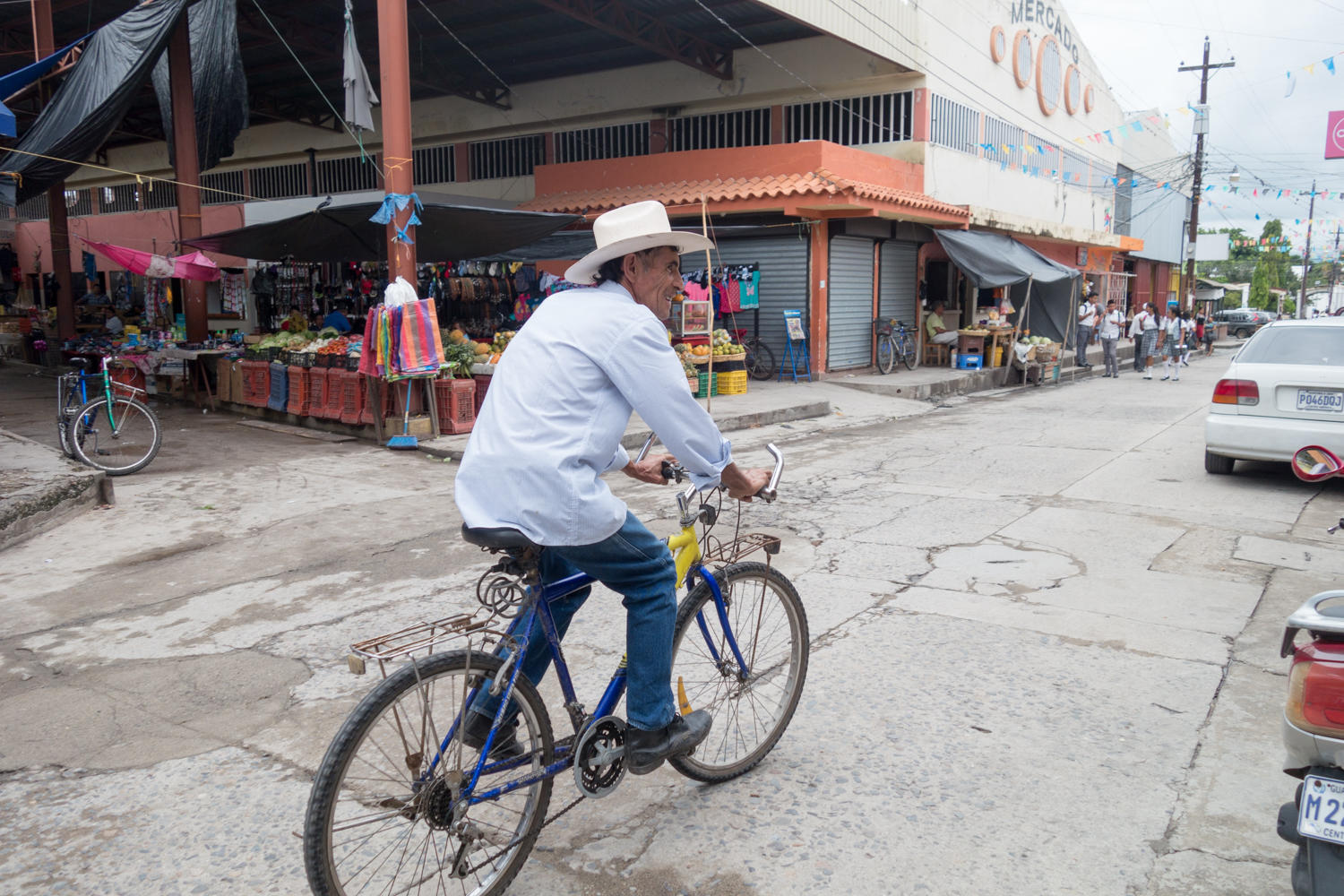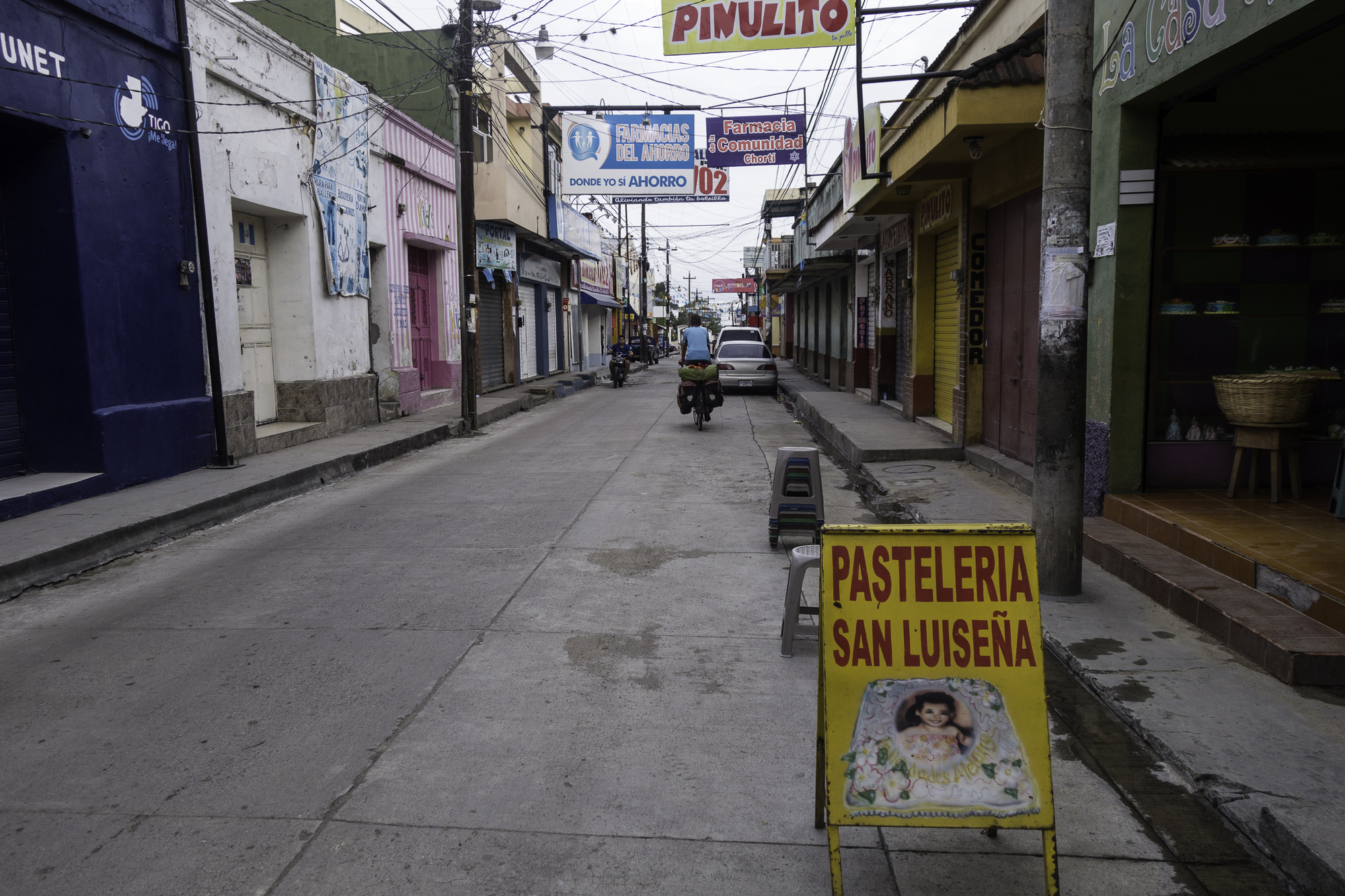 The two hotels listed on Ioverlander are on the outskirts of town, both look nice but isolated. We continue on in to town and find Hotel Pena almost across from the Centro Mercado. The street is busy! We carry gear up to the room and bikes on the balcony. There's a clothesline under the roof of the balcony, we hang our wet clothes from yesterday's laundry, wash a few more things and hope for the best that things will dry. Or at least dry enough not to be too uncomfortable put on tomorrow, after all, this is rainy season and chances are we'll get wet.
