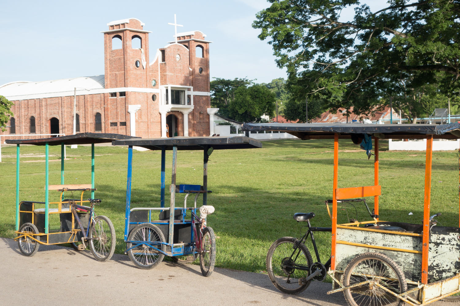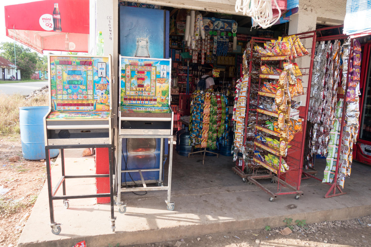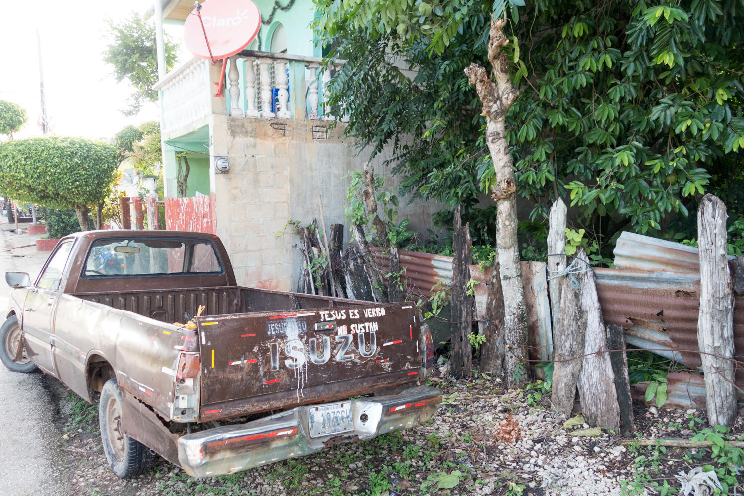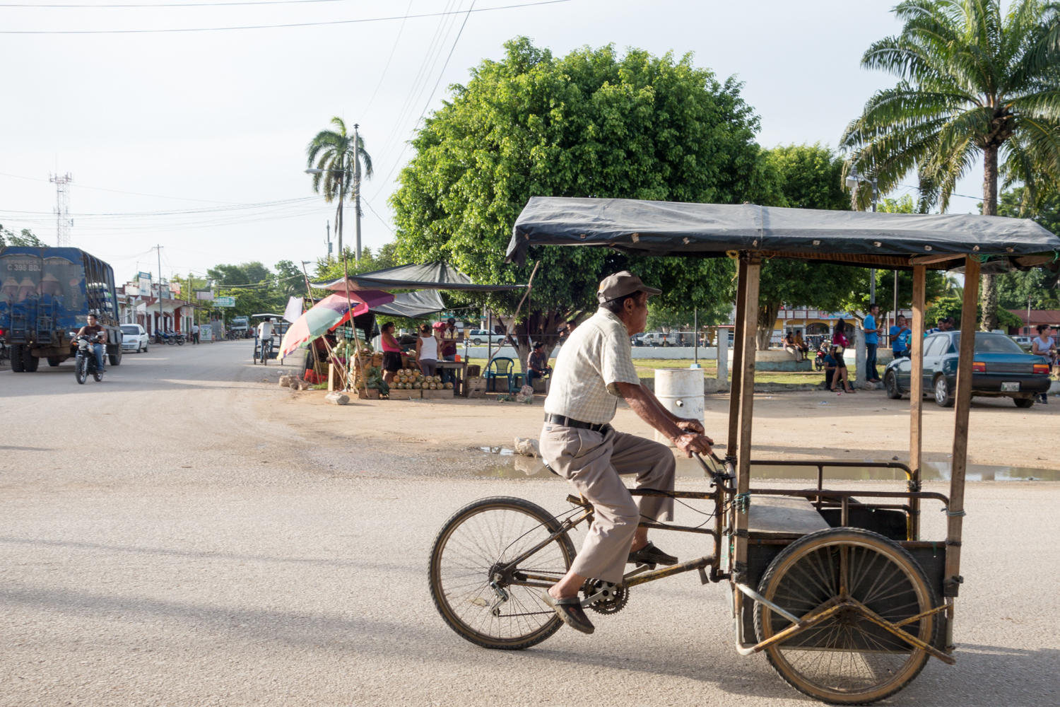 After a little more internet time, we haul our gear downstairs and start riding again. We are leaving about the time that we would usually be arriving at our destination. First, we go over the bridge off the Isla Flores, then, through San Benito before starting to climb the biggest hill for today. About halfway we pass through a town, find a gas station and stop for a cold drink. It is scorching hot, a disadvantage of our late start, but that changes fast. A thunderstorm unleashes a downpour that soaks us. The temperature is just right though. The rain continues for the next 18 km until just before reaching the town.