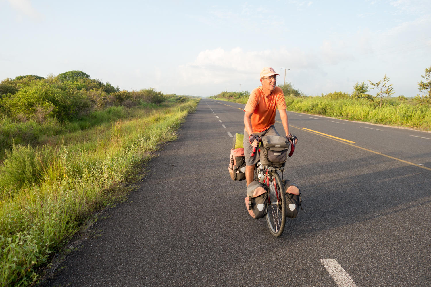 Even though it will be another short day we get an early start again. We ride across the old bride out of town, then rejoin the nice new road. There is a pretty sunrise over the Gulf of Mexico.