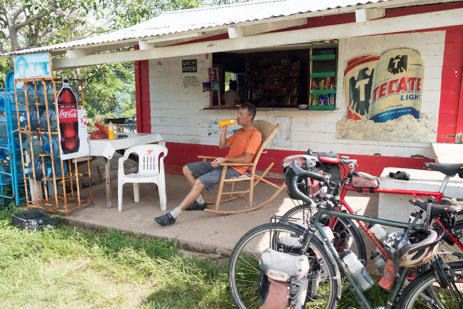 The road follows the laguna for a while, then turns inland towards some distant hills. It is hot again, and no stores until we get close to Aldama. We find the Hotel Rancho Viejo, get a good room and have Chinese for lunch.