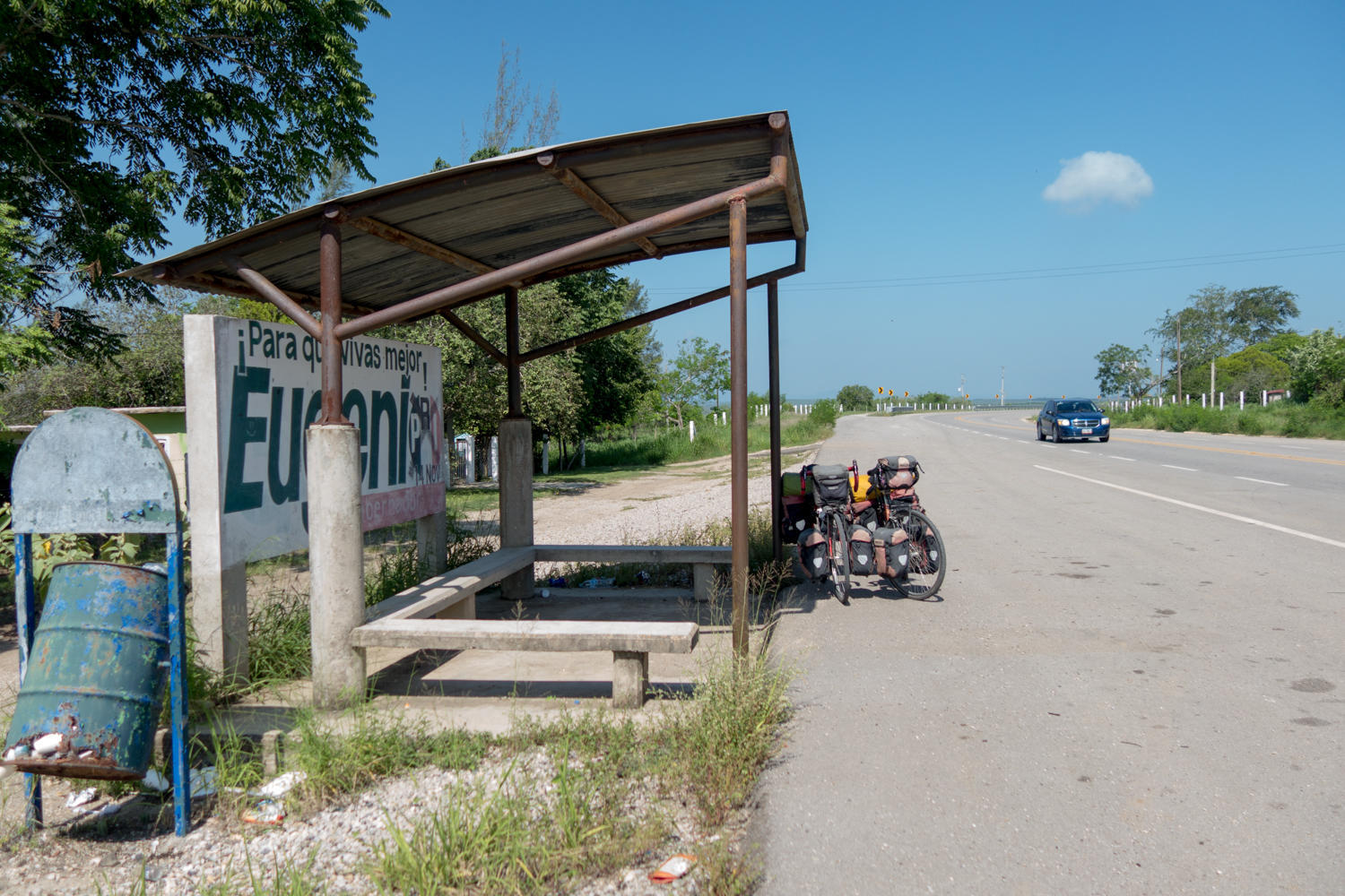 At the stop, we know it's going to be really really hot today. We decide to add ORS re-hydration salts and Tang to one liter cold water, drinking half now. The road is unpaved for about 2km. We are lucky that we have a tailwind and make good time to the next high point for the day after another 30km. Reaching another town for a second rest break. It's hot! We find refuge in a bus stall. There has been very little shade and there's been no shops along this stretch.