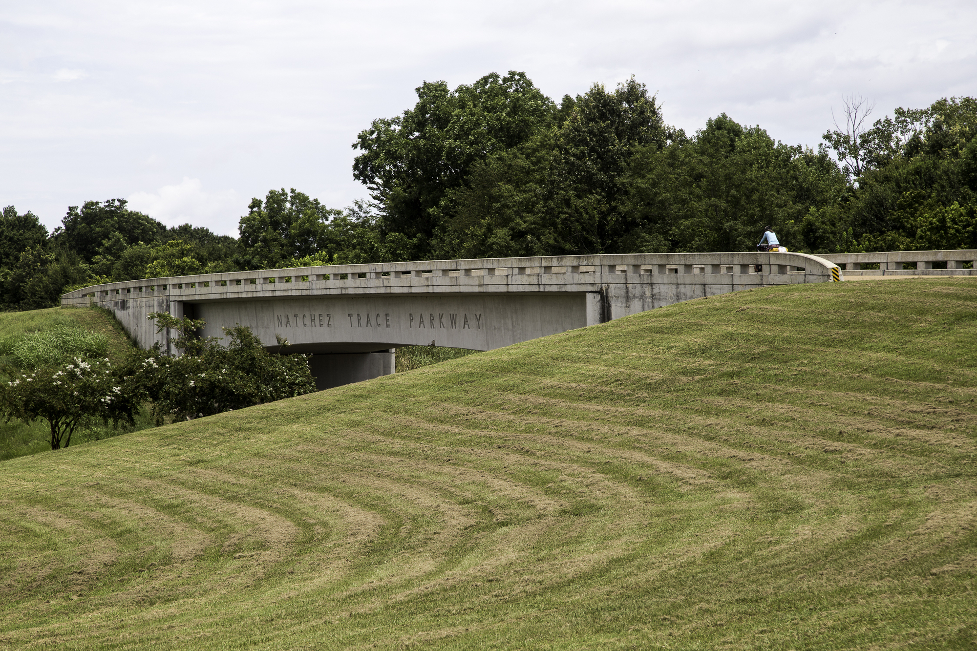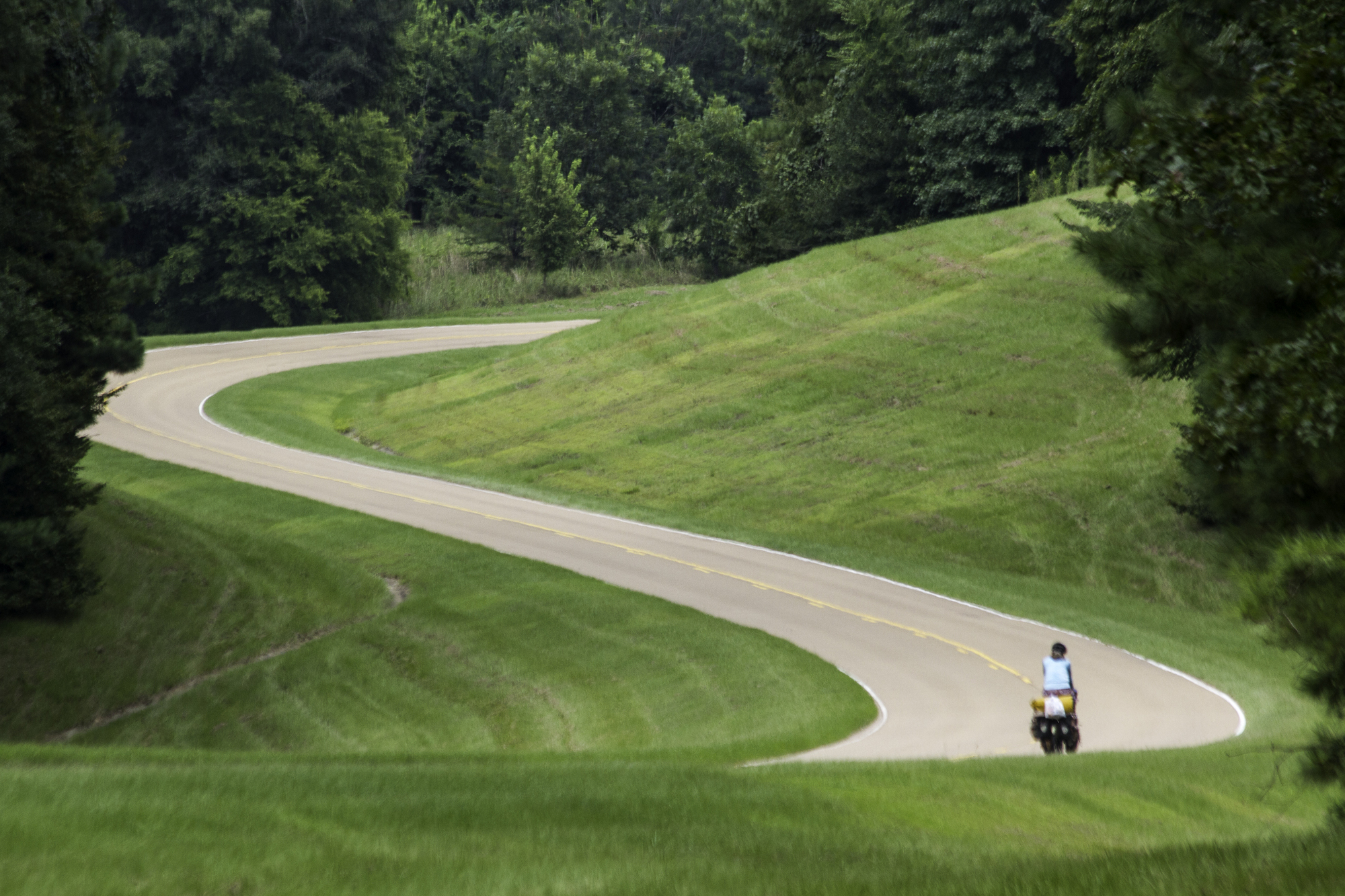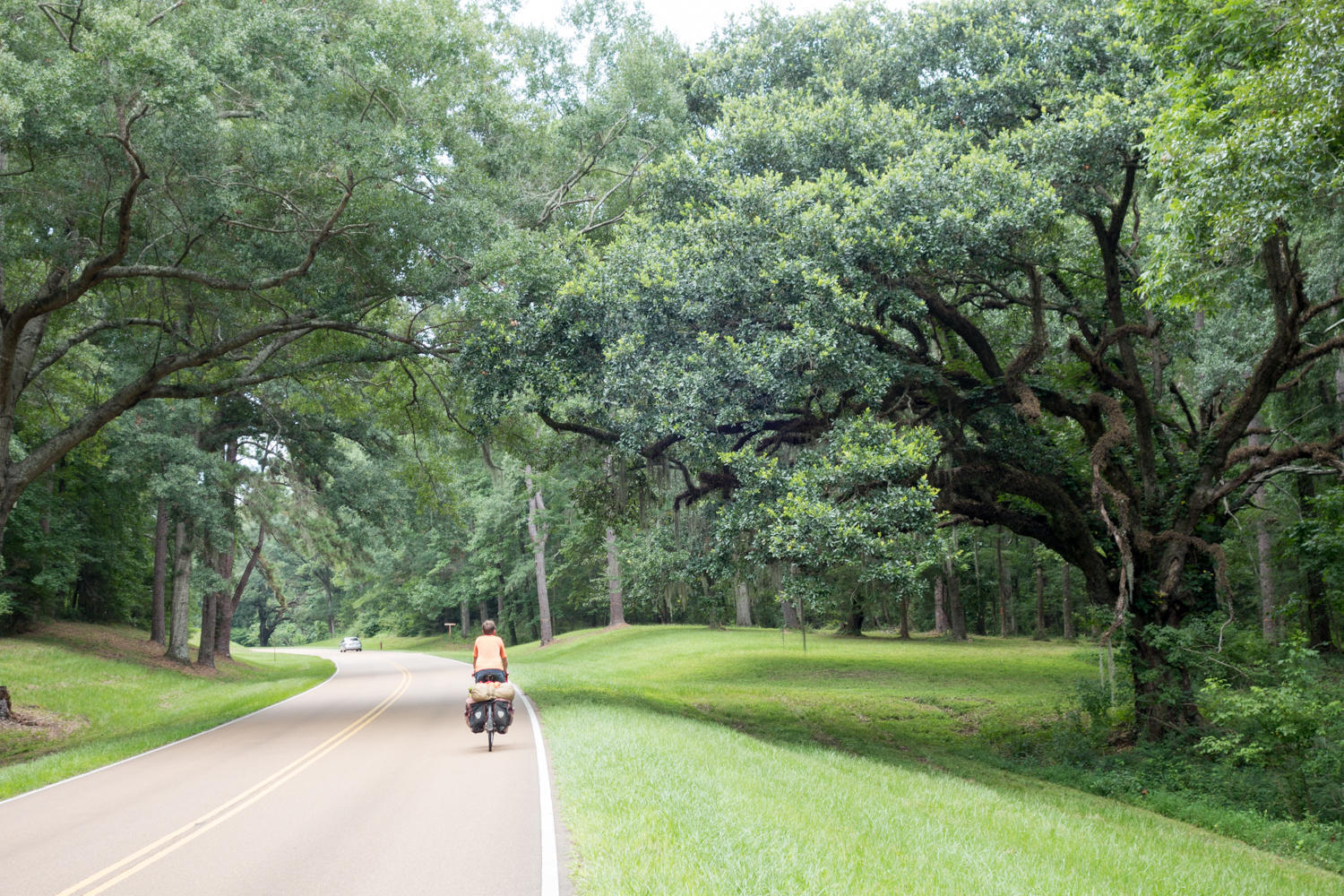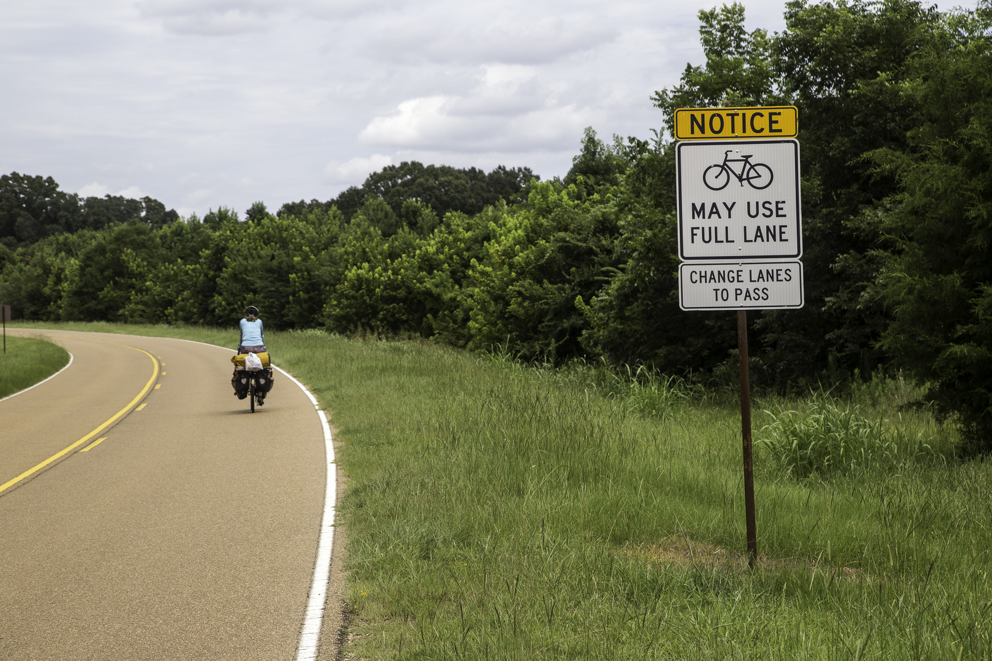 Beautiful Natchez Trace Parkway. The speed limit is 50, but cyclists have the right to use the whole lane, and traffic is advised to pass in the other lane.