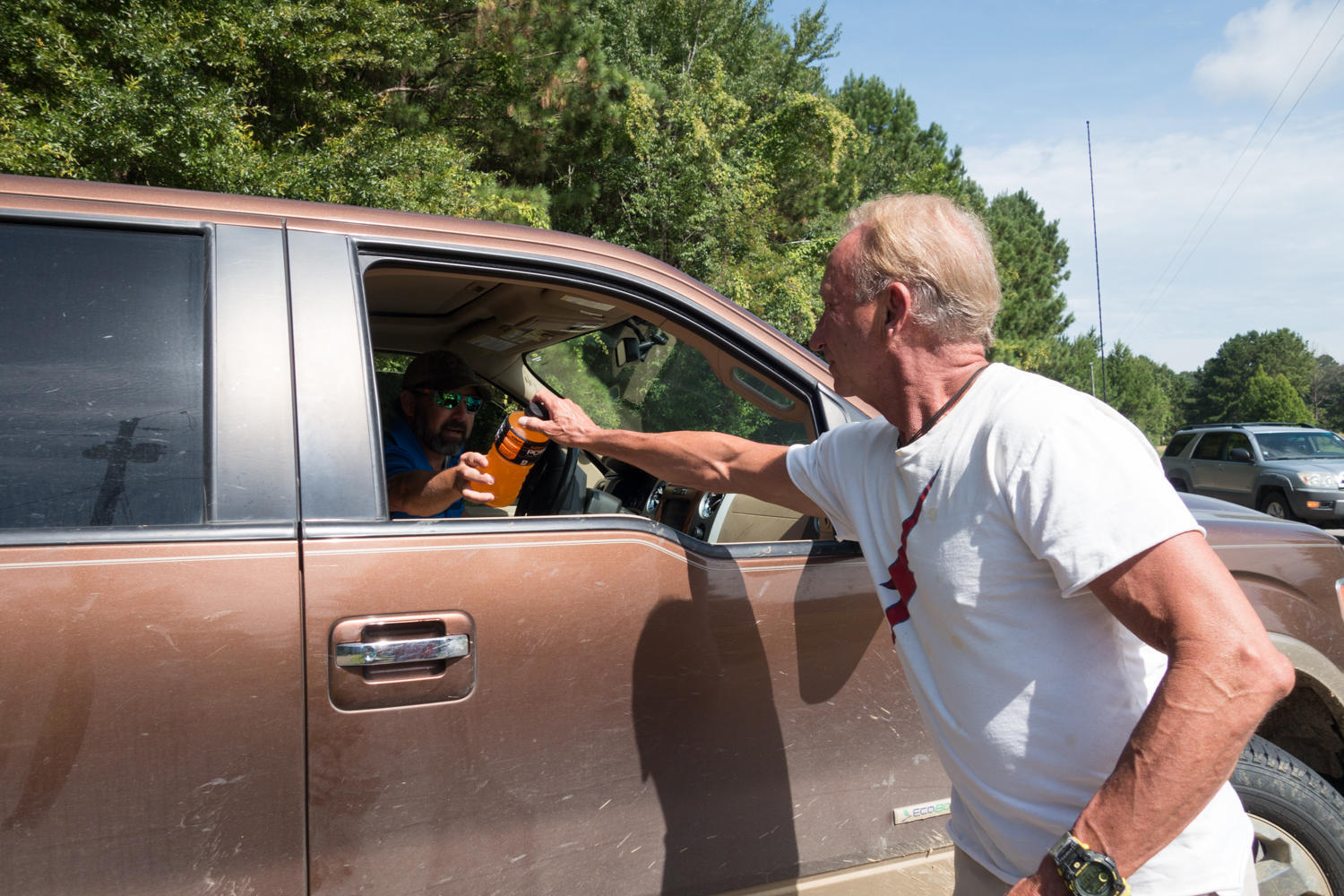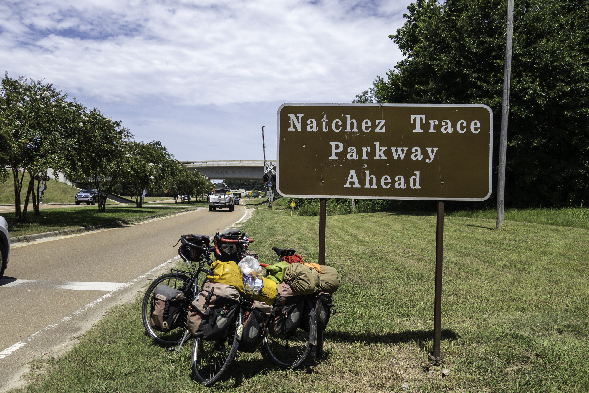 We had hoped for a second breakfast, but the towns listed on the map have only churches. Churches have a yellow road sign announcing one is coming up. We had stopped to take a photo when a car also stopped and then a truck pulls up. The truck driver was a “road angel” giving us a large cold Gatorade drink. The car driver, Brent, is a cyclist and knows Natchez. He shares some advice about asking to camp at the Natchez “Under the Hill bar”. Our plan is to head onto the Trace for a bit today though.