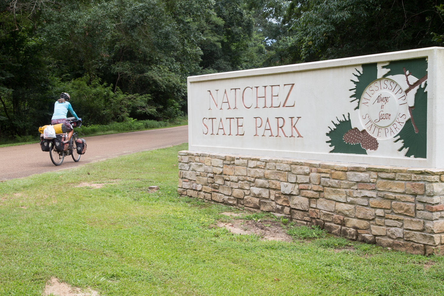 Our first goal in reaching Natchez is to go to the National Historic Park, one of the few still complete plantations, but not really to see the site, but for Rachel to get a Lifetime Senior Pass to parks before the price increases August 1 from $10 to $80. From here, we cycle to Walmart for shopping. There is not much along the Trace, so we need to have enough supplies for a couple of days between towns.