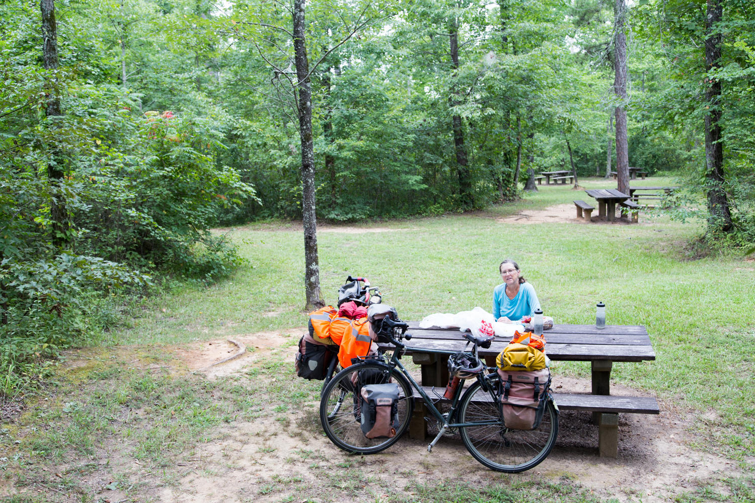 Well, the Natchez RV Park does take tent campers; in fact, there is a nice covered picnic area where the host tells us to camp and right next to a nice lawn. There is a bathroom in the reception building, a fridge with ice and a book exchange that is perfectly timed for us. The only disappointment is that there is no WiFi. We’ll just keep our journal up-to-date on our netbook and upload everything when we can, just like we did in Mongolia.