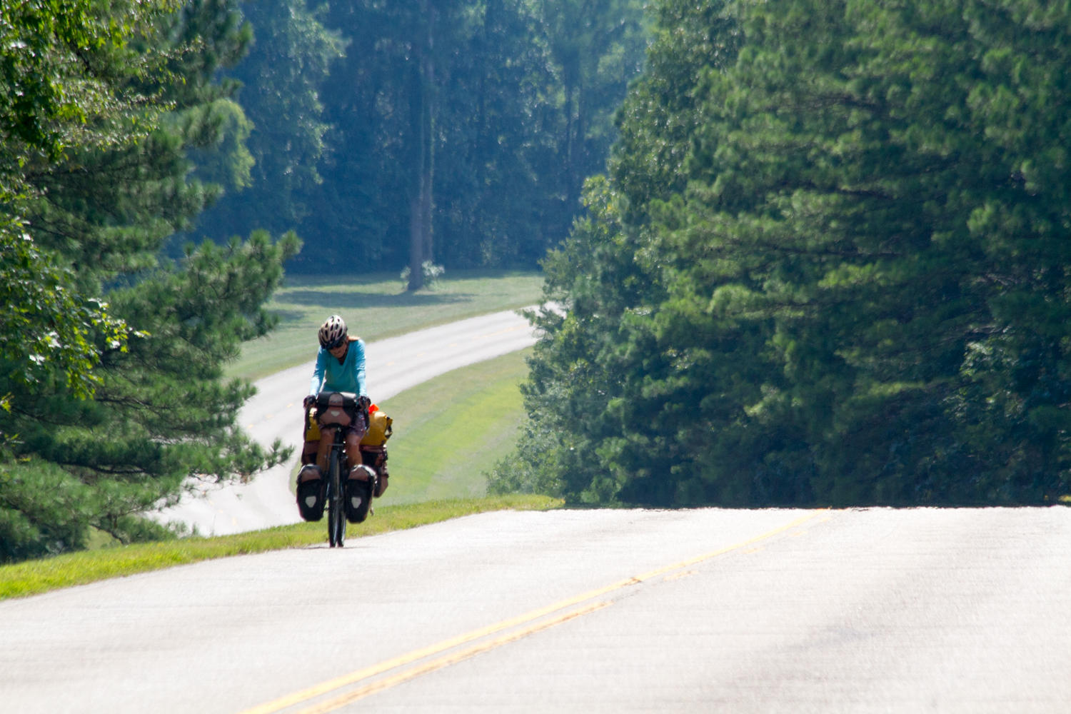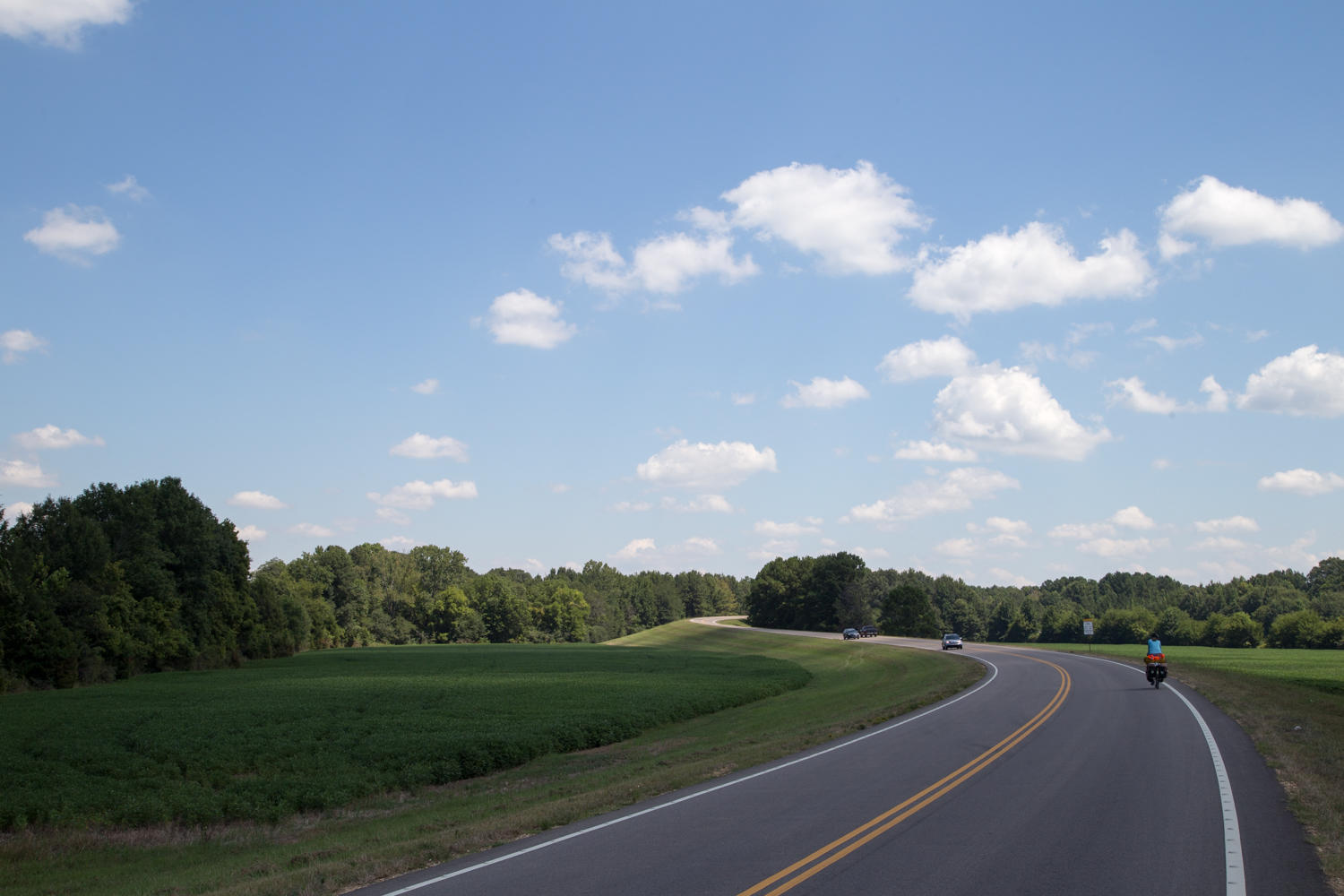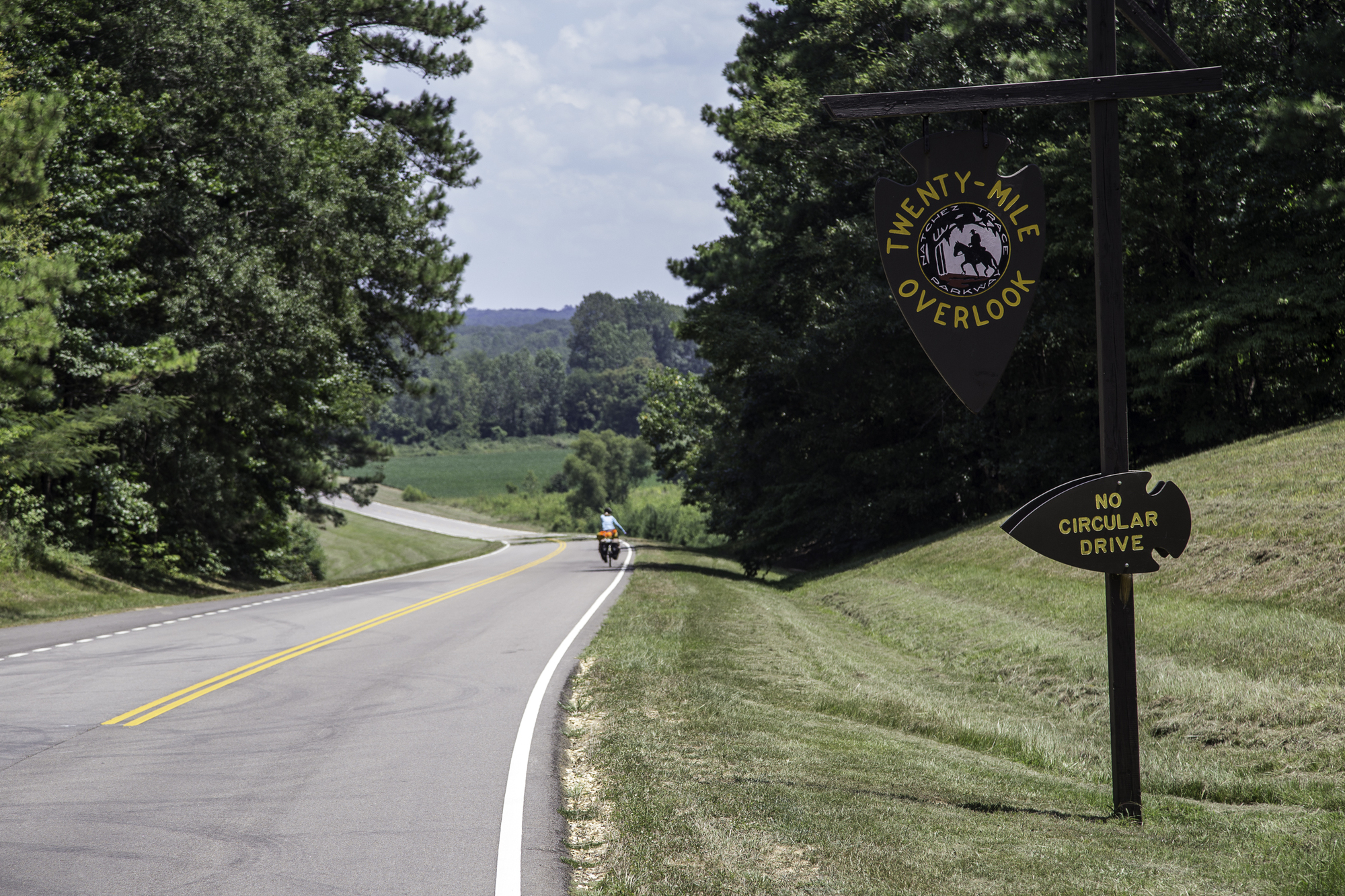 From the visitor center we leave the Trace and ride about a mile to a long-stretched shopping area. There is a McDonald's: food and WiFi. Rachel hikes across the huge parking lot to go shopping at Walmart, while Patrick takes advantage of the internet to upload the last four days to the journal. We shop for three days of cycling and two evening dinners. Panniers full again, we top off the fuel bottle with a whole 35 cents of gasoline, and head back for the Trace. We still have about 40 miles to go today, and as we were warned, the roads get hillier again. It remains a beautiful ride, at one point we see a huge field with three Indian Mounds, ancient burial places and stop at the picnic area for lunch.