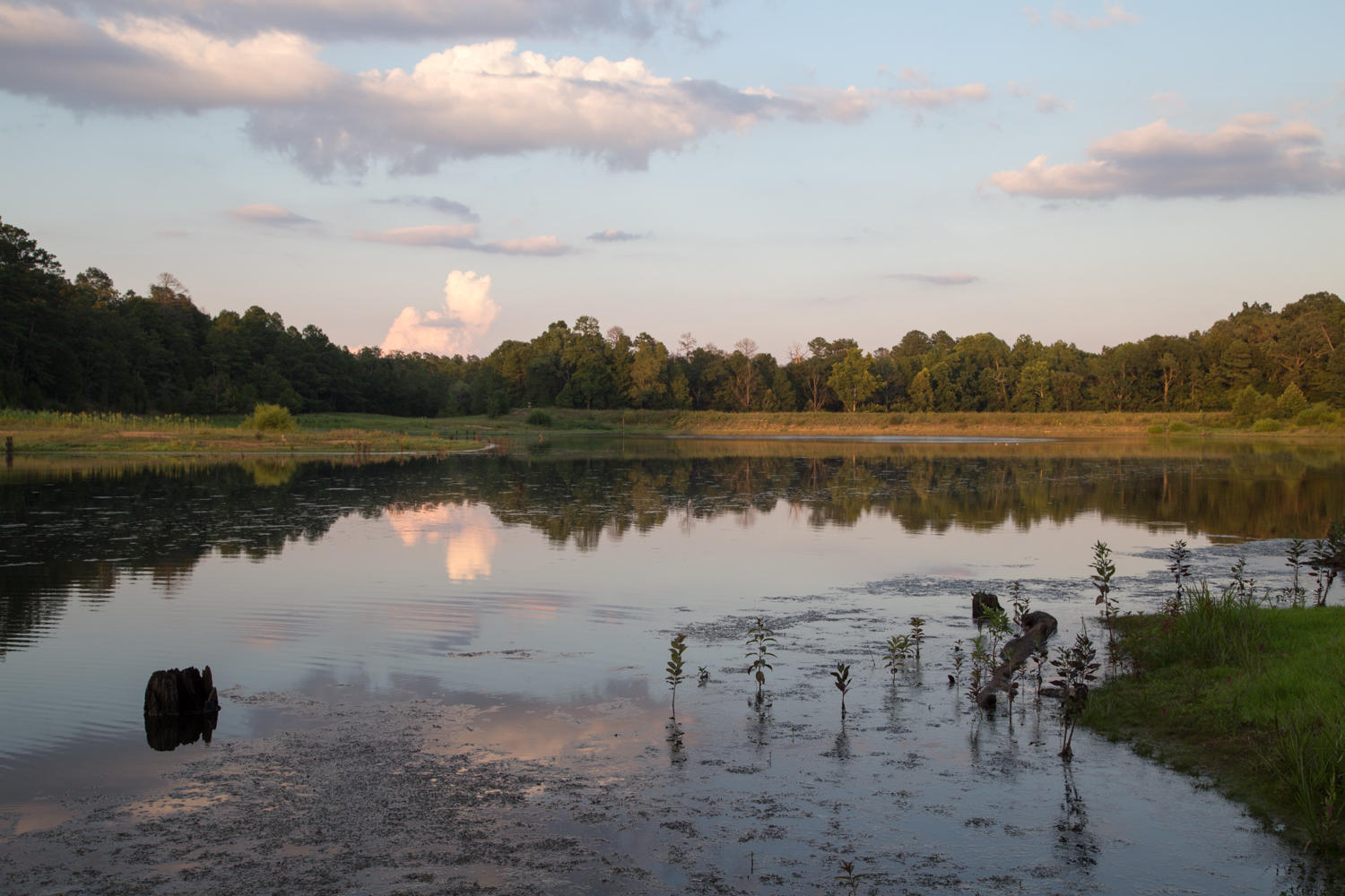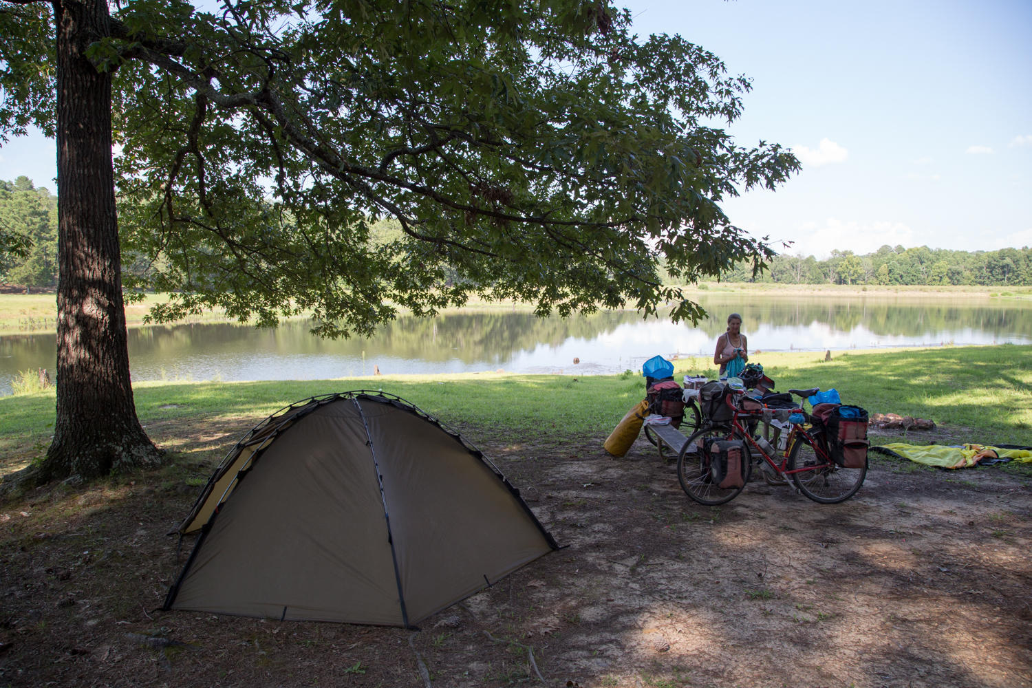 Tishomingo is a nice State Park, just a little off the Trace. All camping on the Trace is free, but this is 14 dollars with Rachel’s senior citizen discount. For that though we get a nice site on the lake and hot showers in an air-conditioned bathhouse. We are camped on a small man-made lake and watch the geese and cranes for the afternoon.