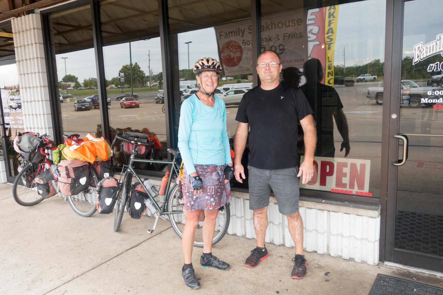 With Tim the owner of the Family Steakhouse in Potosi. He is interested in our trip and refunds us our money for breakfast. What a nice gesture. We tell him we will pay it forward.